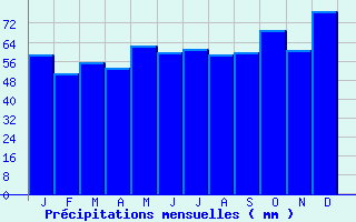 | Jan | Fev | Mars | Avr | Mai | Juin | Juil | Aout | Sept | Oct | Nov | Dec | Année | | Temp. max. (°C) | 5.9 | 7.4 | 11.7 | 15.4 | 19.7 | 22.9 | 25.9 | 25.5 | 21.1 | 16.2 | 9.8 | 6.3 | 15.7 | | Temp. moy. (°C) | 2.9 | 3.6 | 6.8 | 9.6 | 13.8 | 16.6 | 19.1 | 18.8 | 15.2 | 11.5 | 6.4 | 3.5 | 10.7 | | Temp. min. (°C) | -0.1 | -0.3 | 1.9 | 3.8 | 7.9 | 10.4 | 12.3 | 12 | 9.3 | 6.8 | 3 | 0.8 | 5.7 | | Jan | Fev | Mars | Avr | Mai | Juin | Juil | Aout | Sept | Oct | Nov | Dec | Année | | Jours Tx > 30°C | 0 | 0 | 0 | 0 | 0.3 | 1.9 | 6 | 4.9 | 0.5 | 0 | 0 | 0 | 13.6 | | Jours Tx > 25°C | 0 | 0 | 0 | 1.1 | 4.6 | 10.2 | 17.5 | 15.7 | 5.6 | 0.7 | 0 | 0 | 55.4 | | Jours Tx < 0°C | 3.2 | 1.9 | 0 | 0 | 0 | 0 | 0 | 0 | 0 | 0 | 0.5 | 1.8 | 7.3 | | Jours Tn < 0°C | 15.1 | 14.9 | 11.6 | 6.1 | 0.4 | 0 | 0 | 0 | 0.1 | 2.5 | 8.4 | 13.4 | 72.4 | | Jours Tn < -5°C | 4.7 | 4.1 | 1 | 0 | 0 | 0 | 0 | 0 | 0 | 0.1 | 1.4 | 3 | 14.4 | | Jours Tn < -10°C | 1.4 | 0.9 | 0 | 0 | 0 | 0 | 0 | 0 | 0 | 0 | 0.1 | 0.6 | 3 | | | | Jan | Fev | Mars | Avr | Mai | Juin | Juil | Aout | Sept | Oct | Nov | Dec | Année | | RR mensuel (mm) | 58.8 | 50.6 | 55.2 | 53.2 | 62.6 | 59.8 | 61.2 | 58.7 | 59.6 | 69.1 | 60.6 | 77.1 | 726.5 | | Jan | Fev | Mars | Avr | Mai | Juin | Juil | Aout | Sept | Oct | Nov | Dec | Année | | Jours RR > 1mm | 11.9 | 10.1 | 11.4 | 9.8 | 10.7 | 9.8 | 8.7 | 8.2 | 8.8 | 11 | 12 | 12.6 | 125 | | Jours RR > 5mm | 3.9 | 3.5 | 4 | 4.1 | 4.4 | 4.3 | 3.7 | 3.9 | 4.2 | 4.6 | 4.3 | 5.8 | 50.7 | | Jours RR > 10mm | 1.3 | 0.9 | 1.1 | 1.3 | 1.7 | 1.9 | 1.9 | 1.9 | 1.7 | 2.2 | 1.5 | 2.1 | 19.5 | | | | Jan | Fev | Mars | Avr | Mai | Juin | Juil | Aout | Sept | Oct | Nov | Dec | Année | | Vent moyen (km/h) | 9.4 | 9.4 | 9.4 | 9 | 7.9 | 6.8 | 6.8 | 6.5 | 6.8 | 7.2 | 7.9 | 9.4 | 7.9 | | Jan | Fev | Mars | Avr | Mai | Juin | Juil | Aout | Sept | Oct | Nov | Dec | Année | | Jours rafales >= 58km/h | 3.6 | 2.7 | 2.6 | 1.5 | 1 | 1.2 | 1.1 | 0.9 | 0.6 | 1.2 | 1.3 | 2.6 | 20.2 | | Jours rafales >= 100km/h | 0.1 | 0.3 | 0 | 0 | 0.1 | 0.1 | 0.1 | 0.2 | 0 | 0 | 0 | 0.1 | 0.8 |