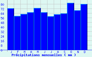 | Jan | Fev | Mars | Avr | Mai | Juin | Juil | Aout | Sept | Oct | Nov | Dec | Année | | Temp. max. (°C) | 6 | 7.4 | 11.4 | 14.7 | 19 | 22.5 | 25.3 | 25 | 20.3 | 15.5 | 9.5 | 6 | 15.3 | | Temp. moy. (°C) | 3.3 | 4 | 7 | 9.4 | 13.5 | 16.7 | 19.2 | 19 | 15.2 | 11.5 | 6.6 | 3.5 | 10.8 | | Temp. min. (°C) | 0.5 | 0.6 | 2.6 | 4.2 | 8.1 | 11 | 13.1 | 13 | 10.1 | 7.5 | 3.7 | 1.1 | 6.3 | | Jan | Fev | Mars | Avr | Mai | Juin | Juil | Aout | Sept | Oct | Nov | Dec | Année | | Jours Tx > 30°C | 0 | 0 | 0 | 0 | 0.1 | 1.8 | 4.8 | 5 | 0.2 | 0 | 0 | 0 | 11.8 | | Jours Tx > 25°C | 0 | 0 | 0 | 0.5 | 3.4 | 9 | 16.2 | 14.7 | 4 | 0.3 | 0 | 0 | 48 | | Jours Tx < 0°C | 3.8 | 1.9 | 0.1 | 0 | 0 | 0 | 0 | 0 | 0 | 0 | 0.5 | 2.8 | 9 | | Jours Tn < 0°C | 13.7 | 12.6 | 9.2 | 5.1 | 0.5 | 0 | 0 | 0 | 0.1 | 2 | 6.6 | 13.4 | 62.9 | | Jours Tn < -5°C | 4 | 3 | 1 | 0.2 | 0 | 0 | 0 | 0 | 0 | 0.1 | 1 | 2.3 | 11.4 | | Jours Tn < -10°C | 0.8 | 0.5 | 0.1 | 0 | 0 | 0 | 0 | 0 | 0 | 0 | 0.1 | 0.3 | 1.7 | | | | Jan | Fev | Mars | Avr | Mai | Juin | Juil | Aout | Sept | Oct | Nov | Dec | Année | | RR mensuel (mm) | 72.4 | 58.8 | 62.4 | 65.5 | 72.8 | 65.4 | 58.3 | 62.2 | 63.7 | 82.2 | 69.2 | 79.9 | 812.8 | | Jan | Fev | Mars | Avr | Mai | Juin | Juil | Aout | Sept | Oct | Nov | Dec | Année | | Jours RR > 1mm | 12.2 | 10.5 | 11.4 | 10.4 | 11.4 | 9.9 | 8 | 7.9 | 8.8 | 11.2 | 11.6 | 12.9 | 126.1 | | Jours RR > 5mm | 5 | 4.1 | 4.5 | 4.9 | 5 | 4.7 | 3.9 | 3.5 | 4.3 | 5.4 | 4.9 | 6 | 56.3 | | Jours RR > 10mm | 2 | 1.3 | 1.3 | 1.9 | 2 | 1.8 | 1.9 | 1.8 | 1.7 | 2.3 | 1.9 | 2.3 | 22.3 | | | | Jan | Fev | Mars | Avr | Mai | Juin | Juil | Aout | Sept | Oct | Nov | Dec | Année | | Vent moyen (km/h) | 10.8 | 10.8 | 10.4 | 9.4 | 8.3 | 7.6 | 8.3 | 7.9 | 7.9 | 9.4 | 10.4 | 10.8 | 9.4 | | Jan | Fev | Mars | Avr | Mai | Juin | Juil | Aout | Sept | Oct | Nov | Dec | Année | | Jours rafales >= 58km/h | 3.9 | 3.8 | 3.4 | 1.8 | -- | -- | 1.8 | 1.2 | 0.9 | 1.6 | 2.4 | 3.2 | -- | | Jours rafales >= 100km/h | 0.1 | 0.2 | 0 | 0 | -- | -- | 0 | 0.1 | 0 | 0 | 0 | 0.2 | -- |