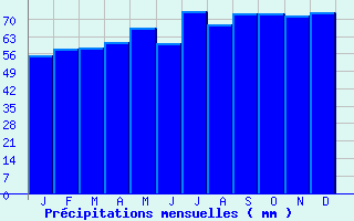 | Jan | Fev | Mars | Avr | Mai | Juin | Juil | Aout | Sept | Oct | Nov | Dec | Année | | Temp. max. (°C) | 6.6 | 8.2 | 12 | 15.7 | 20.1 | 23.2 | 25.5 | 25.1 | 20.6 | 16.2 | 10.1 | 6.6 | 15.9 | | Temp. moy. (°C) | 3.4 | 4.4 | 7.1 | 9.9 | 14.3 | 17.3 | 19.4 | 19 | 15 | 11.6 | 6.8 | 3.8 | 11 | | Temp. min. (°C) | 0.2 | 0.6 | 2.2 | 4.2 | 8.5 | 11.3 | 13.4 | 12.9 | 9.5 | 7 | 3.4 | 1 | 6.2 | | Jan | Fev | Mars | Avr | Mai | Juin | Juil | Aout | Sept | Oct | Nov | Dec | Année | | Jours Tx > 30°C | 0 | 0 | 0 | 0 | 0.4 | 2.2 | 5.7 | 5.1 | 0.5 | 0 | 0 | 0 | 13.9 | | Jours Tx > 25°C | 0 | 0 | 0 | 1.1 | 5.2 | 10.7 | 16.1 | 14.3 | 4.4 | 0.5 | 0 | 0 | 52.2 | | Jours Tx < 0°C | 2.6 | 0.6 | 0 | 0 | 0 | 0 | 0 | 0 | 0 | 0 | 0.4 | 2 | 5.6 | | Jours Tn < 0°C | 14.8 | 13.7 | 11.1 | 5.3 | 0.2 | 0 | 0 | 0 | 0.1 | 2.8 | 7.6 | 13.8 | 69.4 | | Jours Tn < -5°C | 5.1 | 2.9 | 1.4 | 0.2 | 0 | 0 | 0 | 0 | 0 | 0.2 | 1.4 | 3.5 | 14.8 | | Jours Tn < -10°C | 1.3 | 0.3 | 0.1 | 0 | 0 | 0 | 0 | 0 | 0 | 0 | 0.3 | 0.7 | 2.6 | | | | Jan | Fev | Mars | Avr | Mai | Juin | Juil | Aout | Sept | Oct | Nov | Dec | Année | | RR mensuel (mm) | 55.4 | 57.8 | 58.3 | 60.8 | 66.2 | 60.3 | 73.3 | 67.9 | 72.4 | 72.2 | 71.4 | 72.8 | 788.8 | | Jan | Fev | Mars | Avr | Mai | Juin | Juil | Aout | Sept | Oct | Nov | Dec | Année | | Jours RR > 1mm | 11.6 | 10.8 | 11 | 10.4 | 10 | 9.6 | 10 | 8.8 | 10.1 | 10.8 | 12.3 | 12.7 | 127.9 | | Jours RR > 5mm | 4.3 | 3.8 | 4.5 | 4.6 | 4.1 | 3.9 | 5.3 | 4.2 | 4.7 | 5 | 4.8 | 5.5 | 54.7 | | Jours RR > 10mm | 0.7 | 1.2 | 1.4 | 1.6 | 2.1 | 1.4 | 2.7 | 2.3 | 2.4 | 2 | 2 | 1.9 | 21.5 | | | | Jan | Fev | Mars | Avr | Mai | Juin | Juil | Aout | Sept | Oct | Nov | Dec | Année | | Vent moyen (km/h) | 7.6 | 7.6 | 7.6 | 7.2 | 6.5 | 6.1 | 5.8 | 5 | 5.4 | 6.1 | 6.8 | 7.6 | 6.5 | | Jan | Fev | Mars | Avr | Mai | Juin | Juil | Aout | Sept | Oct | Nov | Dec | Année | | Jours rafales >= 58km/h | 2.8 | 2.2 | 1.4 | 1.3 | 0.4 | -- | -- | -- | 0.3 | -- | -- | 2.4 | -- | | Jours rafales >= 100km/h | 0 | 0 | 0 | 0 | 0 | -- | -- | -- | 0 | -- | -- | 0.1 | -- | | | | Jan | Fev | Mars | Avr | Mai | Juin | Juil | Aout | Sept | Oct | Nov | Dec | Année | | Ensoleillement (heures) | -- | 82 | 134 | 171.4 | 194.8 | -- | 225.8 | -- | 157.5 | 119.7 | 62.2 | 43.1 | -- |