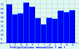 | Jan | Fev | Mars | Avr | Mai | Juin | Juil | Aout | Sept | Oct | Nov | Dec | Année | | Temp. max. (°C) | 9.4 | 10.5 | 13.8 | 16.3 | 20.3 | 24.5 | 27.8 | 27.6 | 24 | 18.8 | 13.1 | 10 | 18 | | Temp. moy. (°C) | 6.1 | 6.9 | 9.7 | 11.8 | 15.6 | 19.5 | 22.3 | 22.2 | 18.9 | 14.8 | 9.7 | 6.8 | 13.7 | | Temp. min. (°C) | 2.9 | 3.4 | 5.6 | 7.4 | 10.9 | 14.5 | 16.8 | 16.8 | 13.9 | 10.8 | 6.3 | 3.6 | 9.4 | | Jan | Fev | Mars | Avr | Mai | Juin | Juil | Aout | Sept | Oct | Nov | Dec | Année | | Jours Tx > 30°C | 0 | 0 | 0 | 0 | 0.4 | 3.9 | 10.5 | 9.5 | 1.8 | 0 | 0 | 0 | 26.1 | | Jours Tx > 25°C | 0 | 0 | 0.1 | 0.9 | 4.8 | 14.2 | 22.4 | 22.4 | 13.2 | 1.7 | 0 | 0 | 79.7 | | Jours Tx < 0°C | 1 | 0.5 | 0.1 | 0 | 0 | 0 | 0 | 0 | 0 | 0 | 0 | 0.3 | 2 | | Jours Tn < 0°C | 6.5 | 5.1 | 1.5 | 0.1 | 0 | 0 | 0 | 0 | 0 | 0 | 1.7 | 5.4 | 20.4 | | Jours Tn < -5°C | 1.1 | 0.3 | 0.1 | 0 | 0 | 0 | 0 | 0 | 0 | 0 | 0 | 0.5 | 2.1 | | Jours Tn < -10°C | 0.3 | 0 | 0 | 0 | 0 | 0 | 0 | 0 | 0 | 0 | 0 | 0 | 0.3 | | | | Jan | Fev | Mars | Avr | Mai | Juin | Juil | Aout | Sept | Oct | Nov | Dec | Année | | RR mensuel (mm) | 71.3 | 52.8 | 54.9 | 74.9 | 66.9 | 46.1 | 34.1 | 46.7 | 44.8 | 59.6 | 57 | 60.4 | 669.5 | | Jan | Fev | Mars | Avr | Mai | Juin | Juil | Aout | Sept | Oct | Nov | Dec | Année | | Jours RR > 1mm | 9.7 | 8.6 | 8.6 | 9.7 | 8.7 | 6.2 | 4.6 | 5.7 | 5.9 | 8.3 | 8.8 | 8.7 | 93.4 | | Jours RR > 5mm | 4.4 | 3.5 | 3.4 | 5.1 | 3.9 | 2.9 | 2 | 2.8 | 2.6 | 3.4 | 3.5 | 3.9 | 41.3 | | Jours RR > 10mm | 1.6 | 1.4 | 1.5 | 2.3 | 2 | 1.2 | 1 | 1.5 | 1.3 | 1.6 | 1.4 | 1.4 | 18.4 | | | | Jan | Fev | Mars | Avr | Mai | Juin | Juil | Aout | Sept | Oct | Nov | Dec | Année | | Vent moyen (km/h) | 13.7 | 14.8 | 15.5 | 15.8 | 13.7 | 13 | 13 | 12.2 | 12.2 | 12.6 | 13 | 13.3 | 13.7 | | Jan | Fev | Mars | Avr | Mai | Juin | Juil | Aout | Sept | Oct | Nov | Dec | Année | | Jours rafales >= 58km/h | -- | 7.1 | -- | 8.9 | 4.5 | 2.5 | 3.6 | -- | 2.8 | 3.7 | 5.5 | -- | -- | | Jours rafales >= 100km/h | -- | 0.1 | -- | 0.1 | 0 | 0 | 0 | -- | 0 | 0 | 0.1 | -- | -- |