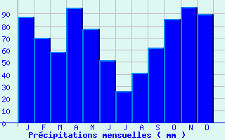 | Jan | Fev | Mars | Avr | Mai | Juin | Juil | Aout | Sept | Oct | Nov | Dec | Année | | Temp. max. (°C) | 9.9 | 11.2 | 14.4 | 16.8 | 20.7 | 25 | 28 | 28.2 | 23.7 | 18.7 | 13.4 | 10.3 | 18.4 | | Temp. moy. (°C) | 6.6 | 7.4 | 10.1 | 12.2 | 16 | 19.9 | 22.5 | 22.7 | 18.8 | 14.9 | 10 | 7.1 | 14.1 | | Temp. min. (°C) | 3.4 | 3.7 | 5.9 | 7.7 | 11.4 | 14.9 | 17.1 | 17.2 | 13.9 | 11.1 | 6.6 | 4 | 9.8 | | Jan | Fev | Mars | Avr | Mai | Juin | Juil | Aout | Sept | Oct | Nov | Dec | Année | | Jours Tx > 30°C | 0 | 0 | 0 | 0 | 0.7 | 4.1 | 10.8 | 9.9 | 1 | 0 | 0 | 0 | 26.4 | | Jours Tx > 25°C | 0 | 0 | 0.1 | 1.1 | 5.2 | 16.4 | 23.3 | 24.4 | 11.7 | 1.4 | 0 | 0 | 83.4 | | Jours Tx < 0°C | 0.5 | 0.2 | 0.1 | 0 | 0 | 0 | 0 | 0 | 0 | 0 | 0 | 0.3 | 1.1 | | Jours Tn < 0°C | 6.3 | 4.7 | 1.9 | 0.1 | 0 | 0 | 0 | 0 | 0 | 0.1 | 1.6 | 5.1 | 19.8 | | Jours Tn < -5°C | 0.4 | 0.3 | 0.1 | 0 | 0 | 0 | 0 | 0 | 0 | 0 | 0.1 | 0.4 | 1.3 | | Jours Tn < -10°C | 0 | 0 | 0 | 0 | 0 | 0 | 0 | 0 | 0 | 0 | 0 | 0 | 0 | | | | Jan | Fev | Mars | Avr | Mai | Juin | Juil | Aout | Sept | Oct | Nov | Dec | Année | | RR mensuel (mm) | 87.5 | 69.9 | 58.5 | 94.7 | 77.5 | 51.2 | 26 | 41 | 61.6 | 85.3 | 95.7 | 89.5 | 838.4 | | Jan | Fev | Mars | Avr | Mai | Juin | Juil | Aout | Sept | Oct | Nov | Dec | Année | | Jours RR > 1mm | 10.3 | 8.4 | 8.5 | 10.2 | 7.8 | 5.4 | 4.1 | 5.1 | 6.6 | 8.5 | 9.8 | 9.6 | 94.2 | | Jours RR > 5mm | 5.1 | 3.9 | 3.6 | 5.5 | 4.2 | 2.7 | 1.6 | 2.5 | 2.9 | 3.9 | 4.6 | 4.7 | 45 | | Jours RR > 10mm | 2.3 | 1.8 | 1.7 | 2.8 | 2.7 | 1.5 | 0.6 | 1.3 | 1.8 | 2.1 | 1.9 | 2.5 | 22.9 | | | | Jan | Fev | Mars | Avr | Mai | Juin | Juil | Aout | Sept | Oct | Nov | Dec | Année | | Vent moyen (km/h) | 19.1 | 20.2 | 21.2 | 20.9 | 18.4 | 18 | 18 | 16.9 | 16.2 | 15.8 | 18.7 | 18.4 | 18.4 | | Jan | Fev | Mars | Avr | Mai | Juin | Juil | Aout | Sept | Oct | Nov | Dec | Année | | Jours rafales >= 58km/h | 15.1 | 14.4 | 16.1 | 15.4 | 11.9 | -- | 10.6 | 9.8 | 9.5 | 10.4 | -- | -- | -- | | Jours rafales >= 100km/h | 0.9 | 0.9 | 0.5 | 0.4 | 0.1 | -- | 0.1 | 0.1 | 0.1 | 0.1 | -- | -- | -- |