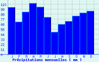 | Jan | Fev | Mars | Avr | Mai | Juin | Juil | Aout | Sept | Oct | Nov | Dec | Année | | Temp. max. (°C) | 7.1 | 7.4 | 9.8 | 11.6 | 15.5 | 19.4 | 22.6 | 22.6 | 19.4 | 15.5 | 10.5 | 8 | 14.2 | | Temp. moy. (°C) | 2.9 | 3.1 | 5.4 | 7.1 | 10.9 | 14.7 | 17.4 | 17.4 | 14.4 | 10.9 | 6.2 | 3.8 | 9.6 | | Temp. min. (°C) | -1.3 | -1.2 | 1 | 2.7 | 6.3 | 9.9 | 12.1 | 12.3 | 9.4 | 6.2 | 1.9 | -0.3 | 5 | | Jan | Fev | Mars | Avr | Mai | Juin | Juil | Aout | Sept | Oct | Nov | Dec | Année | | Jours Tx > 30°C | 0 | 0 | 0 | 0 | 0 | 0.4 | 2.5 | 2.8 | 0.2 | 0 | 0 | 0 | 5.9 | | Jours Tx > 25°C | 0 | 0 | 0 | 0 | 0.9 | 5 | 11.6 | 10.9 | 4 | 0.7 | 0 | 0 | 33.2 | | Jours Tx < 0°C | 2.7 | 2.8 | 1.2 | 0.3 | 0 | 0 | 0 | 0 | 0 | 0 | 0.6 | 1.6 | 9.3 | | Jours Tn < 0°C | 19.3 | 17.7 | 12.5 | 6 | 1.4 | 0 | 0 | 0 | 0 | 1.1 | 8.5 | 16.7 | 83.3 | | Jours Tn < -5°C | 4.8 | 5 | 1.6 | 0.1 | 0 | 0 | 0 | 0 | 0 | 0 | 1.2 | 3.6 | 16.4 | | Jours Tn < -10°C | 0.9 | 0.4 | 0.1 | 0 | 0 | 0 | 0 | 0 | 0 | 0 | 0 | 0.3 | 1.6 | | | | Jan | Fev | Mars | Avr | Mai | Juin | Juil | Aout | Sept | Oct | Nov | Dec | Année | | RR mensuel (mm) | 102.6 | 70.8 | 92.5 | 112.1 | 103.4 | 81.1 | 48.7 | 65.7 | 72.2 | 84.1 | 90.9 | 94.5 | 1018.6 | | Jan | Fev | Mars | Avr | Mai | Juin | Juil | Aout | Sept | Oct | Nov | Dec | Année | | Jours RR > 1mm | 11.1 | 10 | 10.8 | 11.7 | 12.2 | 9.2 | 6.9 | 8.4 | 8.1 | 9.9 | 10.7 | 10.6 | 119.5 | | Jours RR > 5mm | 6.3 | 4.8 | 6.3 | 6.7 | 6 | 4.7 | 3.2 | 3.6 | 4.2 | 4.9 | 5.6 | 5.6 | 61.9 | | Jours RR > 10mm | 3.5 | 2.1 | 3 | 4.2 | 3.6 | 2.6 | 1.5 | 2 | 2.3 | 2.2 | 2.7 | 3 | 32.8 | | | | Jan | Fev | Mars | Avr | Mai | Juin | Juil | Aout | Sept | Oct | Nov | Dec | Année | | Vent moyen (km/h) | 11.9 | 12.6 | 12.2 | 11.5 | 9.7 | 9.4 | 9.4 | 9.4 | 9.7 | 9.4 | 11.2 | 11.9 | 10.8 | | Jan | Fev | Mars | Avr | Mai | Juin | Juil | Aout | Sept | Oct | Nov | Dec | Année | | Jours rafales >= 58km/h | -- | 5.1 | 4.6 | 3.5 | 1.4 | 0.7 | 0.9 | 1.2 | -- | 1.9 | -- | -- | -- | | Jours rafales >= 100km/h | -- | 0.2 | 0.1 | 0 | 0 | 0 | 0 | 0 | -- | 0 | -- | -- | -- |