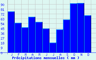 | Jan | Fev | Mars | Avr | Mai | Juin | Juil | Aout | Sept | Oct | Nov | Dec | Année | | Temp. max. (°C) | 11 | 12.4 | 15.8 | 18.3 | 22.4 | 26.8 | 29.7 | 29.6 | 24.9 | 20 | 14.5 | 11.2 | 19.8 | | Temp. moy. (°C) | 7.4 | 8.2 | 11.1 | 13.4 | 17.3 | 21.3 | 23.9 | 23.8 | 19.7 | 15.9 | 10.8 | 7.8 | 15.1 | | Temp. min. (°C) | 3.7 | 4 | 6.4 | 8.4 | 12.2 | 15.7 | 18 | 18 | 14.5 | 11.8 | 7.1 | 4.3 | 10.4 | | Jan | Fev | Mars | Avr | Mai | Juin | Juil | Aout | Sept | Oct | Nov | Dec | Année | | Jours Tx > 30°C | 0 | 0 | 0 | 0.1 | 1.2 | 6.8 | 15 | 13.6 | 1.8 | 0.2 | 0 | 0 | 38.5 | | Jours Tx > 25°C | 0 | 0.1 | 0.4 | 2.2 | 7.7 | 20.3 | 28 | 28.3 | 15.1 | 2 | 0 | 0 | 104 | | Jours Tx < 0°C | 0.1 | 0.1 | 0 | 0 | 0 | 0 | 0 | 0 | 0 | 0 | 0 | 0 | 0.1 | | Jours Tn < 0°C | 5.5 | 4.5 | 1.5 | 0.1 | 0 | 0 | 0 | 0 | 0 | 0.1 | 1.5 | 4.6 | 17.8 | | Jours Tn < -5°C | 0.2 | 0.2 | 0.1 | 0 | 0 | 0 | 0 | 0 | 0 | 0 | 0.1 | 0.5 | 1 | | Jours Tn < -10°C | 0 | 0 | 0 | 0 | 0 | 0 | 0 | 0 | 0 | 0 | 0 | 0 | 0 | | | | Jan | Fev | Mars | Avr | Mai | Juin | Juil | Aout | Sept | Oct | Nov | Dec | Année | | RR mensuel (mm) | 76.8 | 55 | 47.1 | 66.7 | 56.8 | 44.6 | 18.3 | 43 | 61.3 | 91.5 | 92.6 | 69.2 | 722.9 | | Jan | Fev | Mars | Avr | Mai | Juin | Juil | Aout | Sept | Oct | Nov | Dec | Année | | Jours RR > 1mm | 7.5 | 5.8 | 6.3 | 7.4 | 6.5 | 3.7 | 2.6 | 4.5 | 5.2 | 6.3 | 6.3 | 6.7 | 68.7 | | Jours RR > 5mm | 3 | 2.5 | 2.5 | 3.6 | 3.1 | 2.3 | 0.9 | 2.2 | 2.4 | 3.3 | 2.7 | 2.9 | 31.2 | | Jours RR > 10mm | 1.9 | 1.5 | 1.4 | 2.2 | 1.7 | 1.3 | 0.5 | 1.5 | 1.3 | 2.4 | 1.8 | 2 | 19.2 | | | | Jan | Fev | Mars | Avr | Mai | Juin | Juil | Aout | Sept | Oct | Nov | Dec | Année | | Vent moyen (km/h) | 22 | 23 | 23.8 | 23.8 | 20.5 | 20.5 | 20.9 | 19.1 | 18 | 18.4 | 21.6 | 20.9 | 20.9 | | Jan | Fev | Mars | Avr | Mai | Juin | Juil | Aout | Sept | Oct | Nov | Dec | Année | | Jours rafales >= 58km/h | 14.6 | 14.4 | 16.4 | 15.5 | 11.1 | 12.1 | 13.2 | 10.8 | 9.6 | 10.7 | -- | -- | -- | | Jours rafales >= 100km/h | 0.8 | 0.8 | 0.6 | 0.5 | 0.4 | 0 | 0.1 | 0.1 | 0.1 | 0.2 | -- | -- | -- |