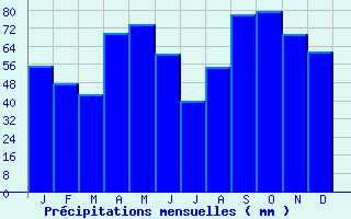 | Jan | Fev | Mars | Avr | Mai | Juin | Juil | Aout | Sept | Oct | Nov | Dec | Année | | Temp. max. (°C) | 6.1 | 7.3 | 10.8 | 13.5 | 17.7 | 21.9 | 25.5 | 25.1 | 20.7 | 15.5 | 9.7 | 6.9 | 15.1 | | Temp. moy. (°C) | 3.2 | 3.9 | 6.7 | 9.1 | 13.1 | 16.9 | 19.9 | 19.6 | 15.9 | 11.9 | 6.7 | 4 | 10.9 | | Temp. min. (°C) | 0.2 | 0.4 | 2.6 | 4.7 | 8.6 | 11.9 | 14.3 | 14.1 | 11.1 | 8.3 | 3.6 | 1.1 | 6.8 | | Jan | Fev | Mars | Avr | Mai | Juin | Juil | Aout | Sept | Oct | Nov | Dec | Année | | Jours Tx > 30°C | 0 | 0 | 0 | 0 | 0 | 1.2 | 5 | 4.5 | 0.4 | 0 | 0 | 0 | 11.2 | | Jours Tx > 25°C | 0 | 0 | 0 | 0.1 | 1.8 | 9.2 | 17.9 | 15.5 | 5.2 | 0.2 | 0 | 0 | 50 | | Jours Tx < 0°C | 2.6 | 1.7 | 0.2 | 0 | 0 | 0 | 0 | 0 | 0 | 0 | 0.4 | 1.6 | 6.6 | | Jours Tn < 0°C | 13 | 12.1 | 7.6 | 1.7 | 0.1 | 0 | 0 | 0 | 0 | 0.4 | 5.9 | 11.8 | 52.7 | | Jours Tn < -5°C | 3.3 | 3.1 | 0.5 | 0 | 0 | 0 | 0 | 0 | 0 | 0 | 0.8 | 2.8 | 10.5 | | Jours Tn < -10°C | 0.9 | 0.1 | 0 | 0 | 0 | 0 | 0 | 0 | 0 | 0 | 0 | 0.2 | 1.3 | | | | Jan | Fev | Mars | Avr | Mai | Juin | Juil | Aout | Sept | Oct | Nov | Dec | Année | | RR mensuel (mm) | 55.4 | 47.4 | 42.5 | 69.9 | 73.4 | 60.5 | 39.7 | 54.8 | 77.7 | 79.6 | 69.1 | 61.6 | 731.6 | | Jan | Fev | Mars | Avr | Mai | Juin | Juil | Aout | Sept | Oct | Nov | Dec | Année | | Jours RR > 1mm | 8.7 | 7.7 | 8.1 | 9.6 | 8.8 | 6.8 | 4.7 | 6 | 6.8 | 9.1 | 9.4 | 8.8 | 94.5 | | Jours RR > 5mm | 3.6 | 3.3 | 2.7 | 4.1 | 4.5 | 3.3 | 2.4 | 3.1 | 4.1 | 4.4 | 3.8 | 3.5 | 42.8 | | Jours RR > 10mm | 1.7 | 1.2 | 1.1 | 2.1 | 2.4 | 1.9 | 1.3 | 1.7 | 2.3 | 2.6 | 1.9 | 1.7 | 21.9 | | | | Jan | Fev | Mars | Avr | Mai | Juin | Juil | Aout | Sept | Oct | Nov | Dec | Année | | Vent moyen (km/h) | 17.3 | 18 | 20.2 | 20.5 | 18 | 17.3 | 16.9 | 15.5 | 15.8 | 16.9 | 17.6 | 17.3 | 17.6 | | Jan | Fev | Mars | Avr | Mai | Juin | Juil | Aout | Sept | Oct | Nov | Dec | Année | | Jours rafales >= 58km/h | 13 | 11.7 | 14.3 | 15.4 | 10.6 | 8.7 | 9.2 | 7.4 | 7.8 | 10.3 | 11.1 | 11.6 | 131.2 | | Jours rafales >= 100km/h | 1.1 | 1 | 0.7 | 0.9 | 0.3 | 0 | 0 | 0 | 0.3 | 0.8 | 1 | 1.3 | 7.4 | | | | Jan | Fev | Mars | Avr | Mai | Juin | Juil | Aout | Sept | Oct | Nov | Dec | Année | | Ensoleillement (heures) | 100.3 | 126.9 | 173 | 183.4 | 217.6 | 262.1 | 296 | 260.9 | 207.7 | 132.1 | 99.6 | 98.1 | 2157.6 |