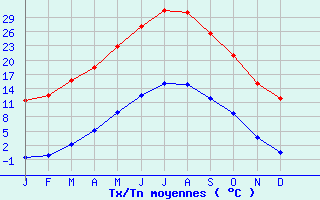 | Jan | Fev | Mars | Avr | Mai | Juin | Juil | Aout | Sept | Oct | Nov | Dec | Année | | Temp. max. (°C) | 11.5 | 12.6 | 15.8 | 18.5 | 22.9 | 27.2 | 30.6 | 30.1 | 25.6 | 20.9 | 15.1 | 11.9 | 20.3 | | Temp. moy. (°C) | 5.4 | 6.2 | 9 | 11.8 | 15.9 | 19.9 | 22.8 | 22.4 | 18.7 | 14.8 | 9.4 | 6.2 | 13.6 | | Temp. min. (°C) | -0.6 | -0.2 | 2.1 | 5.1 | 9 | 12.5 | 15 | 14.8 | 11.8 | 8.7 | 3.7 | 0.5 | 6.9 | | Jan | Fev | Mars | Avr | Mai | Juin | Juil | Aout | Sept | Oct | Nov | Dec | Année | | Jours Tx > 30°C | 0 | 0 | 0 | 0 | 0.7 | 7.3 | 19.3 | 16.9 | 2.5 | 0 | 0 | 0 | 46.7 | | Jours Tx > 25°C | 0 | 0 | 0 | 1 | 9.3 | 21.9 | 29.4 | 29 | 17.8 | 3.6 | 0 | 0 | 112.1 | | Jours Tx < 0°C | 0.4 | 0.1 | 0 | 0 | 0 | 0 | 0 | 0 | 0 | 0 | 0 | 0 | 0.5 | | Jours Tn < 0°C | 17.9 | 15.3 | 11.2 | 2.3 | 0.1 | 0 | 0 | 0 | 0 | 1.1 | 8.1 | 15.9 | 71.8 | | Jours Tn < -5°C | 7 | 4.9 | 1.5 | 0 | 0 | 0 | 0 | 0 | 0 | 0 | 1.3 | 5.3 | 20 | | Jours Tn < -10°C | 0.6 | 0.3 | 0.1 | 0 | 0 | 0 | 0 | 0 | 0 | 0 | 0 | 0.2 | 1.2 | | | | Jan | Fev | Mars | Avr | Mai | Juin | Juil | Aout | Sept | Oct | Nov | Dec | Année | | RR mensuel (mm) | 50.4 | 35 | 34.3 | 55.5 | 49.2 | 28.4 | 11.5 | 35 | 87.5 | 75.3 | 60.9 | 53.4 | 576.4 | | Jan | Fev | Mars | Avr | Mai | Juin | Juil | Aout | Sept | Oct | Nov | Dec | Année | | Jours RR > 1mm | 5.8 | 4.4 | 4.4 | 6.8 | 5.3 | 3.6 | 1.7 | 3.1 | 4.7 | 6.6 | 6.6 | 5.7 | 58.7 | | Jours RR > 5mm | 2.8 | 2.3 | 2 | 3.3 | 2.9 | 1.5 | 0.6 | 1.6 | 3.2 | 3.8 | 3.3 | 2.5 | 29.8 | | Jours RR > 10mm | 1.3 | 1.1 | 1 | 1.8 | 1.5 | 0.9 | 0.3 | 1.1 | 2.4 | 2.3 | 2 | 1.5 | 17.3 | | | | Jan | Fev | Mars | Avr | Mai | Juin | Juil | Aout | Sept | Oct | Nov | Dec | Année | | Vent moyen (km/h) | 7.9 | 9.4 | 9.7 | 10.8 | 9 | 9.4 | 9.7 | 8.6 | 7.9 | 7.9 | 8.3 | 7.6 | 9 | | Jan | Fev | Mars | Avr | Mai | Juin | Juil | Aout | Sept | Oct | Nov | Dec | Année | | Jours rafales >= 58km/h | 5.4 | 5.6 | 6.2 | 6.3 | 4.4 | 4 | 4.8 | 4 | 3.8 | 4.3 | 5.1 | 4.7 | 58.8 | | Jours rafales >= 100km/h | 0.1 | 0.1 | 0.1 | 0.1 | 0 | 0 | 0 | 0 | 0 | 0 | 0.1 | 0.1 | 0.6 |