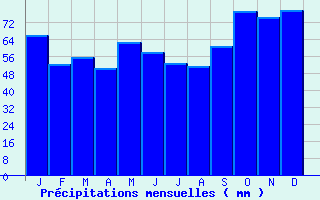 | Jan | Fev | Mars | Avr | Mai | Juin | Juil | Aout | Sept | Oct | Nov | Dec | Année | | Temp. max. (°C) | 8 | 8.6 | 11.5 | 13.6 | 17.1 | 20.1 | 22.6 | 22.8 | 20.1 | 16.1 | 11.5 | 8.3 | 15.1 | | Temp. moy. (°C) | 5.3 | 5.5 | 7.8 | 9.5 | 12.8 | 15.6 | 17.8 | 18 | 15.6 | 12.4 | 8.4 | 5.7 | 11.2 | | Temp. min. (°C) | 2.6 | 2.4 | 4.2 | 5.3 | 8.5 | 11 | 13.1 | 13.2 | 11.1 | 8.7 | 5.3 | 3 | 7.4 | | Jan | Fev | Mars | Avr | Mai | Juin | Juil | Aout | Sept | Oct | Nov | Dec | Année | | Jours Tx > 30°C | 0 | 0 | 0 | 0 | 0 | 0.6 | 1.2 | 1.3 | 0.3 | 0 | 0 | 0 | 3.5 | | Jours Tx > 25°C | 0 | 0 | 0 | 0.1 | 1.3 | 3.4 | 7.4 | 7.1 | 2.9 | 0.4 | 0 | 0 | 22.6 | | Jours Tx < 0°C | 1.3 | 0.5 | 0 | 0 | 0 | 0 | 0 | 0 | 0 | 0 | 0.1 | 0.3 | 2.2 | | Jours Tn < 0°C | 7.9 | 7.9 | 3.9 | 1.2 | 0 | 0 | 0 | 0 | 0 | 0.5 | 3.2 | 7.5 | 32.1 | | Jours Tn < -5°C | 1.9 | 1.1 | 0.1 | 0 | 0 | 0 | 0 | 0 | 0 | 0 | 0.3 | 1 | 4.4 | | Jours Tn < -10°C | 0.3 | 0.1 | 0 | 0 | 0 | 0 | 0 | 0 | 0 | 0 | 0 | 0 | 0.4 | | | | Jan | Fev | Mars | Avr | Mai | Juin | Juil | Aout | Sept | Oct | Nov | Dec | Année | | RR mensuel (mm) | 66.1 | 52.4 | 55.6 | 50.4 | 62.6 | 57.9 | 52.6 | 51.2 | 60.8 | 77.6 | 74.6 | 78.1 | 739.9 | | Jan | Fev | Mars | Avr | Mai | Juin | Juil | Aout | Sept | Oct | Nov | Dec | Année | | Jours RR > 1mm | 12 | 10.7 | 10.8 | 10.3 | 10.2 | 8.2 | 8 | 7.6 | 9.5 | 12.1 | 12.7 | 13.6 | 125.7 | | Jours RR > 5mm | 4.9 | 3.7 | 3.7 | 3.8 | 4.4 | 3.7 | 3 | 2.9 | 4.2 | 5.3 | 4.9 | 5.5 | 50.1 | | Jours RR > 10mm | 1.6 | 1.1 | 1.4 | 1.1 | 2.1 | 1.7 | 1.2 | 1.3 | 1.9 | 2.3 | 2.1 | 2 | 19.7 | | | | Jan | Fev | Mars | Avr | Mai | Juin | Juil | Aout | Sept | Oct | Nov | Dec | Année | | Vent moyen (km/h) | 20.2 | 18.7 | 18.4 | 16.6 | 15.1 | 14 | 14.4 | 14.4 | 14.8 | 16.6 | 17.3 | 18.4 | 16.6 | | Jan | Fev | Mars | Avr | Mai | Juin | Juil | Aout | Sept | Oct | Nov | Dec | Année | | Jours rafales >= 58km/h | 10.2 | 7.8 | 8 | 6 | 4.4 | 2.8 | 3 | 3 | 4.1 | 6.6 | 6.9 | 8.1 | 70.9 | | Jours rafales >= 100km/h | 0.7 | 0.7 | 0.2 | 0.1 | 0 | 0.1 | 0 | 0 | 0 | 0.2 | 0.2 | 0.4 | 2.6 | | | | Jan | Fev | Mars | Avr | Mai | Juin | Juil | Aout | Sept | Oct | Nov | Dec | Année | | Jours avec brouillard (*) | 3.5 | 3.9 | 3.5 | 3.7 | 3.9 | 3.1 | 3.3 | 4 | 3.4 | 3.6 | 3.8 | 4.7 | 44.4 | | Jours avec orage (*) | 0.4 | 0.2 | 0.4 | 1.1 | 2.6 | 2 | 2.6 | 2.1 | 1.1 | 0.9 | 0.4 | 0.6 | 14.3 | | Jours avec grêle (*) | 0.4 | 0.2 | 0.3 | 0.5 | 0.1 | 0.3 | 0 | 0.1 | 0.1 | 0.1 | 0.3 | 0.3 | 2.8 | | Jours avec neige (*) | 3 | 3.9 | 1.4 | 0.7 | 0 | 0 | 0 | 0 | 0 | 0.1 | 0.9 | 2.6 | 12.6 | | | | Jan | Fev | Mars | Avr | Mai | Juin | Juil | Aout | Sept | Oct | Nov | Dec | Année | | Ensoleillement (heures) | 69.6 | 84.3 | 125.6 | 167.3 | 193.7 | 213.5 | 207.1 | 204.4 | 167.2 | 117.8 | 79.4 | 61.4 | 1691.2 |