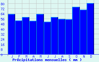 | Jan | Fev | Mars | Avr | Mai | Juin | Juil | Aout | Sept | Oct | Nov | Dec | Année | | Temp. max. (°C) | 7.1 | 8.7 | 11.5 | 14.5 | 18 | 21.3 | 23.2 | 23.4 | 20.6 | 15.9 | 11 | 7.4 | 15.2 | | Temp. moy. (°C) | 4.6 | 5.7 | 7.8 | 10.1 | 13.5 | 16.4 | 18.2 | 18.5 | 16 | 12.4 | 8.2 | 4.9 | 11.4 | | Temp. min. (°C) | 2.1 | 2.8 | 4.2 | 5.7 | 8.9 | 11.5 | 13.2 | 13.6 | 11.4 | 9 | 5.4 | 2.4 | 7.5 | | Jan | Fev | Mars | Avr | Mai | Juin | Juil | Aout | Sept | Oct | Nov | Dec | Année | | Jours Tx > 30°C | 0 | 0 | 0 | 0 | 0 | 0.9 | 2.1 | 2.2 | 0.5 | 0 | 0 | 0 | 5.8 | | Jours Tx > 25°C | 0 | 0 | 0 | 0.2 | 1.9 | 4.6 | 8.6 | 8.9 | 3.4 | 0.1 | 0 | 0 | 27.6 | | Jours Tx < 0°C | 1.6 | 0.3 | 0 | 0 | 0 | 0 | 0 | 0 | 0 | 0 | 0.1 | 0.8 | 2.8 | | Jours Tn < 0°C | 9.4 | 6.9 | 3.4 | 1 | 0 | 0 | 0 | 0 | 0 | 0.7 | 2.6 | 9.3 | 33.2 | | Jours Tn < -5°C | 2.4 | 0.4 | 0.1 | 0 | 0 | 0 | 0 | 0 | 0 | 0 | 0.4 | 1.1 | 4.4 | | Jours Tn < -10°C | 0.1 | 0 | 0 | 0 | 0 | 0 | 0 | 0 | 0 | 0 | 0 | 0 | 0.1 | | | | Jan | Fev | Mars | Avr | Mai | Juin | Juil | Aout | Sept | Oct | Nov | Dec | Année | | RR mensuel (mm) | 63.1 | 52.7 | 58.4 | 52.6 | 63.2 | 50.9 | 58.5 | 55.2 | 54.9 | 74.2 | 70 | 80.5 | 734.2 | | Jan | Fev | Mars | Avr | Mai | Juin | Juil | Aout | Sept | Oct | Nov | Dec | Année | | Jours RR > 1mm | 12.1 | 10.6 | 10.6 | 10.3 | 9.8 | 8.3 | 9.2 | 8.8 | 8.4 | 11.6 | 14 | 13.8 | 127.4 | | Jours RR > 5mm | 4.3 | 3.6 | 4.1 | 3.5 | 4.6 | 3.5 | 3.9 | 3.4 | 3.6 | 5.5 | 4.7 | 5.6 | 50.3 | | Jours RR > 10mm | 1.6 | 1 | 1.3 | 1.2 | 2.2 | 1.4 | 1.9 | 1.1 | 1.8 | 1.9 | 1.6 | 2.4 | 19.5 | | | | Jan | Fev | Mars | Avr | Mai | Juin | Juil | Aout | Sept | Oct | Nov | Dec | Année | | Vent moyen (km/h) | -- | 15.1 | 14 | 13.3 | 11.9 | 11.2 | 11.5 | 11.2 | 11.5 | 13.3 | 14 | 14.8 | -- | | Jan | Fev | Mars | Avr | Mai | Juin | Juil | Aout | Sept | Oct | Nov | Dec | Année | | Jours rafales >= 58km/h | -- | 7.1 | 6.4 | 4.2 | 3.5 | 1.8 | -- | 2.2 | -- | -- | 6 | 6.9 | -- | | Jours rafales >= 100km/h | -- | 0 | 0 | 0 | 0.1 | 0 | -- | 0 | -- | -- | 0.1 | 0.2 | -- |