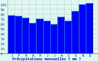 | Jan | Fev | Mars | Avr | Mai | Juin | Juil | Aout | Sept | Oct | Nov | Dec | Année | | Temp. max. (°C) | 7.2 | 8.3 | 10.9 | 13.6 | 16.8 | 20.1 | 21.7 | 22.1 | 19.4 | 15.5 | 10.8 | 7.3 | 14.5 | | Temp. moy. (°C) | 4.9 | 5.7 | 7.6 | 9.8 | 12.8 | 15.8 | 17.5 | 17.9 | 15.5 | 12.4 | 8.2 | 4.9 | 11.1 | | Temp. min. (°C) | 2.6 | 3 | 4.4 | 6 | 8.9 | 11.6 | 13.3 | 13.7 | 11.7 | 9.3 | 5.6 | 2.6 | 7.7 | | Jan | Fev | Mars | Avr | Mai | Juin | Juil | Aout | Sept | Oct | Nov | Dec | Année | | Jours Tx > 30°C | 0 | 0 | 0 | 0 | 0 | 0.5 | 0.5 | 0.7 | 0.1 | 0 | 0 | 0 | 1.8 | | Jours Tx > 25°C | 0 | 0 | 0 | 0 | 1 | 3 | 5.3 | 5.8 | 1.8 | 0 | 0 | 0 | 16.8 | | Jours Tx < 0°C | 1.5 | 0.4 | 0 | 0 | 0 | 0 | 0 | 0 | 0 | 0 | 0.1 | 0.9 | 2.9 | | Jours Tn < 0°C | 8.1 | 5.9 | 3.3 | 0.9 | 0 | 0 | 0 | 0 | 0 | 0.3 | 1.9 | 8.9 | 29.2 | | Jours Tn < -5°C | 1.6 | 0.2 | 0.1 | 0 | 0 | 0 | 0 | 0 | 0 | 0 | 0 | 0.8 | 2.7 | | Jours Tn < -10°C | 0.1 | 0 | 0 | 0 | 0 | 0 | 0 | 0 | 0 | 0 | 0 | 0 | 0.1 | | | | Jan | Fev | Mars | Avr | Mai | Juin | Juil | Aout | Sept | Oct | Nov | Dec | Année | | RR mensuel (mm) | 78 | 76.6 | 72.5 | 62.2 | 70.6 | 66.7 | 59.9 | 74.7 | 66.3 | 86.7 | 100.1 | 103 | 917.3 | | Jan | Fev | Mars | Avr | Mai | Juin | Juil | Aout | Sept | Oct | Nov | Dec | Année | | Jours RR > 1mm | 13.9 | 12.4 | 11.7 | 10.9 | 10.9 | 9.2 | 10.3 | 9.9 | 10.4 | 13.2 | 15.4 | 15.7 | 144.1 | | Jours RR > 5mm | 5.3 | 5.7 | 4.9 | 4.5 | 5.3 | 4.6 | 3.5 | 4.6 | 4.8 | 6 | 7.1 | 6.9 | 63.3 | | Jours RR > 10mm | 2.2 | 2.3 | 1.9 | 1.7 | 2.3 | 1.9 | 1.7 | 2.6 | 1.9 | 2.7 | 2.9 | 3.3 | 27.5 | | | | Jan | Fev | Mars | Avr | Mai | Juin | Juil | Aout | Sept | Oct | Nov | Dec | Année | | Vent moyen (km/h) | 14.8 | 14 | 12.6 | 11.2 | 10.8 | -- | 9.7 | 9 | 9.4 | 12.2 | 13.3 | 13.3 | -- | | Jan | Fev | Mars | Avr | Mai | Juin | Juil | Aout | Sept | Oct | Nov | Dec | Année | | Jours rafales >= 58km/h | -- | 7.3 | -- | 3.6 | 3.7 | -- | 1.3 | 1.5 | 1.8 | 4.6 | 6.7 | -- | -- | | Jours rafales >= 100km/h | -- | 0.1 | -- | 0 | 0.1 | -- | 0 | 0 | 0 | 0.1 | 0.1 | -- | -- |