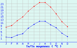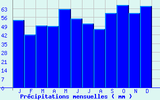| Jan | Fev | Mars | Avr | Mai | Juin | Juil | Aout | Sept | Oct | Nov | Dec | Année | | Temp. max. (°C) | 7.9 | 8.9 | 12 | 14.6 | 18.3 | 21.3 | 23.8 | 23.9 | 20.9 | 16.5 | 11.5 | 8.2 | 15.7 | | Temp. moy. (°C) | 4.7 | 5 | 7.4 | 9.2 | 12.8 | 15.5 | 17.8 | 17.8 | 15.1 | 12 | 7.8 | 5.1 | 10.9 | | Temp. min. (°C) | 1.5 | 1.2 | 2.8 | 3.7 | 7.2 | 9.8 | 11.8 | 11.7 | 9.4 | 7.6 | 4 | 1.9 | 6.1 | | Jan | Fev | Mars | Avr | Mai | Juin | Juil | Aout | Sept | Oct | Nov | Dec | Année | | Jours Tx > 30°C | 0 | 0 | 0 | 0 | 0 | 1 | 2.8 | 2.5 | 0.4 | 0 | 0 | 0 | 6.6 | | Jours Tx > 25°C | 0 | 0 | 0 | 0.4 | 2.5 | 5.3 | 11.1 | 10.2 | 4.1 | 0.4 | 0 | 0 | 34 | | Jours Tx < 0°C | 1.5 | 0.5 | 0 | 0 | 0 | 0 | 0 | 0 | 0 | 0 | 0.1 | 0.6 | 2.7 | | Jours Tn < 0°C | 11 | 11.7 | 9.2 | 5.8 | 0.9 | 0 | 0 | 0 | 0.1 | 2.1 | 6.3 | 11.5 | 58.7 | | Jours Tn < -5°C | 3.6 | 2.9 | 1.1 | 0.3 | 0 | 0 | 0 | 0 | 0 | 0.1 | 1.4 | 3 | 12.3 | | Jours Tn < -10°C | 0.7 | 0.2 | 0 | 0 | 0 | 0 | 0 | 0 | 0 | 0 | 0 | 0.3 | 1.2 | | | | Jan | Fev | Mars | Avr | Mai | Juin | Juil | Aout | Sept | Oct | Nov | Dec | Année | | RR mensuel (mm) | 53.8 | 42 | 49.3 | 49 | 62.4 | 54.8 | 51.1 | 46.6 | 59.4 | 65.9 | 59.2 | 65 | 658.5 | | Jan | Fev | Mars | Avr | Mai | Juin | Juil | Aout | Sept | Oct | Nov | Dec | Année | | Jours RR > 1mm | 11.4 | 9.8 | 10.4 | 9.8 | 9.8 | 8.1 | 8.6 | 7.3 | 8.7 | 10.6 | 11.5 | 12.3 | 118.4 | | Jours RR > 5mm | 3.6 | 2.8 | 3 | 3.4 | 3.9 | 3.4 | 3.1 | 3 | 4 | 4.4 | 4.1 | 4.6 | 43.3 | | Jours RR > 10mm | 1 | 0.6 | 1 | 1.1 | 2 | 1.5 | 1.4 | 1.3 | 1.8 | 1.8 | 1.1 | 1.6 | 16.1 | | | | Jan | Fev | Mars | Avr | Mai | Juin | Juil | Aout | Sept | Oct | Nov | Dec | Année | | Vent moyen (km/h) | 12.2 | 12.2 | 11.2 | 10.4 | 9 | 8.3 | 8.6 | 8.3 | 8.3 | 9.4 | 10.1 | 10.8 | 9.7 | | Jan | Fev | Mars | Avr | Mai | Juin | Juil | Aout | Sept | Oct | Nov | Dec | Année | | Jours rafales >= 58km/h | 5.3 | 4.8 | 4.2 | 3.1 | 1.4 | 0.6 | 1.3 | 1.1 | 1.2 | 2.1 | 2.7 | 4.1 | 31.9 | | Jours rafales >= 100km/h | 0 | 0.1 | 0 | 0 | 0.1 | 0 | 0 | 0 | 0 | 0 | 0 | 0.1 | 0.2 |