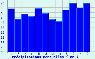 | Jan | Fev | Mars | Avr | Mai | Juin | Juil | Aout | Sept | Oct | Nov | Dec | Année | | Temp. max. (°C) | 7.7 | 9.2 | 11.9 | 14.7 | 18.1 | 21.2 | 23.4 | 23.7 | 21 | 16.3 | 11.5 | 8 | 15.6 | | Temp. moy. (°C) | 5 | 6.1 | 7.9 | 9.9 | 13.2 | 15.9 | 17.9 | 18.3 | 15.8 | 12.5 | 8.5 | 5.3 | 11.4 | | Temp. min. (°C) | 2.4 | 2.9 | 4 | 5.1 | 8.3 | 10.5 | 12.3 | 13 | 10.7 | 8.7 | 5.5 | 2.6 | 7.2 | | Jan | Fev | Mars | Avr | Mai | Juin | Juil | Aout | Sept | Oct | Nov | Dec | Année | | Jours Tx > 30°C | 0 | 0 | 0 | 0 | 0 | 0.7 | 1.6 | 2.4 | 0.4 | 0 | 0 | 0 | 5.1 | | Jours Tx > 25°C | 0 | 0 | 0 | 0.1 | 1.6 | 4.4 | 9.1 | 9.2 | 3.6 | 0.1 | 0 | 0 | 28.1 | | Jours Tx < 0°C | 1.2 | 0 | 0 | 0 | 0 | 0 | 0 | 0 | 0 | 0 | 0.1 | 0.4 | 1.8 | | Jours Tn < 0°C | 8.7 | 6.4 | 4.6 | 1.8 | 0.1 | 0 | 0 | 0 | 0 | 1.1 | 2.3 | 8.9 | 33.7 | | Jours Tn < -5°C | 2.3 | 0.4 | 0 | 0 | 0 | 0 | 0 | 0 | 0 | 0.1 | 0.2 | 1.3 | 4.2 | | Jours Tn < -10°C | 0.2 | 0 | 0 | 0 | 0 | 0 | 0 | 0 | 0 | 0 | 0 | 0.1 | 0.4 | | | | Jan | Fev | Mars | Avr | Mai | Juin | Juil | Aout | Sept | Oct | Nov | Dec | Année | | RR mensuel (mm) | 61.5 | 46.8 | 53.7 | 50.6 | 61.7 | 54.9 | 46.3 | 43.2 | 59.6 | 69.7 | 62.9 | 69.7 | 680.6 | | Jan | Fev | Mars | Avr | Mai | Juin | Juil | Aout | Sept | Oct | Nov | Dec | Année | | Jours RR > 1mm | 12.2 | 10.9 | 10.3 | 10.6 | 10.7 | 8.1 | 7.7 | 7.8 | 8.9 | 11.3 | 12.2 | 13.6 | 124.2 | | Jours RR > 5mm | 4.5 | 3.4 | 3.7 | 4 | 4 | 3.4 | 3 | 2.9 | 4.1 | 4.8 | 4.7 | 5.2 | 47.7 | | Jours RR > 10mm | 1.2 | 0.7 | 1.2 | 0.9 | 1.8 | 1.6 | 1.1 | 1.1 | 1.8 | 2 | 1.5 | 1.5 | 16.4 | | | | Jan | Fev | Mars | Avr | Mai | Juin | Juil | Aout | Sept | Oct | Nov | Dec | Année | | Vent moyen (km/h) | 18.7 | 17.3 | 16.6 | 14.8 | -- | 11.5 | 13 | 13.7 | 13.7 | 15.5 | 16.9 | 17.6 | -- | | Jan | Fev | Mars | Avr | Mai | Juin | Juil | Aout | Sept | Oct | Nov | Dec | Année | | Jours rafales >= 58km/h | 9.3 | 7.8 | 7.5 | 5.8 | -- | -- | -- | 2.9 | -- | 5.9 | -- | -- | -- | | Jours rafales >= 100km/h | 0.9 | 0.2 | 0.2 | 0 | -- | -- | -- | 0 | -- | 0.2 | -- | -- | -- |