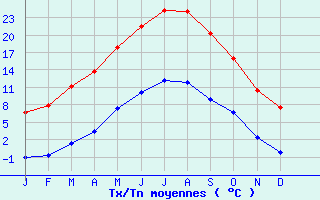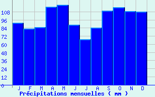 | Jan | Fev | Mars | Avr | Mai | Juin | Juil | Aout | Sept | Oct | Nov | Dec | Année | | Temp. max. (°C) | 6.7 | 7.9 | 11.2 | 13.7 | 17.8 | 21.5 | 24.3 | 24 | 20.3 | 16 | 10.4 | 7.5 | 15.1 | | Temp. moy. (°C) | 2.9 | 3.6 | 6.2 | 8.5 | 12.6 | 15.8 | 18.3 | 18 | 14.6 | 11.4 | 6.3 | 3.6 | 10.2 | | Temp. min. (°C) | -1 | -0.8 | 1.3 | 3.4 | 7.3 | 10.1 | 12.2 | 11.9 | 8.9 | 6.7 | 2.3 | -0.2 | 5.2 | | Jan | Fev | Mars | Avr | Mai | Juin | Juil | Aout | Sept | Oct | Nov | Dec | Année | | Jours Tx > 30°C | 0 | 0 | 0 | 0 | 0 | 1.1 | 3.2 | 3 | 0.3 | 0 | 0 | 0 | 7.6 | | Jours Tx > 25°C | 0 | 0 | 0 | 0.1 | 2 | 8.7 | 15 | 13.5 | 4.6 | 0.3 | 0 | 0 | 44.1 | | Jours Tx < 0°C | 2.3 | 1.5 | 0.2 | 0.1 | 0 | 0 | 0 | 0 | 0 | 0 | 0.4 | 1.3 | 5.7 | | Jours Tn < 0°C | 16.1 | 15 | 11.7 | 5.3 | 0.8 | 0 | 0 | 0 | 0.1 | 2.5 | 9.3 | 15.2 | 76 | | Jours Tn < -5°C | 5.6 | 5 | 2.1 | 0.2 | 0 | 0 | 0 | 0 | 0 | 0.2 | 2.4 | 5.4 | 20.9 | | Jours Tn < -10°C | 1.5 | 1 | 0.1 | 0 | 0 | 0 | 0 | 0 | 0 | 0 | 0.1 | 0.9 | 3.7 | | | | Jan | Fev | Mars | Avr | Mai | Juin | Juil | Aout | Sept | Oct | Nov | Dec | Année | | RR mensuel (mm) | 91.7 | 83.2 | 84.7 | 115.5 | 118.4 | 88.7 | 67.1 | 84.2 | 109.3 | 114.3 | 108.7 | 108.2 | 1174 | | Jan | Fev | Mars | Avr | Mai | Juin | Juil | Aout | Sept | Oct | Nov | Dec | Année | | Jours RR > 1mm | 12 | 10.6 | 11.1 | 12.1 | 12.7 | 9.7 | 8.1 | 9.5 | 8.8 | 11.4 | 12 | 11.8 | 130 | | Jours RR > 5mm | 6.5 | 5.8 | 6 | 7.1 | 7.3 | 5.5 | 3.7 | 4.5 | 5.5 | 6.9 | 7 | 7.3 | 73.1 | | Jours RR > 10mm | 3.2 | 2.8 | 3.2 | 3.9 | 4.5 | 2.8 | 2.1 | 2.6 | 3.8 | 4.2 | 3.9 | 4.1 | 41.1 | | | | Jan | Fev | Mars | Avr | Mai | Juin | Juil | Aout | Sept | Oct | Nov | Dec | Année | | Vent moyen (km/h) | 10.8 | 11.2 | 11.5 | 11.9 | 10.4 | 9.7 | 9.7 | 8.6 | 9.4 | 10.4 | 10.8 | 10.4 | 10.4 | | Jan | Fev | Mars | Avr | Mai | Juin | Juil | Aout | Sept | Oct | Nov | Dec | Année | | Jours rafales >= 58km/h | 3.8 | 4 | 3.8 | 4.3 | 2.5 | 1.2 | 1.7 | 1.2 | 1.6 | 3.8 | 3.8 | 4.1 | 35.7 | | Jours rafales >= 100km/h | 0.1 | 0.1 | 0.1 | 0 | 0 | 0 | 0 | 0 | 0 | 0.1 | 0.3 | 0.3 | 1.1 | | | | Jan | Fev | Mars | Avr | Mai | Juin | Juil | Aout | Sept | Oct | Nov | Dec | Année | | Jours avec brouillard (*) | 5.3 | 4 | 2.4 | 1.9 | 2.9 | 3.5 | 3.9 | 4.4 | 4.6 | 5 | 5.5 | 5 | 48.4 | | Jours avec orage (*) | 0.2 | 0.2 | 0.6 | 1.9 | 4.6 | 4.3 | 5.1 | 5.6 | 3.3 | 1.6 | 0.3 | 0.3 | 27.9 | | Jours avec grêle (*) | 0.1 | 0.1 | 0.2 | 0.3 | 0.3 | 0.2 | 0.3 | 0.3 | 0.2 | 0.1 | 0.1 | 0 | 2.1 | | Jours avec neige (*) | 6.6 | 6.7 | 5 | 3.2 | 0.7 | 0 | 0 | 0 | 0 | 0.2 | 2.4 | 4.5 | 29.3 | | | | Jan | Fev | Mars | Avr | Mai | Juin | Juil | Aout | Sept | Oct | Nov | Dec | Année | | Ensoleillement (heures) | 110 | 126.8 | 177.2 | 179.3 | 210.4 | 242.1 | 268 | 248.8 | 206.1 | 148.7 | 100.3 | 100 | 2117.5 |