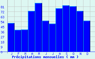 | Jan | Fev | Mars | Avr | Mai | Juin | Juil | Aout | Sept | Oct | Nov | Dec | Année | | Temp. max. (°C) | 4 | 5.4 | 8.9 | 11.9 | 16.4 | 20.6 | 23 | 22.6 | 18.1 | 14.1 | 7.7 | 4.3 | 13.1 | | Temp. moy. (°C) | 0.1 | 1 | 3.6 | 6.3 | 10.3 | 13.8 | 15.8 | 15.5 | 11.7 | 8.7 | 3.6 | 0.5 | 7.6 | | Temp. min. (°C) | -3.8 | -3.4 | -1.7 | 0.7 | 4.1 | 7 | 8.5 | 8.5 | 5.2 | 3.4 | -0.5 | -3.3 | 2.1 | | Jan | Fev | Mars | Avr | Mai | Juin | Juil | Aout | Sept | Oct | Nov | Dec | Année | | Jours Tx > 30°C | 0 | 0 | 0 | 0 | 0 | 0.7 | 1.8 | 2.1 | 0 | 0 | 0 | 0 | 4.5 | | Jours Tx > 25°C | 0 | 0 | 0 | 0 | 0.9 | 6.6 | 11.3 | 9.9 | 1.9 | 0 | 0 | 0 | 30.6 | | Jours Tx < 0°C | 6 | 4.7 | 1.8 | 0 | 0 | 0 | 0 | 0 | 0 | 0.1 | 1.7 | 6.5 | 20.7 | | Jours Tn < 0°C | 24.1 | 21.6 | 20.8 | 12.6 | 3.4 | 0.6 | 0 | 0.1 | 2.3 | 5.8 | 16 | 22.9 | 130.2 | | Jours Tn < -5°C | 11.7 | 9.3 | 6.1 | 1.7 | 0 | 0 | 0 | 0 | 0 | 0.9 | 5.2 | 10.3 | 45.2 | | Jours Tn < -10°C | 2.6 | 2.2 | 0.4 | 0.1 | 0 | 0 | 0 | 0 | 0 | 0.1 | 0.9 | 3.1 | 9.3 | | | | Jan | Fev | Mars | Avr | Mai | Juin | Juil | Aout | Sept | Oct | Nov | Dec | Année | | RR mensuel (mm) | 51.1 | 38.9 | 39.2 | 72.7 | 87.4 | 55.1 | 50.3 | 77.7 | 82.9 | 81.3 | 72.7 | 55.1 | 764.4 | | Jan | Fev | Mars | Avr | Mai | Juin | Juil | Aout | Sept | Oct | Nov | Dec | Année | | Jours RR > 1mm | 9.1 | 7 | 6.9 | 10 | 10.6 | 7.1 | 7.1 | 8.9 | 7.9 | 9.7 | 9.7 | 8.7 | 102.7 | | Jours RR > 5mm | 3.8 | 2.6 | 2.8 | 4.7 | 5.4 | 3.3 | 3.2 | 4.2 | 4.1 | 4.7 | 4.3 | 3.3 | 46.4 | | Jours RR > 10mm | 1.2 | 1.2 | 1.4 | 2.5 | 2.8 | 1.7 | 1.8 | 2.5 | 2.3 | 2.8 | 1.9 | 1.9 | 23.9 | | | | Jan | Fev | Mars | Avr | Mai | Juin | Juil | Aout | Sept | Oct | Nov | Dec | Année | | Vent moyen (km/h) | 14.4 | 15.5 | 15.5 | 15.1 | 13.3 | 12.6 | 11.9 | 11.5 | 12.2 | 13 | 15.1 | 14.4 | 13.7 | | Jan | Fev | Mars | Avr | Mai | Juin | Juil | Aout | Sept | Oct | Nov | Dec | Année | | Jours rafales >= 58km/h | 7.3 | 6.8 | 6.4 | 5.9 | 3.1 | 2.1 | 2.6 | 2.1 | 2.2 | 3.9 | 6.1 | 6 | 54.5 | | Jours rafales >= 100km/h | 0.1 | 0.1 | 0.2 | 0 | 0 | 0 | 0 | 0.1 | 0 | 0.1 | 0.1 | 0.1 | 0.8 |