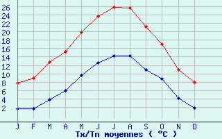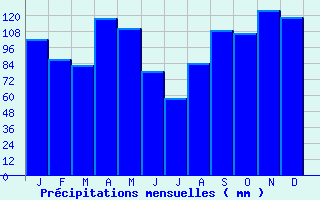 | Jan | Fev | Mars | Avr | Mai | Juin | Juil | Aout | Sept | Oct | Nov | Dec | Année | | Temp. max. (°C) | 7.8 | 9 | 12.7 | 15.2 | 19.9 | 23.6 | 25.9 | 25.7 | 21.2 | 17 | 10.9 | 7.9 | 16.4 | | Temp. moy. (°C) | 4.7 | 5.3 | 8.2 | 10.6 | 14.8 | 18.1 | 20.1 | 20 | 16.1 | 12.9 | 7.5 | 4.9 | 12 | | Temp. min. (°C) | 1.6 | 1.7 | 3.8 | 5.9 | 9.6 | 12.6 | 14.2 | 14.2 | 10.9 | 8.8 | 4.1 | 1.9 | 7.5 | | Jan | Fev | Mars | Avr | Mai | Juin | Juil | Aout | Sept | Oct | Nov | Dec | Année | | Jours Tx > 30°C | 0 | 0 | 0 | 0 | 0.2 | 3.2 | 7.3 | 6.5 | 0.5 | 0 | 0 | 0 | 17.8 | | Jours Tx > 25°C | 0 | 0 | 0 | 0.7 | 5.1 | 12.8 | 18.1 | 16.3 | 6.4 | 0.9 | 0 | 0 | 60.3 | | Jours Tx < 0°C | 1.2 | 0.5 | 0.1 | 0 | 0 | 0 | 0 | 0 | 0 | 0 | 0.1 | 1.7 | 3.6 | | Jours Tn < 0°C | 9.9 | 9.2 | 5.6 | 1 | 0.1 | 0 | 0 | 0 | 0 | 0.6 | 5.5 | 10.1 | 42 | | Jours Tn < -5°C | 2.2 | 1.6 | 0.5 | 0 | 0 | 0 | 0 | 0 | 0 | 0 | 0.5 | 2.8 | 7.5 | | Jours Tn < -10°C | 0.2 | 0 | 0.1 | 0 | 0 | 0 | 0 | 0 | 0 | 0 | 0 | 0.2 | 0.4 | | | | Jan | Fev | Mars | Avr | Mai | Juin | Juil | Aout | Sept | Oct | Nov | Dec | Année | | RR mensuel (mm) | 101.7 | 87.1 | 82.6 | 117.9 | 110.1 | 77.6 | 57.7 | 84 | 109 | 106.4 | 124.1 | 118.1 | 1176.3 | | Jan | Fev | Mars | Avr | Mai | Juin | Juil | Aout | Sept | Oct | Nov | Dec | Année | | Jours RR > 1mm | 11.3 | 10 | 10.2 | 11.5 | 11.8 | 8.2 | 7.5 | 8.7 | 9.1 | 11.1 | 12.2 | 12.2 | 123.7 | | Jours RR > 5mm | 6.7 | 5.1 | 6.1 | 7.2 | 6.6 | 4.5 | 3.7 | 4.8 | 5.5 | 6.2 | 7.7 | 7.6 | 71.7 | | Jours RR > 10mm | 3.8 | 3 | 3.1 | 4.3 | 4.2 | 2.8 | 2 | 3.2 | 3.7 | 3.5 | 4.6 | 4.2 | 42.2 | | | | Jan | Fev | Mars | Avr | Mai | Juin | Juil | Aout | Sept | Oct | Nov | Dec | Année | | Vent moyen (km/h) | 8.6 | 9.4 | 10.1 | 10.1 | 8.6 | 8.6 | 8.3 | 7.9 | 7.6 | 7.6 | 7.9 | 8.3 | 8.6 | | Jan | Fev | Mars | Avr | Mai | Juin | Juil | Aout | Sept | Oct | Nov | Dec | Année | | Jours rafales >= 58km/h | 3.1 | 4 | 2.7 | 3.4 | 1.8 | 1.2 | 1.4 | 1.3 | 0.8 | 1.9 | 2.2 | 2.7 | 26.5 | | Jours rafales >= 100km/h | 0 | 0 | 0 | 0 | 0 | 0.1 | 0 | 0.1 | 0 | 0 | 0 | 0.1 | 0.2 |