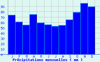 | Jan | Fev | Mars | Avr | Mai | Juin | Juil | Aout | Sept | Oct | Nov | Dec | Année | | Temp. max. (°C) | 9.4 | 11.3 | 14.9 | 17 | 21.9 | 25 | 27.1 | 27.5 | 23.6 | 19 | 12.9 | 9.6 | 18.3 | | Temp. moy. (°C) | 5.9 | 6.7 | 9.3 | 11.2 | 15.7 | 18.5 | 20.1 | 20.4 | 16.9 | 13.8 | 8.9 | 6 | 12.8 | | Temp. min. (°C) | 2.3 | 2 | 3.6 | 5.4 | 9.4 | 11.9 | 13.2 | 13.2 | 10.1 | 8.6 | 4.8 | 2.5 | 7.3 | | Jan | Fev | Mars | Avr | Mai | Juin | Juil | Aout | Sept | Oct | Nov | Dec | Année | | Jours Tx > 30°C | 0 | 0 | 0 | 0.1 | 1.2 | 5.1 | 7.9 | 8.1 | 1.7 | 0.1 | 0 | 0 | 24.1 | | Jours Tx > 25°C | 0 | 0 | 0.2 | 1.5 | 8.7 | 14.7 | 21 | 21.6 | 10.7 | 2.3 | 0 | 0 | 80.6 | | Jours Tx < 0°C | 0.9 | 0.2 | 0 | 0 | 0 | 0 | 0 | 0 | 0 | 0 | 0 | 0.6 | 1.7 | | Jours Tn < 0°C | 10.6 | 10.9 | 7.7 | 2.6 | 0.1 | 0 | 0 | 0 | 0.1 | 1.8 | 5.5 | 10.2 | 49.5 | | Jours Tn < -5°C | 2.3 | 1.9 | 0.8 | 0.1 | 0 | 0 | 0 | 0 | 0 | 0.1 | 0.8 | 2.5 | 8.3 | | Jours Tn < -10°C | 0.2 | 0.1 | 0.1 | 0 | 0 | 0 | 0 | 0 | 0 | 0 | 0 | 0.1 | 0.5 | | | | Jan | Fev | Mars | Avr | Mai | Juin | Juil | Aout | Sept | Oct | Nov | Dec | Année | | RR mensuel (mm) | 73.6 | 60.9 | 55 | 75 | 59.5 | 55.7 | 53 | 54.7 | 65.2 | 79.3 | 96.3 | 89.6 | 817.8 | | Jan | Fev | Mars | Avr | Mai | Juin | Juil | Aout | Sept | Oct | Nov | Dec | Année | | Jours RR > 1mm | 11.1 | 9.7 | 9.4 | 11.9 | 10.3 | 7.8 | 7.4 | 7.1 | 8.7 | 12.1 | 12.8 | 12.2 | 120.5 | | Jours RR > 5mm | 5.1 | 4.2 | 3.9 | 5.1 | 4.1 | 3.8 | 3.2 | 3.6 | 4.4 | 6 | 6.4 | 6.5 | 56.2 | | Jours RR > 10mm | 2.2 | 1.9 | 1.3 | 2.2 | 1.7 | 1.7 | 1.6 | 1.5 | 1.9 | 2.4 | 3.1 | 3.3 | 24.9 | | | | Jan | Fev | Mars | Avr | Mai | Juin | Juil | Aout | Sept | Oct | Nov | Dec | Année | | Vent moyen (km/h) | 10.1 | 10.1 | 10.1 | 9.7 | 8.6 | 7.6 | 7.2 | 6.5 | 6.8 | 7.9 | 8.6 | 9.4 | 8.6 | | Jan | Fev | Mars | Avr | Mai | Juin | Juil | Aout | Sept | Oct | Nov | Dec | Année | | Jours rafales >= 58km/h | 3.1 | 3.1 | 2.6 | 2.5 | -- | 1 | 0.8 | 0.6 | 0.8 | 1.3 | 1.2 | 2.9 | -- | | Jours rafales >= 100km/h | 0 | 0 | 0 | 0 | -- | 0.1 | 0 | 0 | 0 | 0 | 0 | 0.1 | -- |