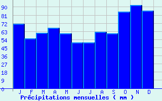 | Jan | Fev | Mars | Avr | Mai | Juin | Juil | Aout | Sept | Oct | Nov | Dec | Année | | Temp. max. (°C) | 9 | 10.8 | 14.3 | 17 | 21.2 | 25.2 | 27.2 | 27.3 | 23.2 | 18.6 | 12.5 | 9 | 18 | | Temp. moy. (°C) | 5.6 | 6.3 | 8.9 | 11.3 | 15.2 | 18.6 | 20.2 | 20.3 | 16.7 | 13.5 | 8.4 | 5.7 | 12.6 | | Temp. min. (°C) | 2.2 | 1.9 | 3.4 | 5.5 | 9.3 | 12 | 13.3 | 13.4 | 10.2 | 8.4 | 4.3 | 2.4 | 7.2 | | Jan | Fev | Mars | Avr | Mai | Juin | Juil | Aout | Sept | Oct | Nov | Dec | Année | | Jours Tx > 30°C | 0 | 0 | 0 | 0.1 | 0.9 | 5.1 | 8.1 | 8 | 1.7 | 0.1 | 0 | 0 | 23.9 | | Jours Tx > 25°C | 0 | 0 | 0.2 | 1.6 | 6.8 | 15.4 | 21.2 | 20.6 | 8.8 | 2.1 | 0 | 0 | 76.7 | | Jours Tx < 0°C | 1.2 | 0.2 | 0 | 0 | 0 | 0 | 0 | 0 | 0 | 0 | 0 | 0.8 | 2.1 | | Jours Tn < 0°C | 10.4 | 11.3 | 7.3 | 1.9 | 0.1 | 0 | 0 | 0 | 0 | 1.3 | 6.1 | 10.2 | 48.5 | | Jours Tn < -5°C | 2.1 | 1.1 | 0.4 | 0 | 0 | 0 | 0 | 0 | 0 | 0 | 0.8 | 1.8 | 6.2 | | Jours Tn < -10°C | 0.2 | 0.1 | 0.1 | 0 | 0 | 0 | 0 | 0 | 0 | 0 | 0 | 0.2 | 0.5 | | | | Jan | Fev | Mars | Avr | Mai | Juin | Juil | Aout | Sept | Oct | Nov | Dec | Année | | RR mensuel (mm) | 71.5 | 55.3 | 61.3 | 66.7 | 60.6 | 50.4 | 50.8 | 62.2 | 60.9 | 84.7 | 92.2 | 85.9 | 802.5 | | Jan | Fev | Mars | Avr | Mai | Juin | Juil | Aout | Sept | Oct | Nov | Dec | Année | | Jours RR > 1mm | 11.1 | 9.2 | 10.2 | 10.7 | 10.9 | 7.3 | 8.1 | 7.8 | 8.8 | 11.8 | 12.7 | 12.4 | 121 | | Jours RR > 5mm | 5.2 | 3.8 | 3.8 | 4.9 | 4.8 | 3.2 | 3.4 | 3.6 | 3.8 | 6.2 | 6.5 | 6.4 | 55.7 | | Jours RR > 10mm | 1.9 | 1.7 | 1.9 | 2.1 | 1.7 | 1.4 | 1.5 | 2 | 2.2 | 2.7 | 3 | 3.2 | 25.3 | | | | Jan | Fev | Mars | Avr | Mai | Juin | Juil | Aout | Sept | Oct | Nov | Dec | Année | | Vent moyen (km/h) | 11.9 | 12.2 | 10.8 | 11.9 | 10.1 | 8.3 | 7.9 | 7.2 | 7.9 | 9.4 | 10.1 | 11.9 | 10.1 | | Jan | Fev | Mars | Avr | Mai | Juin | Juil | Aout | Sept | Oct | Nov | Dec | Année | | Jours rafales >= 58km/h | -- | 4.7 | -- | 4.4 | 3.1 | 1.6 | 1.9 | 1.1 | 1.7 | 2.1 | 2.1 | 4.5 | -- | | Jours rafales >= 100km/h | -- | 0.1 | -- | 0.1 | 0.2 | 0.1 | 0.1 | 0.1 | 0 | 0 | 0.1 | 0.2 | -- |