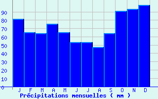 | Jan | Fev | Mars | Avr | Mai | Juin | Juil | Aout | Sept | Oct | Nov | Dec | Année | | Temp. max. (°C) | 8.9 | 10.5 | 13.9 | 16.5 | 20.6 | 24.1 | 26.5 | 26.4 | 23.3 | 18.6 | 12.7 | 9.4 | 17.7 | | Temp. moy. (°C) | 5.7 | 6.3 | 8.8 | 11 | 14.9 | 18 | 19.9 | 19.7 | 17 | 13.7 | 8.7 | 6.1 | 12.5 | | Temp. min. (°C) | 2.4 | 2.1 | 3.7 | 5.5 | 9.2 | 11.8 | 13.4 | 13 | 10.6 | 8.7 | 4.8 | 2.9 | 7.4 | | Jan | Fev | Mars | Avr | Mai | Juin | Juil | Aout | Sept | Oct | Nov | Dec | Année | | Jours Tx > 30°C | 0 | 0 | 0 | 0 | 0.8 | 3.8 | 6.9 | 6.3 | 2 | 0 | 0 | 0 | 19.8 | | Jours Tx > 25°C | 0 | 0 | 0.1 | 1.3 | 6.3 | 12.3 | 18.9 | 18.2 | 9.9 | 1.8 | 0 | 0 | 68.7 | | Jours Tx < 0°C | 1.4 | 0.4 | 0 | 0 | 0 | 0 | 0 | 0 | 0 | 0 | 0 | 0.4 | 2.2 | | Jours Tn < 0°C | 10 | 10.6 | 7.1 | 2 | 0.1 | 0 | 0 | 0 | 0 | 1.2 | 5.8 | 9.7 | 46.5 | | Jours Tn < -5°C | 2.1 | 1.6 | 0.3 | 0 | 0 | 0 | 0 | 0 | 0 | 0 | 0.7 | 1.2 | 5.9 | | Jours Tn < -10°C | 0.4 | 0.1 | 0 | 0 | 0 | 0 | 0 | 0 | 0 | 0 | 0 | 0.1 | 0.6 | | | | Jan | Fev | Mars | Avr | Mai | Juin | Juil | Aout | Sept | Oct | Nov | Dec | Année | | RR mensuel (mm) | 81.4 | 65.2 | 64.2 | 75.3 | 65.4 | 53.7 | 53.7 | 47.3 | 64.4 | 91.3 | 93.4 | 98.5 | 853.8 | | Jan | Fev | Mars | Avr | Mai | Juin | Juil | Aout | Sept | Oct | Nov | Dec | Année | | Jours RR > 1mm | 12.1 | 9.7 | 10.1 | 10.8 | 10.5 | 7.7 | 7.5 | 6.7 | 8.1 | 11.7 | 12.1 | 12.4 | 119.4 | | Jours RR > 5mm | 5.6 | 4.3 | 4.6 | 5.5 | 4.3 | 3.7 | 3.4 | 2.9 | 4.2 | 5.8 | 6.6 | 6.5 | 57.4 | | Jours RR > 10mm | 2.4 | 2 | 1.7 | 2.5 | 2.1 | 1.9 | 1.7 | 1.5 | 2 | 3.1 | 2.8 | 3.7 | 27.6 | | | | Jan | Fev | Mars | Avr | Mai | Juin | Juil | Aout | Sept | Oct | Nov | Dec | Année | | Vent moyen (km/h) | 12.2 | 12.2 | 12.2 | 12.2 | 10.8 | 9.7 | 9 | 8.3 | 8.6 | 9.4 | 10.4 | 11.9 | 10.4 | | Jan | Fev | Mars | Avr | Mai | Juin | Juil | Aout | Sept | Oct | Nov | Dec | Année | | Jours rafales >= 58km/h | -- | 4.4 | -- | 3.3 | 1.7 | 1.3 | -- | 1 | 0.9 | -- | -- | 3 | -- | | Jours rafales >= 100km/h | -- | 0.2 | -- | 0 | 0.1 | 0 | -- | 0.1 | 0 | -- | -- | 0 | -- |