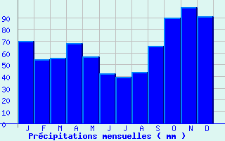 | Jan | Fev | Mars | Avr | Mai | Juin | Juil | Aout | Sept | Oct | Nov | Dec | Année | | Temp. max. (°C) | 9.8 | 11 | 13.9 | 16.2 | 20.3 | 23.6 | 25.2 | 25.5 | 22.7 | 18.5 | 13 | 9.8 | 17.5 | | Temp. moy. (°C) | 6.8 | 7.3 | 9.6 | 11.8 | 15.6 | 18.8 | 20.4 | 20.5 | 17.6 | 14.5 | 9.7 | 6.8 | 13.3 | | Temp. min. (°C) | 3.8 | 3.6 | 5.4 | 7.3 | 11 | 14 | 15.5 | 15.5 | 12.5 | 10.4 | 6.4 | 3.9 | 9.1 | | Jan | Fev | Mars | Avr | Mai | Juin | Juil | Aout | Sept | Oct | Nov | Dec | Année | | Jours Tx > 30°C | 0 | 0 | 0 | 0.1 | 0.6 | 3.1 | 4.8 | 4.7 | 1.4 | 0 | 0 | 0 | 14.7 | | Jours Tx > 25°C | 0 | 0 | 0 | 0.4 | 4.7 | 10.7 | 14 | 14.3 | 7.1 | 1.4 | 0 | 0 | 52.6 | | Jours Tx < 0°C | 0.5 | 0 | 0 | 0 | 0 | 0 | 0 | 0 | 0 | 0 | 0 | 0.4 | 0.9 | | Jours Tn < 0°C | 7.3 | 6.1 | 2.4 | 0.2 | 0 | 0 | 0 | 0 | 0 | 0.2 | 2.7 | 7.1 | 26 | | Jours Tn < -5°C | 0.8 | 0.2 | 0.1 | 0 | 0 | 0 | 0 | 0 | 0 | 0 | 0.3 | 0.7 | 2.1 | | Jours Tn < -10°C | 0 | 0 | 0 | 0 | 0 | 0 | 0 | 0 | 0 | 0 | 0 | 0 | 0 | | | | Jan | Fev | Mars | Avr | Mai | Juin | Juil | Aout | Sept | Oct | Nov | Dec | Année | | RR mensuel (mm) | 69.8 | 54.4 | 55.6 | 68.3 | 56.8 | 42.3 | 39.4 | 43.6 | 66 | 89.7 | 99 | 91.1 | 776 | | Jan | Fev | Mars | Avr | Mai | Juin | Juil | Aout | Sept | Oct | Nov | Dec | Année | | Jours RR > 1mm | 10.7 | 9.4 | 9.9 | 11.1 | 9.8 | 6.5 | 7 | 6.8 | 8.5 | 12.2 | 13.3 | 13.3 | 118.6 | | Jours RR > 5mm | 5 | 3.8 | 4 | 5 | 4 | 3.1 | 2.6 | 2.7 | 4.1 | 6.1 | 7 | 6.4 | 53.8 | | Jours RR > 10mm | 1.6 | 1.6 | 1.6 | 2.3 | 1.4 | 1.4 | 0.7 | 1.1 | 2 | 3 | 3.4 | 3.3 | 23.2 | | | | Jan | Fev | Mars | Avr | Mai | Juin | Juil | Aout | Sept | Oct | Nov | Dec | Année | | Vent moyen (km/h) | 16.6 | 15.8 | 15.5 | 15.8 | 14.4 | 13.7 | 13 | 13 | 13.3 | 14 | 14.8 | 15.8 | 14.8 | | Jan | Fev | Mars | Avr | Mai | Juin | Juil | Aout | Sept | Oct | Nov | Dec | Année | | Jours rafales >= 58km/h | 7.6 | 6 | 4.9 | -- | -- | 1.9 | -- | 1.9 | 2.5 | 5 | 5.3 | -- | -- | | Jours rafales >= 100km/h | 0.5 | 0.3 | 0 | -- | -- | 0 | -- | 0 | 0.2 | 0.1 | 0.1 | -- | -- |
