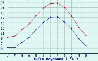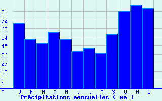 | Jan | Fev | Mars | Avr | Mai | Juin | Juil | Aout | Sept | Oct | Nov | Dec | Année | | Temp. max. (°C) | 9.3 | 9.8 | 12.3 | 14.4 | 17.8 | 20.7 | 22.5 | 22.7 | 21 | 17.6 | 13.1 | 10.1 | 16 | | Temp. moy. (°C) | 7.3 | 7.6 | 9.8 | 11.7 | 15 | 17.9 | 19.8 | 20 | 18.2 | 15.1 | 10.9 | 8 | 13.5 | | Temp. min. (°C) | 5.3 | 5.3 | 7.4 | 9.1 | 12.3 | 15.1 | 17.1 | 17.3 | 15.3 | 12.6 | 8.7 | 5.9 | 11 | | Jan | Fev | Mars | Avr | Mai | Juin | Juil | Aout | Sept | Oct | Nov | Dec | Année | | Jours Tx > 30°C | 0 | 0 | 0 | 0 | 0 | 0.4 | 1.1 | 0.6 | 0.1 | 0 | 0 | 0 | 2.2 | | Jours Tx > 25°C | 0 | 0 | 0 | 0.1 | 1.1 | 3.3 | 6.3 | 5.9 | 2.8 | 0.4 | 0 | 0 | 19.9 | | Jours Tx < 0°C | 0.8 | 0.1 | 0 | 0 | 0 | 0 | 0 | 0 | 0 | 0 | 0 | 0.1 | 0.9 | | Jours Tn < 0°C | 3.2 | 2.2 | 0.3 | 0 | 0 | 0 | 0 | 0 | 0 | 0 | 0.4 | 1.8 | 7.9 | | Jours Tn < -5°C | 0.6 | 0.1 | 0 | 0 | 0 | 0 | 0 | 0 | 0 | 0 | 0 | 0 | 0.7 | | Jours Tn < -10°C | 0.1 | 0 | 0 | 0 | 0 | 0 | 0 | 0 | 0 | 0 | 0 | 0 | 0.1 | | | | Jan | Fev | Mars | Avr | Mai | Juin | Juil | Aout | Sept | Oct | Nov | Dec | Année | | RR mensuel (mm) | 68 | 51.9 | 46.9 | 58.9 | 50.9 | 38.7 | 41.8 | 37.1 | 56.8 | 80.7 | 87.4 | 83.7 | 702.8 | | Jan | Fev | Mars | Avr | Mai | Juin | Juil | Aout | Sept | Oct | Nov | Dec | Année | | Jours RR > 1mm | 11.9 | 9.4 | 9.2 | 10.5 | 9.2 | 6.6 | 6.6 | 5.9 | 7.4 | 11.6 | 12.3 | 12.9 | 113.6 | | Jours RR > 5mm | 4.9 | 3.9 | 3.1 | 4.2 | 3.5 | 2.2 | 2.5 | 2.4 | 3.6 | 5.5 | 6.2 | 6.2 | 48.2 | | Jours RR > 10mm | 1.5 | 1.4 | 1 | 1.5 | 1.2 | 1 | 1.3 | 1.1 | 1.9 | 2.5 | 2.7 | 2.6 | 19.8 | | | | Jan | Fev | Mars | Avr | Mai | Juin | Juil | Aout | Sept | Oct | Nov | Dec | Année | | Vent moyen (km/h) | 23.4 | 21.6 | 21.2 | 21.2 | 19.1 | 17.6 | 17.6 | 16.6 | 18.4 | 22 | 22.3 | 23 | 20.2 | | Jan | Fev | Mars | Avr | Mai | Juin | Juil | Aout | Sept | Oct | Nov | Dec | Année | | Jours rafales >= 58km/h | 11.5 | 8.4 | 9.2 | 7.5 | 5.5 | 3.2 | 3 | -- | 4.8 | 10.4 | 10.5 | -- | -- | | Jours rafales >= 100km/h | 1 | 1 | 0.4 | 0.2 | 0.1 | 0.1 | 0.1 | -- | 0.3 | 0.7 | 0.6 | -- | -- |