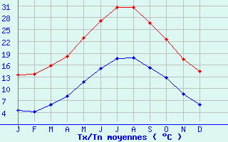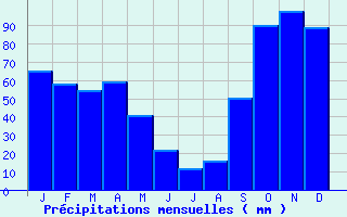 | Jan | Fev | Mars | Avr | Mai | Juin | Juil | Aout | Sept | Oct | Nov | Dec | Année | | Temp. max. (°C) | 13.5 | 13.7 | 15.8 | 18.2 | 22.8 | 27.2 | 30.7 | 30.7 | 26.7 | 22.5 | 17.5 | 14.4 | 21.2 | | Temp. moy. (°C) | 9 | 9 | 10.9 | 13.2 | 17.3 | 21.2 | 24.2 | 24.3 | 21 | 17.6 | 13.1 | 10.1 | 15.9 | | Temp. min. (°C) | 4.5 | 4.2 | 6 | 8.1 | 11.7 | 15.2 | 17.7 | 17.9 | 15.3 | 12.8 | 8.7 | 5.9 | 10.7 | | Jan | Fev | Mars | Avr | Mai | Juin | Juil | Aout | Sept | Oct | Nov | Dec | Année | | Jours Tx > 30°C | 0 | 0 | 0 | 0 | 0.6 | 6.9 | 19.1 | 18.4 | 3.7 | 0.2 | 0 | 0 | 49 | | Jours Tx > 25°C | 0 | 0 | 0.1 | 0.4 | 8.3 | 21.6 | 29.8 | 30.4 | 22.5 | 5.6 | 0 | 0 | 118.7 | | Jours Tx < 0°C | 0 | 0 | 0 | 0 | 0 | 0 | 0 | 0 | 0 | 0 | 0 | 0 | 0 | | Jours Tn < 0°C | 7 | 6.5 | 4.3 | 0.6 | 0 | 0 | 0 | 0 | 0 | 0 | 1 | 4.4 | 23.9 | | Jours Tn < -5°C | 0.5 | 0.4 | 0.1 | 0 | 0 | 0 | 0 | 0 | 0 | 0 | 0 | 0.2 | 1.2 | | Jours Tn < -10°C | 0 | 0 | 0 | 0 | 0 | 0 | 0 | 0 | 0 | 0 | 0 | 0 | 0 | | | | Jan | Fev | Mars | Avr | Mai | Juin | Juil | Aout | Sept | Oct | Nov | Dec | Année | | RR mensuel (mm) | 65.4 | 58.3 | 54.4 | 59 | 40.9 | 21.9 | 11.7 | 15.7 | 50.6 | 90.1 | 98.3 | 89 | 655.3 | | Jan | Fev | Mars | Avr | Mai | Juin | Juil | Aout | Sept | Oct | Nov | Dec | Année | | Jours RR > 1mm | 7.7 | 7.7 | 6.8 | 7.7 | 5.1 | 2.8 | 1.2 | 2.2 | 5.1 | 7.8 | 10.1 | 10.2 | 74.4 | | Jours RR > 5mm | 4 | 3.5 | 3.3 | 3.7 | 2.6 | 1.3 | 0.5 | 1 | 2.9 | 5 | 5.4 | 5 | 38.1 | | Jours RR > 10mm | 2.2 | 1.9 | 1.8 | 1.8 | 1.2 | 0.7 | 0.4 | 0.6 | 1.6 | 3.3 | 3.3 | 2.8 | 21.7 | | | | Jan | Fev | Mars | Avr | Mai | Juin | Juil | Aout | Sept | Oct | Nov | Dec | Année | | Vent moyen (km/h) | 16.6 | 16.9 | 18.7 | 18.7 | 17.6 | 17.3 | 16.6 | 15.5 | 15.1 | 15.5 | 15.1 | 16.2 | 16.6 | | Jan | Fev | Mars | Avr | Mai | Juin | Juil | Aout | Sept | Oct | Nov | Dec | Année | | Jours rafales >= 58km/h | 11.3 | 9.6 | 12 | 11.4 | 8 | 6.8 | 7.5 | 6.5 | 8 | 7.3 | 8.7 | 10.7 | 107.9 | | Jours rafales >= 100km/h | 1.3 | 1 | 1 | 0.4 | 0.1 | 0.2 | 0.1 | 0.1 | 0.3 | 0.2 | 0.5 | 1 | 6.2 | | | | Jan | Fev | Mars | Avr | Mai | Juin | Juil | Aout | Sept | Oct | Nov | Dec | Année | | Jours avec brouillard (*) | 0.7 | 0.7 | 0.8 | 0.7 | 0.8 | 0.4 | 0.5 | 0.3 | 0.4 | 0.5 | 0.2 | 0.5 | 6.5 | | Jours avec orage (*) | 1.1 | 1.1 | 1.6 | 2 | 1.9 | 1.4 | 1.9 | 2.3 | 3.5 | 3.6 | 3 | 1.5 | 24.9 | | Jours avec grêle (*) | 0.2 | 0.4 | 0.3 | 0.6 | 0.1 | 0.1 | 0.1 | 0 | 0 | 0.2 | 0.4 | 0.2 | 2.5 | | Jours avec neige (*) | 0.5 | 0.5 | 0 | 0 | 0 | 0 | 0 | 0 | 0 | 0 | 0 | 0.3 | 1.4 | | | | Jan | Fev | Mars | Avr | Mai | Juin | Juil | Aout | Sept | Oct | Nov | Dec | Année | | Ensoleillement (heures) | 128.2 | 144 | 204.4 | 218.9 | 292.3 | 332 | 375.5 | 331.6 | 250.8 | 195.9 | 132 | 114.6 | 2720.2 |