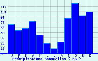 | Jan | Fev | Mars | Avr | Mai | Juin | Juil | Aout | Sept | Oct | Nov | Dec | Année | | Temp. max. (°C) | 13.6 | 14 | 15.9 | 18.1 | 22.2 | 26.1 | 29.4 | 29.7 | 26.3 | 22.1 | 17.4 | 14.3 | 20.8 | | Temp. moy. (°C) | 9.7 | 9.8 | 11.6 | 13.7 | 17.5 | 21.3 | 24.4 | 24.8 | 21.7 | 18 | 13.6 | 10.7 | 16.4 | | Temp. min. (°C) | 5.8 | 5.6 | 7.3 | 9.3 | 12.9 | 16.5 | 19.5 | 19.9 | 17.1 | 13.9 | 9.8 | 7.1 | 12.1 | | Jan | Fev | Mars | Avr | Mai | Juin | Juil | Aout | Sept | Oct | Nov | Dec | Année | | Jours Tx > 30°C | 0 | 0 | 0 | 0 | 0.1 | 2.1 | 11.1 | 13.6 | 1.7 | 0 | 0 | 0 | 28.6 | | Jours Tx > 25°C | 0 | 0.1 | 0.1 | 0.1 | 4.2 | 20.6 | 30.5 | 30.8 | 21.5 | 4.4 | 0.1 | 0 | 112.3 | | Jours Tx < 0°C | 0 | 0 | 0 | 0 | 0 | 0 | 0 | 0 | 0 | 0 | 0 | 0 | 0 | | Jours Tn < 0°C | 0.8 | 0.6 | 0.2 | 0 | 0 | 0 | 0 | 0 | 0 | 0 | 0 | 0.4 | 2 | | Jours Tn < -5°C | 0 | 0 | 0 | 0 | 0 | 0 | 0 | 0 | 0 | 0 | 0 | 0 | 0 | | Jours Tn < -10°C | 0 | 0 | 0 | 0 | 0 | 0 | 0 | 0 | 0 | 0 | 0 | 0 | 0 | | | | Jan | Fev | Mars | Avr | Mai | Juin | Juil | Aout | Sept | Oct | Nov | Dec | Année | | RR mensuel (mm) | 72.1 | 57.6 | 62.6 | 79.5 | 46.2 | 25 | 12.1 | 28.4 | 88.3 | 125.6 | 94.2 | 103.7 | 795.3 | | Jan | Fev | Mars | Avr | Mai | Juin | Juil | Aout | Sept | Oct | Nov | Dec | Année | | Jours RR > 1mm | 6.3 | 6.1 | 6.6 | 7.5 | 5 | 3 | 1.5 | 2.2 | 4.8 | 7.1 | 8.1 | 8.7 | 66.9 | | Jours RR > 5mm | 3.2 | 3.1 | 3.1 | 3.6 | 2.3 | 1.3 | 0.6 | 1.2 | 2.4 | 4.3 | 4.5 | 4.5 | 34.2 | | Jours RR > 10mm | 1.9 | 1.7 | 1.7 | 2.1 | 1.2 | 0.7 | 0.3 | 0.7 | 1.5 | 3 | 2.7 | 2.9 | 20.3 | | | | Jan | Fev | Mars | Avr | Mai | Juin | Juil | Aout | Sept | Oct | Nov | Dec | Année | | Vent moyen (km/h) | 11.9 | 11.9 | 11.9 | 11.2 | 10.1 | 10.1 | 10.4 | 10.8 | 11.5 | 10.8 | 11.2 | 11.9 | 11.2 | | Jan | Fev | Mars | Avr | Mai | Juin | Juil | Aout | Sept | Oct | Nov | Dec | Année | | Jours rafales >= 58km/h | 5.9 | 4.9 | 6.3 | 4 | 2.2 | 2 | 2.1 | 2.4 | 3.3 | 4.2 | 4.7 | 6.3 | 48.4 | | Jours rafales >= 100km/h | 0.7 | 0.3 | 0.4 | 0.1 | 0.2 | 0.2 | 0.1 | 0.2 | 0.1 | 0.2 | 0.3 | 0.9 | 3.6 | | | | Jan | Fev | Mars | Avr | Mai | Juin | Juil | Aout | Sept | Oct | Nov | Dec | Année | | Ensoleillement (heures) | 125.5 | -- | 188.3 | 200.3 | 243.2 | -- | 322.9 | 291.5 | 220.1 | 164.3 | 124.7 | 113.2 | -- |