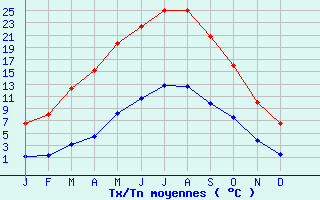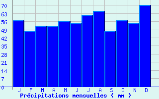| Jan | Fev | Mars | Avr | Mai | Juin | Juil | Aout | Sept | Oct | Nov | Dec | Année | | Temp. max. (°C) | 6.5 | 8.1 | 12.2 | 15.3 | 19.6 | 22.4 | 25.1 | 25 | 20.7 | 16 | 10 | 6.6 | 15.7 | | Temp. moy. (°C) | 3.8 | 4.7 | 7.7 | 9.8 | 13.9 | 16.5 | 19 | 18.8 | 15.3 | 11.7 | 6.9 | 4.1 | 11.1 | | Temp. min. (°C) | 1.1 | 1.3 | 3.1 | 4.4 | 8.2 | 10.7 | 12.8 | 12.6 | 9.8 | 7.5 | 3.8 | 1.5 | 6.4 | | Jan | Fev | Mars | Avr | Mai | Juin | Juil | Aout | Sept | Oct | Nov | Dec | Année | | Jours Tx > 30°C | 0 | 0 | 0 | 0 | 0.1 | 1.5 | 4.7 | 4.2 | 0.4 | 0 | 0 | 0 | 10.9 | | Jours Tx > 25°C | 0 | 0 | 0 | 1 | 4 | 8.6 | 15 | 13.7 | 4.1 | 0.4 | 0 | 0 | 46.7 | | Jours Tx < 0°C | 2.1 | 1.1 | 0.1 | 0 | 0 | 0 | 0 | 0 | 0 | 0 | 0.3 | 1.6 | 5.1 | | Jours Tn < 0°C | 12.8 | 11.4 | 8.3 | 4.4 | 0.1 | 0 | 0 | 0 | 0 | 2 | 6.4 | 12.3 | 57.8 | | Jours Tn < -5°C | 3.6 | 2.1 | 0.4 | 0.1 | 0 | 0 | 0 | 0 | 0 | 0 | 1 | 2.5 | 9.7 | | Jours Tn < -10°C | 0.5 | 0.2 | 0 | 0 | 0 | 0 | 0 | 0 | 0 | 0 | 0.1 | 0.3 | 1.1 | | | | Jan | Fev | Mars | Avr | Mai | Juin | Juil | Aout | Sept | Oct | Nov | Dec | Année | | RR mensuel (mm) | 57.1 | 47.5 | 52.1 | 51.7 | 56.5 | 54.4 | 61.6 | 65.1 | 47.4 | 56.9 | 54.7 | 70.4 | 675.4 | | Jan | Fev | Mars | Avr | Mai | Juin | Juil | Aout | Sept | Oct | Nov | Dec | Année | | Jours RR > 1mm | 10.8 | 10.8 | 10.5 | 10.2 | 9.1 | 9 | 9.4 | 9 | 8.7 | 9.5 | 10.7 | 12 | 119.6 | | Jours RR > 5mm | 4 | 2.9 | 3.4 | 3.9 | 4.1 | 3.8 | 4.4 | 3.7 | 2.9 | 3.5 | 3.8 | 5.1 | 45.3 | | Jours RR > 10mm | 1.6 | 0.7 | 1 | 1.1 | 1.6 | 1.2 | 1.9 | 2 | 1.1 | 1.6 | 1.4 | 2.1 | 17.3 | | | | Jan | Fev | Mars | Avr | Mai | Juin | Juil | Aout | Sept | Oct | Nov | Dec | Année | | Vent moyen (km/h) | 12.2 | 11.9 | 11.5 | 10.8 | 9.4 | 8.6 | 8.6 | 7.9 | 8.3 | 9.7 | 10.4 | 11.9 | 10.1 | | Jan | Fev | Mars | Avr | Mai | Juin | Juil | Aout | Sept | Oct | Nov | Dec | Année | | Jours rafales >= 58km/h | 5.6 | 5.1 | 3.9 | -- | 1.7 | 1.1 | 1.3 | -- | 1.5 | 2.3 | 2.6 | 4.8 | -- | | Jours rafales >= 100km/h | 0.2 | 0.4 | 0 | -- | 0 | 0 | 0 | -- | 0 | 0 | 0 | 0.1 | -- |