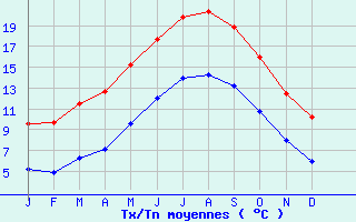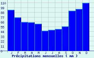 | Jan | Fev | Mars | Avr | Mai | Juin | Juil | Aout | Sept | Oct | Nov | Dec | Année | | Temp. max. (°C) | 9.6 | 9.7 | 11.5 | 12.7 | 15.2 | 17.7 | 19.8 | 20.4 | 18.9 | 16 | 12.5 | 10.2 | 14.5 | | Temp. moy. (°C) | 7.4 | 7.3 | 8.9 | 9.9 | 12.4 | 14.8 | 16.9 | 17.3 | 16 | 13.4 | 10.2 | 8 | 11.9 | | Temp. min. (°C) | 5.2 | 4.9 | 6.3 | 7.1 | 9.6 | 12 | 13.9 | 14.3 | 13.2 | 10.8 | 8 | 5.9 | 9.3 | | Jan | Fev | Mars | Avr | Mai | Juin | Juil | Aout | Sept | Oct | Nov | Dec | Année | | Jours Tx > 30°C | 0 | 0 | 0 | 0 | 0 | 0.1 | 0.1 | 0.2 | 0 | 0 | 0 | 0 | 0.4 | | Jours Tx > 25°C | 0 | 0 | 0 | 0.1 | 0.2 | 0.4 | 1 | 1.1 | 0.7 | 0.1 | 0 | 0 | 3.6 | | Jours Tx < 0°C | 0.2 | 0.1 | 0 | 0 | 0 | 0 | 0 | 0 | 0 | 0 | 0 | 0 | 0.3 | | Jours Tn < 0°C | 2.6 | 2.1 | 0.1 | 0 | 0 | 0 | 0 | 0 | 0 | 0 | 0.3 | 1.3 | 6.4 | | Jours Tn < -5°C | 0.2 | 0.1 | 0 | 0 | 0 | 0 | 0 | 0 | 0 | 0 | 0 | 0 | 0.3 | | Jours Tn < -10°C | 0 | 0 | 0 | 0 | 0 | 0 | 0 | 0 | 0 | 0 | 0 | 0 | 0 | | | | Jan | Fev | Mars | Avr | Mai | Juin | Juil | Aout | Sept | Oct | Nov | Dec | Année | | RR mensuel (mm) | 93.3 | 76.3 | 65.5 | 64.9 | 61.3 | 45.5 | 47.4 | 49.5 | 55.4 | 91.5 | 95.8 | 109.8 | 856.2 | | Jan | Fev | Mars | Avr | Mai | Juin | Juil | Aout | Sept | Oct | Nov | Dec | Année | | Jours RR > 1mm | 15.9 | 12.4 | 12.2 | 11.3 | 10.2 | 8.1 | 8.7 | 8.3 | 9.2 | 13.8 | 15.6 | 15.6 | 141.5 | | Jours RR > 5mm | 6.8 | 5.7 | 4.6 | 4.8 | 4.5 | 2.9 | 3.1 | 3 | 3.6 | 6.3 | 7.3 | 7.6 | 60.2 | | Jours RR > 10mm | 2.5 | 2.1 | 1.7 | 1.7 | 1.4 | 1.2 | 1 | 1.1 | 1.4 | 2.6 | 3 | 3.3 | 23.1 | | | | Jan | Fev | Mars | Avr | Mai | Juin | Juil | Aout | Sept | Oct | Nov | Dec | Année | | Vent moyen (km/h) | 24.1 | 22 | 20.9 | 19.4 | 18 | 15.8 | 16.2 | 15.5 | 17.6 | 19.4 | 22 | 23.4 | 19.4 | | Jan | Fev | Mars | Avr | Mai | Juin | Juil | Aout | Sept | Oct | Nov | Dec | Année | | Jours rafales >= 58km/h | 17.2 | 13.8 | 13.3 | -- | 6.9 | 3.9 | 5.1 | 3.9 | 6 | -- | 13.5 | 17.2 | -- | | Jours rafales >= 100km/h | 1.6 | 0.5 | 0.2 | -- | 0.3 | 0.1 | 0.1 | 0.1 | 0 | -- | 0.2 | 0.9 | -- |