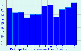 | Jan | Fev | Mars | Avr | Mai | Juin | Juil | Aout | Sept | Oct | Nov | Dec | Année | | Temp. max. (°C) | 5.2 | 6.4 | 10.3 | 13.7 | 18 | 20.5 | 22.9 | 22.9 | 19 | 14.4 | 8.6 | 5.3 | 14 | | Temp. moy. (°C) | 3 | 3.7 | 6.7 | 9.2 | 13.3 | 15.8 | 18 | 18 | 14.8 | 10.9 | 6 | 3.2 | 10.3 | | Temp. min. (°C) | 0.7 | 1 | 3.2 | 4.8 | 8.6 | 11 | 13.1 | 13.1 | 10.6 | 7.5 | 3.5 | 1 | 6.5 | | Jan | Fev | Mars | Avr | Mai | Juin | Juil | Aout | Sept | Oct | Nov | Dec | Année | | Jours Tx > 30°C | 0 | 0 | 0 | 0 | 0 | 0.4 | 1.9 | 1.8 | 0 | 0 | 0 | 0 | 4.1 | | Jours Tx > 25°C | 0 | 0 | 0 | 0.4 | 2.1 | 5 | 10 | 8.8 | 2 | 0 | 0 | 0 | 28.4 | | Jours Tx < 0°C | 3.2 | 2 | 0.1 | 0 | 0 | 0 | 0 | 0 | 0 | 0 | 0.6 | 2.8 | 8.7 | | Jours Tn < 0°C | 13 | 11 | 6.4 | 2.9 | 0.1 | 0 | 0 | 0 | 0 | 1.2 | 6 | 13.2 | 53.8 | | Jours Tn < -5°C | 2.8 | 2 | 0.4 | 0 | 0 | 0 | 0 | 0 | 0 | 0 | 0.6 | 2 | 7.7 | | Jours Tn < -10°C | 0.4 | 0.1 | 0 | 0 | 0 | 0 | 0 | 0 | 0 | 0 | 0 | 0.1 | 0.7 | | | | Jan | Fev | Mars | Avr | Mai | Juin | Juil | Aout | Sept | Oct | Nov | Dec | Année | | RR mensuel (mm) | 76.5 | 66.6 | 67.8 | 56.2 | 62.8 | 62.9 | 80.4 | 82.7 | 57.8 | 73.8 | 78.2 | 87.8 | 853.5 | | Jan | Fev | Mars | Avr | Mai | Juin | Juil | Aout | Sept | Oct | Nov | Dec | Année | | Jours RR > 1mm | 11.7 | 11.4 | 12.1 | 10.4 | 10.3 | 9.4 | 11.1 | 9.6 | 9.8 | 10.7 | 12 | 12.4 | 130.8 | | Jours RR > 5mm | 5.3 | 5 | 5.2 | 4.3 | 4.7 | 4.5 | 5.2 | 4.9 | 4.2 | 5 | 5.4 | 6.4 | 60.1 | | Jours RR > 10mm | 2.3 | 1.8 | 1.7 | 1.6 | 1.9 | 1.7 | 2.7 | 2.8 | 1.4 | 2.3 | 2.1 | 2.9 | 25.2 | | | | Jan | Fev | Mars | Avr | Mai | Juin | Juil | Aout | Sept | Oct | Nov | Dec | Année | | Vent moyen (km/h) | 16.9 | 16.9 | 16.6 | 15.5 | 14 | 12.6 | 12.6 | 11.9 | 13 | 14.4 | 15.1 | 16.6 | 14.8 | | Jan | Fev | Mars | Avr | Mai | Juin | Juil | Aout | Sept | Oct | Nov | Dec | Année | | Jours rafales >= 58km/h | 6.8 | 6.5 | 5.7 | 4.1 | 2.9 | 2 | 2.5 | 1.9 | 2.1 | 3.8 | 4.3 | 6.4 | 48.8 | | Jours rafales >= 100km/h | 0.3 | 0.3 | 0.2 | 0.1 | 0.1 | 0.1 | 0.1 | 0.1 | 0 | 0.2 | 0.1 | 0.2 | 1.7 |