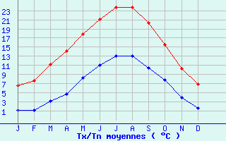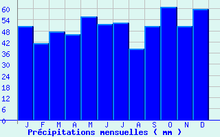 | Jan | Fev | Mars | Avr | Mai | Juin | Juil | Aout | Sept | Oct | Nov | Dec | Année | | Temp. max. (°C) | 6.6 | 7.6 | 11.2 | 14.2 | 17.8 | 21.1 | 23.8 | 23.8 | 20.3 | 15.6 | 10.2 | 6.9 | 15 | | Temp. moy. (°C) | 3.9 | 4.3 | 7.2 | 9.4 | 13 | 16 | 18.4 | 18.4 | 15.4 | 11.7 | 7.1 | 4.3 | 10.8 | | Temp. min. (°C) | 1.2 | 1.1 | 3.1 | 4.7 | 8.2 | 11 | 13 | 13 | 10.4 | 7.8 | 4 | 1.6 | 6.6 | | Jan | Fev | Mars | Avr | Mai | Juin | Juil | Aout | Sept | Oct | Nov | Dec | Année | | Jours Tx > 30°C | 0 | 0 | 0 | 0 | 0 | 0.8 | 2.8 | 2.3 | 0.3 | 0 | 0 | 0 | 6.1 | | Jours Tx > 25°C | 0 | 0 | 0 | 0.1 | 1.7 | 5.2 | 11.7 | 10.2 | 3.4 | 0.2 | 0 | 0 | 32.6 | | Jours Tx < 0°C | 2.5 | 1.2 | 0 | 0 | 0 | 0 | 0 | 0 | 0 | 0 | 0.2 | 1.4 | 5.3 | | Jours Tn < 0°C | 11.4 | 11.4 | 7.1 | 2.8 | 0.1 | 0 | 0 | 0 | 0 | 1.1 | 6.1 | 11.6 | 51.5 | | Jours Tn < -5°C | 3 | 2.7 | 0.4 | 0 | 0 | 0 | 0 | 0 | 0 | 0 | 0.8 | 2 | 8.8 | | Jours Tn < -10°C | 0.8 | 0.1 | 0 | 0 | 0 | 0 | 0 | 0 | 0 | 0 | 0 | 0 | 0.9 | | | | Jan | Fev | Mars | Avr | Mai | Juin | Juil | Aout | Sept | Oct | Nov | Dec | Année | | RR mensuel (mm) | 50.6 | 41.2 | 47.4 | 46 | 55.7 | 51.6 | 52.4 | 38.2 | 50.3 | 61 | 50.5 | 59.7 | 604.6 | | Jan | Fev | Mars | Avr | Mai | Juin | Juil | Aout | Sept | Oct | Nov | Dec | Année | | Jours RR > 1mm | 11 | 9.1 | 10.4 | 9.4 | 10.2 | 8 | 8.3 | 7 | 7.8 | 10.5 | 11.1 | 11.8 | 114.6 | | Jours RR > 5mm | 3.6 | 2.7 | 3 | 3.5 | 3.4 | 3.2 | 3.2 | 2.8 | 3.4 | 4.1 | 3.6 | 4.1 | 40.6 | | Jours RR > 10mm | 1 | 0.8 | 0.8 | 0.8 | 1.3 | 1.6 | 1.7 | 0.9 | 1.4 | 1.7 | 0.8 | 1.4 | 14.1 | | | | Jan | Fev | Mars | Avr | Mai | Juin | Juil | Aout | Sept | Oct | Nov | Dec | Année | | Vent moyen (km/h) | 17.3 | 16.2 | 16.6 | 15.1 | 14 | 13.3 | 13.7 | 13 | 13.3 | 15.1 | 14.8 | 16.2 | 14.8 | | Jan | Fev | Mars | Avr | Mai | Juin | Juil | Aout | Sept | Oct | Nov | Dec | Année | | Jours rafales >= 58km/h | 7.9 | 5.6 | 6.2 | 4.8 | 3 | 2 | 2.5 | 2.3 | 2.5 | 4.5 | 4 | 5.7 | 50.8 | | Jours rafales >= 100km/h | 0.5 | 0.3 | 0.1 | 0 | 0 | 0 | 0 | 0 | 0 | 0.1 | 0.2 | 0.1 | 1.5 | | | | Jan | Fev | Mars | Avr | Mai | Juin | Juil | Aout | Sept | Oct | Nov | Dec | Année | | Ensoleillement (heures) | 65.6 | 79.9 | 122.4 | 166.6 | 192.1 | 212.4 | 216.3 | 205 | 169.6 | 122.1 | 72.7 | 59.8 | 1684.4 |