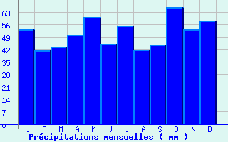 | Jan | Fev | Mars | Avr | Mai | Juin | Juil | Aout | Sept | Oct | Nov | Dec | Année | | Temp. max. (°C) | 6.7 | 7.9 | 12.1 | 15.1 | 18.9 | 22.4 | 25.3 | 25.2 | 21.5 | 16.4 | 10.4 | 7 | 15.8 | | Temp. moy. (°C) | 3.8 | 4.3 | 7.4 | 9.8 | 13.6 | 16.8 | 19.2 | 19.1 | 15.8 | 11.9 | 7 | 4.2 | 11.1 | | Temp. min. (°C) | 0.9 | 0.6 | 2.7 | 4.5 | 8.3 | 11.1 | 13 | 12.9 | 10.1 | 7.3 | 3.6 | 1.5 | 6.4 | | Jan | Fev | Mars | Avr | Mai | Juin | Juil | Aout | Sept | Oct | Nov | Dec | Année | | Jours Tx > 30°C | 0 | 0 | 0 | 0 | 0 | 1.5 | 4.9 | 4.2 | 0.7 | 0 | 0 | 0 | 11.3 | | Jours Tx > 25°C | 0 | 0 | 0 | 0.6 | 2.8 | 8.3 | 15.5 | 14.5 | 5.3 | 0.7 | 0 | 0 | 47.8 | | Jours Tx < 0°C | 2.7 | 1.5 | 0 | 0 | 0 | 0 | 0 | 0 | 0 | 0 | 0.2 | 1.6 | 6 | | Jours Tn < 0°C | 12.4 | 13.3 | 8.4 | 3.2 | 0.1 | 0 | 0 | 0 | 0 | 1.4 | 6.3 | 12.1 | 57.3 | | Jours Tn < -5°C | 3.4 | 2.7 | 0.4 | 0 | 0 | 0 | 0 | 0 | 0 | 0 | 0.9 | 1.9 | 9.3 | | Jours Tn < -10°C | 0.7 | 0.3 | 0 | 0 | 0 | 0 | 0 | 0 | 0 | 0 | 0.1 | 0.1 | 1.2 | | | | Jan | Fev | Mars | Avr | Mai | Juin | Juil | Aout | Sept | Oct | Nov | Dec | Année | | RR mensuel (mm) | 53.3 | 41.2 | 43.3 | 50.3 | 60.1 | 45 | 55.3 | 41.7 | 44.6 | 65.9 | 53.5 | 58.1 | 612.3 | | Jan | Fev | Mars | Avr | Mai | Juin | Juil | Aout | Sept | Oct | Nov | Dec | Année | | Jours RR > 1mm | 10.6 | 9.1 | 10 | 9.2 | 10 | 7.5 | 7.4 | 6.7 | 7.7 | 10.1 | 9.9 | 10.9 | 109 | | Jours RR > 5mm | 3.9 | 2.6 | 2.9 | 3.5 | 3.9 | 3.1 | 3.2 | 2.5 | 3 | 4.2 | 3.7 | 4.2 | 40.7 | | Jours RR > 10mm | 1.1 | 0.9 | 0.8 | 1.1 | 1.6 | 1.3 | 1.9 | 1.2 | 1.2 | 1.8 | 1.3 | 1.5 | 15.7 | | | | Jan | Fev | Mars | Avr | Mai | Juin | Juil | Aout | Sept | Oct | Nov | Dec | Année | | Vent moyen (km/h) | 17.3 | 16.6 | 16.6 | 15.5 | 14.4 | 13 | 13.3 | 12.6 | 13.7 | 14.8 | 14.8 | 16.2 | 14.8 | | Jan | Fev | Mars | Avr | Mai | Juin | Juil | Aout | Sept | Oct | Nov | Dec | Année | | Jours rafales >= 58km/h | 6.7 | 5.3 | 5.7 | 4.5 | 3.1 | 2.2 | 2.9 | 2.2 | 2.2 | 4.2 | 3.6 | 5.7 | 48.3 | | Jours rafales >= 100km/h | 0.2 | 0.4 | 0.1 | 0 | 0 | 0 | 0.2 | 0 | 0 | 0 | 0.1 | 0.1 | 1.2 | | | | Jan | Fev | Mars | Avr | Mai | Juin | Juil | Aout | Sept | Oct | Nov | Dec | Année | | Ensoleillement (heures) | 65.4 | 87.2 | 139.9 | 180 | 209.5 | 226.3 | 230 | 228.4 | 182.6 | 120.1 | 71.6 | 58.4 | 1799.4 |