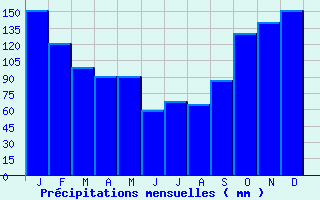 | Jan | Fev | Mars | Avr | Mai | Juin | Juil | Aout | Sept | Oct | Nov | Dec | Année | | Temp. max. (°C) | 9.4 | 9.7 | 11.9 | 13.9 | 17 | 19.8 | 21.7 | 21.9 | 19.8 | 16 | 12.4 | 10 | 15.3 | | Temp. moy. (°C) | 6.8 | 6.7 | 8.5 | 10.1 | 13.1 | 15.8 | 17.7 | 17.8 | 15.8 | 12.8 | 9.5 | 7.4 | 11.9 | | Temp. min. (°C) | 4.2 | 3.8 | 5.2 | 6.3 | 9.2 | 11.7 | 13.6 | 13.6 | 11.8 | 9.7 | 6.6 | 4.7 | 8.4 | | Jan | Fev | Mars | Avr | Mai | Juin | Juil | Aout | Sept | Oct | Nov | Dec | Année | | Jours Tx > 30°C | 0 | 0 | 0 | 0 | 0 | 0.2 | 1 | 0.7 | 0 | 0 | 0 | 0 | 1.8 | | Jours Tx > 25°C | 0 | 0 | 0 | 0.2 | 1.6 | 3.6 | 6.1 | 4.8 | 2 | 0.1 | 0 | 0 | 18.3 | | Jours Tx < 0°C | 0.4 | 0.2 | 0 | 0 | 0 | 0 | 0 | 0 | 0 | 0 | 0 | 0 | 0.6 | | Jours Tn < 0°C | 5 | 5.4 | 1.7 | 0.4 | 0 | 0 | 0 | 0 | 0 | 0.1 | 1.5 | 4.7 | 18.7 | | Jours Tn < -5°C | 0.6 | 0.3 | 0 | 0 | 0 | 0 | 0 | 0 | 0 | 0 | 0 | 0.2 | 1.1 | | Jours Tn < -10°C | 0.1 | 0 | 0 | 0 | 0 | 0 | 0 | 0 | 0 | 0 | 0 | 0 | 0.1 | | | | Jan | Fev | Mars | Avr | Mai | Juin | Juil | Aout | Sept | Oct | Nov | Dec | Année | | RR mensuel (mm) | 151.1 | 120.4 | 98.9 | 90.2 | 90.2 | 59.3 | 67.2 | 64.6 | 86.9 | 130.1 | 139.7 | 151.6 | 1250.2 | | Jan | Fev | Mars | Avr | Mai | Juin | Juil | Aout | Sept | Oct | Nov | Dec | Année | | Jours RR > 1mm | 16.4 | 13 | 13.7 | 12.4 | 11.3 | 8.8 | 9.6 | 9.5 | 9.6 | 14.8 | 15.9 | 15.8 | 150.8 | | Jours RR > 5mm | 9.5 | 7.8 | 6.6 | 6.3 | 5.2 | 3.7 | 3.7 | 4 | 5.3 | 8.6 | 9.2 | 9.4 | 79.4 | | Jours RR > 10mm | 5.4 | 4.5 | 3.4 | 2.8 | 2.9 | 1.8 | 1.9 | 1.9 | 2.9 | 4.4 | 4.9 | 5.6 | 42.3 | | | | Jan | Fev | Mars | Avr | Mai | Juin | Juil | Aout | Sept | Oct | Nov | Dec | Année | | Vent moyen (km/h) | 18 | 16.9 | 17.3 | 16.9 | 15.8 | 14.8 | 14 | 13 | 13.3 | 14.8 | 15.5 | 16.9 | 15.5 | | Jan | Fev | Mars | Avr | Mai | Juin | Juil | Aout | Sept | Oct | Nov | Dec | Année | | Jours rafales >= 58km/h | 11.4 | 8.4 | 9.1 | 7.1 | 4.5 | 2.8 | 1.9 | 2.2 | 3.8 | 7.5 | 8.5 | 10.5 | 77.8 | | Jours rafales >= 100km/h | 0.9 | 0.5 | 0.3 | 0.1 | 0 | 0 | 0 | 0 | 0.1 | 0.2 | 0.4 | 0.6 | 3.2 | | | | Jan | Fev | Mars | Avr | Mai | Juin | Juil | Aout | Sept | Oct | Nov | Dec | Année | | Jours avec brouillard (*) | 5.7 | 5.5 | 5.4 | 3.7 | 3.5 | 4.1 | 4.3 | 5.7 | 5.3 | 6.2 | 5.4 | 5.4 | 60.2 | | Jours avec orage (*) | 0.8 | 0.5 | 0.4 | 0.8 | 1.5 | 1 | 1.4 | 1.5 | 0.7 | 1.1 | 1.4 | 0.6 | 11.7 | | Jours avec grêle (*) | 1.2 | 1.2 | 1.5 | 1.3 | 0.3 | 0 | 0 | 0.1 | 0 | 0.3 | 0.7 | 0.9 | 7.7 | | Jours avec neige (*) | 1.4 | 2.1 | 0.7 | 0.2 | 0 | 0 | 0 | 0 | 0 | 0 | 0.3 | 0.8 | 5.5 | | | | Jan | Fev | Mars | Avr | Mai | Juin | Juil | Aout | Sept | Oct | Nov | Dec | Année | | Ensoleillement (heures) | 65.9 | 85.7 | 126.5 | 170.7 | 194.2 | 215.9 | 194.3 | 194 | 177.3 | 111.5 | 77.9 | 70.1 | 1683.8 |
