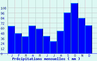 | Jan | Fev | Mars | Avr | Mai | Juin | Juil | Aout | Sept | Oct | Nov | Dec | Année | | Temp. max. (°C) | 11 | 12.4 | 16 | 18.6 | 23 | 27.5 | 31 | 30.5 | 25.7 | 20.4 | 14.5 | 11.3 | 20.2 | | Temp. moy. (°C) | 6.8 | 7.8 | 10.9 | 13.5 | 17.5 | 21.7 | 24.9 | 24.4 | 20.3 | 16 | 10.5 | 7.4 | 15.2 | | Temp. min. (°C) | 2.7 | 3.2 | 5.8 | 8.3 | 12.1 | 15.8 | 18.7 | 18.4 | 14.9 | 11.5 | 6.5 | 3.6 | 10.2 | | Jan | Fev | Mars | Avr | Mai | Juin | Juil | Aout | Sept | Oct | Nov | Dec | Année | | Jours Tx > 30°C | 0 | 0 | 0 | 0 | 0.9 | 8.3 | 20.6 | 17.8 | 3.1 | 0.1 | 0 | 0 | 50.7 | | Jours Tx > 25°C | 0 | 0 | 0.3 | 1.5 | 9.5 | 22.2 | 29.6 | 29.1 | 17.8 | 2.8 | 0 | 0 | 112.8 | | Jours Tx < 0°C | 0.4 | 0.1 | 0 | 0 | 0 | 0 | 0 | 0 | 0 | 0 | 0 | 0 | 0.5 | | Jours Tn < 0°C | 7.6 | 5.8 | 1.5 | 0.1 | 0 | 0 | 0 | 0 | 0 | 0 | 1.9 | 5.5 | 22.3 | | Jours Tn < -5°C | 0.7 | 0.2 | 0 | 0 | 0 | 0 | 0 | 0 | 0 | 0 | 0 | 0.2 | 1.1 | | Jours Tn < -10°C | 0.1 | 0 | 0 | 0 | 0 | 0 | 0 | 0 | 0 | 0 | 0 | 0 | 0.1 | | | | Jan | Fev | Mars | Avr | Mai | Juin | Juil | Aout | Sept | Oct | Nov | Dec | Année | | RR mensuel (mm) | 64.7 | 47.3 | 40.4 | 65.1 | 58.5 | 40.9 | 28.2 | 53.3 | 96.4 | 119.2 | 83.1 | 65.8 | 762.9 | | Jan | Fev | Mars | Avr | Mai | Juin | Juil | Aout | Sept | Oct | Nov | Dec | Année | | Jours RR > 1mm | 5.7 | 5.2 | 4.9 | 6.8 | 5.9 | 4.4 | 2.8 | 3.8 | 5.2 | 7 | 6.8 | 5.8 | 64.2 | | Jours RR > 5mm | 2.7 | 2.5 | 2.1 | 3.8 | 3 | 2.4 | 1.2 | 2.2 | 3.2 | 4.1 | 3.6 | 3.2 | 34 | | Jours RR > 10mm | 1.9 | 1.8 | 1.3 | 2.1 | 1.8 | 1.2 | 0.8 | 1.6 | 2.4 | 3.1 | 2.4 | 1.9 | 22.2 | | | | Jan | Fev | Mars | Avr | Mai | Juin | Juil | Aout | Sept | Oct | Nov | Dec | Année | | Vent moyen (km/h) | 11.5 | 11.5 | 13 | 13.3 | 11.9 | 12.2 | 12.6 | 11.9 | 11.2 | 10.8 | 11.5 | 11.5 | 11.9 | | Jan | Fev | Mars | Avr | Mai | Juin | Juil | Aout | Sept | Oct | Nov | Dec | Année | | Jours rafales >= 58km/h | 7 | 6.4 | 8.8 | 7.6 | 5 | 4.3 | 5.2 | 4.4 | 4.6 | 5.4 | 6.5 | 7.1 | 72.4 | | Jours rafales >= 100km/h | 0.1 | 0.2 | 0.2 | 0.1 | 0 | 0 | 0 | 0 | 0 | 0.1 | 0.3 | 0.1 | 1.1 | | | | Jan | Fev | Mars | Avr | Mai | Juin | Juil | Aout | Sept | Oct | Nov | Dec | Année | | Jours avec brouillard (*) | 1.2 | 1.2 | 1.5 | 0.5 | 0.5 | 0.2 | 0.3 | 0.4 | 1.3 | 0.9 | 1.1 | 0.9 | 9.9 | | Jours avec orage (*) | 0.3 | 0.3 | 0.5 | 1.6 | 2.6 | 3.1 | 3 | 4.1 | 3.6 | 2.2 | 1.3 | 0.4 | 23.1 | | Jours avec grêle (*) | 0 | 0.1 | 0.1 | 0.1 | 0.2 | 0.1 | 0.2 | 0.1 | 0.1 | 0 | 0 | 0 | 1.1 | | Jours avec neige (*) | 0.8 | 0.6 | 0.2 | 0 | 0 | 0 | 0 | 0 | 0 | 0 | 0.3 | 0.5 | 2.4 | | | | Jan | Fev | Mars | Avr | Mai | Juin | Juil | Aout | Sept | Oct | Nov | Dec | Année | | Ensoleillement (heures) | 141.6 | 166.3 | 222.2 | 229.8 | 262 | 311 | 341.1 | 301.6 | 239 | 166.6 | 147.9 | 134 | 2662.9 |