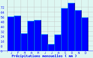 | Jan | Fev | Mars | Avr | Mai | Juin | Juil | Aout | Sept | Oct | Nov | Dec | Année | | Temp. max. (°C) | 11.9 | 13 | 16.2 | 18.4 | 22.1 | 26.8 | 29.5 | 29.1 | 24.8 | 20.7 | 15.5 | 12.1 | 20 | | Temp. moy. (°C) | 7.7 | 8.2 | 11 | 13.4 | 17.2 | 21.3 | 23.8 | 23.5 | 19.5 | 16.3 | 11.1 | 7.8 | 15.1 | | Temp. min. (°C) | 3.4 | 3.5 | 5.8 | 8.4 | 12.2 | 15.7 | 18.1 | 17.9 | 14.2 | 11.9 | 6.7 | 3.6 | 10.2 | | Jan | Fev | Mars | Avr | Mai | Juin | Juil | Aout | Sept | Oct | Nov | Dec | Année | | Jours Tx > 30°C | 0 | 0 | 0 | 0 | 0.5 | 5.2 | 13.2 | 10.7 | 1 | 0.2 | 0 | 0 | 30.7 | | Jours Tx > 25°C | 0 | 0 | 0.4 | 1.4 | 6 | 21.4 | 29.1 | 29.1 | 14.6 | 2.1 | 0 | 0 | 103.9 | | Jours Tx < 0°C | 0 | 0 | 0 | 0 | 0 | 0 | 0 | 0 | 0 | 0 | 0 | 0 | 0 | | Jours Tn < 0°C | 6.7 | 5.4 | 2.1 | 0.1 | 0 | 0 | 0 | 0 | 0 | 0.2 | 2.4 | 7.6 | 24.4 | | Jours Tn < -5°C | 0.5 | 0.5 | 0.1 | 0 | 0 | 0 | 0 | 0 | 0 | 0 | 0.1 | 1.1 | 2.4 | | Jours Tn < -10°C | 0 | 0 | 0 | 0 | 0 | 0 | 0 | 0 | 0 | 0 | 0 | 0 | 0 | | | | Jan | Fev | Mars | Avr | Mai | Juin | Juil | Aout | Sept | Oct | Nov | Dec | Année | | RR mensuel (mm) | 56.5 | 57.8 | 28.6 | 49 | 50.8 | 27.1 | 10.9 | 26.8 | 70 | 79.1 | 67 | 54.9 | 578.5 | | Jan | Fev | Mars | Avr | Mai | Juin | Juil | Aout | Sept | Oct | Nov | Dec | Année | | Jours RR > 1mm | 6.3 | 4.3 | 3.9 | 5.1 | 5.7 | 3.3 | 1.9 | 3.9 | 4.8 | 5.8 | 5.3 | 5.5 | 55.9 | | Jours RR > 5mm | 3.1 | 2.2 | 1.4 | 2.7 | 2.8 | 1.5 | 0.5 | 1.6 | 2.6 | 3 | 2.2 | 2.5 | 26.1 | | Jours RR > 10mm | 1.7 | 1.4 | 0.8 | 1.6 | 1.5 | 0.8 | 0.2 | 0.7 | 1.9 | 2.1 | 1.4 | 1.5 | 15.6 | | | | Jan | Fev | Mars | Avr | Mai | Juin | Juil | Aout | Sept | Oct | Nov | Dec | Année | | Vent moyen (km/h) | 15.1 | 15.8 | 16.6 | 16.6 | 14.8 | 14.4 | 14.8 | 14 | 13.3 | 13.7 | 15.1 | 14.8 | 14.8 | | Jan | Fev | Mars | Avr | Mai | Juin | Juil | Aout | Sept | Oct | Nov | Dec | Année | | Jours rafales >= 58km/h | 6.9 | 9.2 | 8.2 | 8.2 | 4.4 | 5 | -- | 5.3 | 4.8 | 5.6 | 7.5 | 7.4 | -- | | Jours rafales >= 100km/h | 0.1 | 0.1 | 0.1 | 0 | 0 | 0 | -- | 0 | 0 | 0 | 0 | 0.3 | -- |
