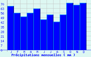 | Jan | Fev | Mars | Avr | Mai | Juin | Juil | Aout | Sept | Oct | Nov | Dec | Année | | Temp. max. (°C) | 7.3 | 8.5 | 12.3 | 15.2 | 19.1 | 22.8 | 25.5 | 25.4 | 21.8 | 16.8 | 10.9 | 7.5 | 16.1 | | Temp. moy. (°C) | 4.6 | 5.2 | 8.1 | 10.4 | 14.1 | 17.4 | 19.7 | 19.6 | 16.4 | 12.7 | 7.7 | 5 | 11.8 | | Temp. min. (°C) | 2 | 1.9 | 3.9 | 5.6 | 9.2 | 12.1 | 14 | 13.7 | 11.1 | 8.6 | 4.6 | 2.5 | 7.5 | | Jan | Fev | Mars | Avr | Mai | Juin | Juil | Aout | Sept | Oct | Nov | Dec | Année | | Jours Tx > 30°C | 0 | 0 | 0 | 0 | 0.2 | 1.8 | 4.8 | 4.2 | 0.8 | 0 | 0 | 0 | 11.7 | | Jours Tx > 25°C | 0 | 0 | 0 | 0.6 | 3 | 9 | 16.2 | 15.3 | 6.1 | 0.9 | 0 | 0 | 51 | | Jours Tx < 0°C | 2.3 | 1.5 | 0 | 0 | 0 | 0 | 0 | 0 | 0 | 0 | 0.2 | 1.2 | 5.2 | | Jours Tn < 0°C | 10.3 | 10.3 | 5.4 | 1.3 | 0 | 0 | 0 | 0 | 0 | 0.5 | 4.7 | 9.9 | 42.4 | | Jours Tn < -5°C | 2.1 | 1.2 | 0.1 | 0 | 0 | 0 | 0 | 0 | 0 | 0 | 0.4 | 1 | 4.8 | | Jours Tn < -10°C | 0.4 | 0.2 | 0 | 0 | 0 | 0 | 0 | 0 | 0 | 0 | 0 | 0.1 | 0.8 | | | | Jan | Fev | Mars | Avr | Mai | Juin | Juil | Aout | Sept | Oct | Nov | Dec | Année | | RR mensuel (mm) | 66.2 | 55.8 | 50.3 | 55.8 | 62.3 | 46.1 | 53.2 | 42.5 | 53.2 | 70.9 | 68 | 71.3 | 695.6 | | Jan | Fev | Mars | Avr | Mai | Juin | Juil | Aout | Sept | Oct | Nov | Dec | Année | | Jours RR > 1mm | 11.9 | 9.5 | 9.9 | 9.6 | 9.8 | 7 | 6.9 | 6.2 | 7.8 | 10.5 | 11.2 | 11.4 | 111.6 | | Jours RR > 5mm | 4.7 | 3.8 | 3.6 | 4.1 | 4.1 | 3.1 | 3.4 | 2.7 | 3.2 | 4.9 | 4.4 | 5 | 47 | | Jours RR > 10mm | 1.9 | 1.6 | 1.3 | 1.5 | 1.7 | 1.2 | 1.7 | 1.1 | 1.5 | 2.4 | 1.9 | 2.2 | 20 | | | | Jan | Fev | Mars | Avr | Mai | Juin | Juil | Aout | Sept | Oct | Nov | Dec | Année | | Jours avec brouillard (*) | 7.3 | 5 | -- | 1.8 | 1.6 | 1.3 | 0.7 | 1.6 | 2.6 | 5.5 | 7.1 | 8.4 | -- | | Jours avec orage (*) | 0.3 | 0.1 | -- | 1.3 | 3.5 | 3.2 | 4.2 | 3.2 | 1.4 | 0.9 | 0.2 | 0.2 | -- | | Jours avec grêle (*) | 0.1 | 0.1 | -- | 0.3 | 0.1 | 0.2 | 0 | 0 | 0 | 0 | 0 | 0.1 | -- | | Jours avec neige (*) | 1.8 | 3.1 | -- | 0.4 | 0 | 0 | 0 | 0 | 0 | 0 | 0.5 | 1.5 | -- | | | | Jan | Fev | Mars | Avr | Mai | Juin | Juil | Aout | Sept | Oct | Nov | Dec | Année | | Ensoleillement (heures) | 69.9 | 90.3 | 144.2 | 178.5 | 205.6 | 228 | 239.4 | 236.4 | 184.7 | 120.6 | 76.7 | 59.2 | 1833.3 |