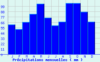 | Jan | Fev | Mars | Avr | Mai | Juin | Juil | Aout | Sept | Oct | Nov | Dec | Année | | Temp. max. (°C) | 5.9 | 7.8 | 12 | 15.3 | 19.9 | 23.8 | 26.9 | 26.4 | 21.8 | 16.9 | 10.2 | 6.4 | 16.2 | | Temp. moy. (°C) | 2.4 | 3.7 | 7 | 9.8 | 14.4 | 17.9 | 20.5 | 20.2 | 16.3 | 12.3 | 6.5 | 3.2 | 11.2 | | Temp. min. (°C) | -1.2 | -0.4 | 2 | 4.4 | 8.9 | 12 | 14.2 | 14 | 10.9 | 7.8 | 2.7 | -0.1 | 6.3 | | Jan | Fev | Mars | Avr | Mai | Juin | Juil | Aout | Sept | Oct | Nov | Dec | Année | | Jours Tx > 30°C | 0 | 0 | 0 | 0 | 0.1 | 2.5 | 8 | 6.8 | 0.5 | 0 | 0 | 0 | 18 | | Jours Tx > 25°C | 0 | 0 | 0 | 0.3 | 4.3 | 12.8 | 20.9 | 19.3 | 7.9 | 0.8 | 0 | 0 | 66.4 | | Jours Tx < 0°C | 3.4 | 1.7 | 0.2 | 0 | 0 | 0 | 0 | 0 | 0 | 0 | 0.5 | 2.2 | 8 | | Jours Tn < 0°C | 17.9 | 15 | 9.6 | 2.9 | 0.2 | 0 | 0 | 0 | 0 | 1.2 | 7.2 | 15 | 69.1 | | Jours Tn < -5°C | 5.4 | 3.7 | 0.9 | 0 | 0 | 0 | 0 | 0 | 0 | 0 | 1 | 3.7 | 14.8 | | Jours Tn < -10°C | 1.2 | 0.3 | 0.1 | 0 | 0 | 0 | 0 | 0 | 0 | 0 | 0 | 0.6 | 2.2 | | | | Jan | Fev | Mars | Avr | Mai | Juin | Juil | Aout | Sept | Oct | Nov | Dec | Année | | RR mensuel (mm) | 61.3 | 51.6 | 66.3 | 83 | 104.1 | 75.2 | 59.3 | 67.2 | 105.7 | 105.8 | 87.7 | 67.1 | 934.3 | | Jan | Fev | Mars | Avr | Mai | Juin | Juil | Aout | Sept | Oct | Nov | Dec | Année | | Jours RR > 1mm | 9.4 | 8 | 9.4 | 9.7 | 11 | 8.5 | 6.2 | 7.4 | 7.7 | 10.1 | 9.6 | 9.5 | 106.4 | | Jours RR > 5mm | 4.3 | 3.4 | 4.1 | 5.5 | 6.1 | 4.5 | 3.3 | 3.9 | 4.7 | 6.1 | 4.9 | 4.2 | 55 | | Jours RR > 10mm | 1.5 | 1.3 | 1.9 | 2.9 | 3.4 | 2.5 | 1.9 | 2 | 3.1 | 3.7 | 2.5 | 2 | 28.7 | | | | Jan | Fev | Mars | Avr | Mai | Juin | Juil | Aout | Sept | Oct | Nov | Dec | Année | | Vent moyen (km/h) | 12.2 | 11.9 | 11.9 | 11.5 | 10.4 | 10.4 | 10.4 | 9.7 | 9.7 | 10.4 | 11.5 | 12.2 | 11.2 | | Jan | Fev | Mars | Avr | Mai | Juin | Juil | Aout | Sept | Oct | Nov | Dec | Année | | Jours rafales >= 58km/h | 2.9 | 3.2 | 4.6 | 5.1 | -- | -- | 2.8 | -- | -- | -- | 3.4 | 3.8 | -- | | Jours rafales >= 100km/h | 0 | 0 | 0 | 0 | -- | -- | 0 | -- | -- | -- | 0 | 0.2 | -- | | | | Jan | Fev | Mars | Avr | Mai | Juin | Juil | Aout | Sept | Oct | Nov | Dec | Année | | Ensoleillement (heures) | 95 | 111.7 | 169.8 | 183 | 219.2 | 255.4 | 289.8 | 255.5 | 193.1 | 137.5 | 84.5 | 71.6 | 2065.9 |