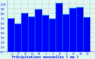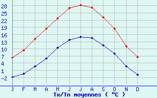 | Jan | Fev | Mars | Avr | Mai | Juin | Juil | Aout | Sept | Oct | Nov | Dec | Année | | Temp. max. (°C) | 6.3 | 9.4 | 14.2 | 18.5 | 22.7 | 27 | 28.4 | 27.2 | 23.2 | 18.5 | 11 | 6.5 | 17.8 | | Temp. moy. (°C) | 2.2 | 4.5 | 8.5 | 12.2 | 16.6 | 20.4 | 21.7 | 20.9 | 17.3 | 13.2 | 6.9 | 2.8 | 12.3 | | Temp. min. (°C) | -1.9 | -0.5 | 2.7 | 6 | 10.5 | 13.8 | 14.9 | 14.6 | 11.5 | 7.9 | 2.7 | -0.9 | 6.8 | | Jan | Fev | Mars | Avr | Mai | Juin | Juil | Aout | Sept | Oct | Nov | Dec | Année | | Jours Tx > 30°C | 0 | 0 | 0 | 0 | 1.6 | 9.3 | 12.1 | 8.3 | 1.1 | 0.1 | 0 | 0 | 32.5 | | Jours Tx > 25°C | 0 | 0 | 0.2 | 2.6 | 11.6 | 20.6 | 24.7 | 22.7 | 11.2 | 1.8 | 0 | 0 | 95.2 | | Jours Tx < 0°C | 1.6 | 0.6 | 0 | 0 | 0 | 0 | 0 | 0 | 0 | 0 | 0.1 | 1.3 | 3.5 | | Jours Tn < 0°C | 20.7 | 17.3 | 8.1 | 0.6 | 0 | 0 | 0 | 0 | 0 | 1 | 7.6 | 17.6 | 72.8 | | Jours Tn < -5°C | 7.1 | 2.8 | 0.4 | 0 | 0 | 0 | 0 | 0 | 0 | 0 | 0.8 | 5.2 | 16.3 | | Jours Tn < -10°C | 0.6 | 0 | 0 | 0 | 0 | 0 | 0 | 0 | 0 | 0 | 0.1 | 0.3 | 1.1 | | | | Jan | Fev | Mars | Avr | Mai | Juin | Juil | Aout | Sept | Oct | Nov | Dec | Année | | RR mensuel (mm) | 69.7 | 58.4 | 80.8 | 73.4 | 88.7 | 76.6 | 69.1 | 102.3 | 78.3 | 91.6 | 93 | 72.2 | 954.1 | | Jan | Fev | Mars | Avr | Mai | Juin | Juil | Aout | Sept | Oct | Nov | Dec | Année | | Jours RR > 1mm | 8.8 | 6.7 | 10.1 | 9.5 | 11.4 | 8.3 | 7.3 | 10.4 | 7.3 | 9.3 | 9.7 | 9.2 | 108 | | Jours RR > 5mm | 4.5 | 3.7 | 5.5 | 5 | 6.3 | 4.2 | 4.2 | 6 | 4.3 | 4.9 | 5.7 | 5.1 | 59.2 | | Jours RR > 10mm | 2.4 | 2.3 | 2.6 | 2.6 | 3 | 3.1 | 2.3 | 3.8 | 2.7 | 3.7 | 2.9 | 2.4 | 33.7 | | | | Jan | Fev | Mars | Avr | Mai | Juin | Juil | Aout | Sept | Oct | Nov | Dec | Année | | Vent moyen (km/h) | 4.7 | 5 | 6.1 | 6.5 | 5.8 | 5.8 | 5.8 | 5 | 4.3 | 4.3 | 4.7 | 4.7 | 5.4 | | Jan | Fev | Mars | Avr | Mai | Juin | Juil | Aout | Sept | Oct | Nov | Dec | Année | | Jours rafales >= 58km/h | 1 | 1.2 | 1.6 | 1.3 | 1.5 | 1.1 | 1.2 | 1.1 | 0.5 | -- | 1.6 | 1 | -- | | Jours rafales >= 100km/h | 0 | 0 | 0 | 0 | 0 | 0 | 0 | 0 | 0 | -- | 0 | 0 | -- | | | | Jan | Fev | Mars | Avr | Mai | Juin | Juil | Aout | Sept | Oct | Nov | Dec | Année | | Ensoleillement (heures) | 88.8 | 112.5 | -- | 178.3 | 201.3 | 264.3 | 273.7 | 234 | 195.9 | 135.7 | 75 | 68.1 | -- |