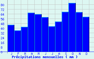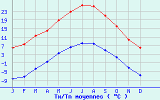 | Jan | Fev | Mars | Avr | Mai | Juin | Juil | Aout | Sept | Oct | Nov | Dec | Année | | Temp. max. (°C) | 5.9 | 7.6 | 11.6 | 14 | 18.7 | 22.8 | 25.9 | 25.4 | 21 | 16.1 | 9.8 | 6 | 15.4 | | Temp. moy. (°C) | -1.3 | 0.1 | 3.9 | 6.8 | 11.1 | 14.5 | 17.1 | 16.6 | 13 | 8.8 | 3.3 | -0.4 | 7.8 | | Temp. min. (°C) | -8.5 | -7.4 | -3.8 | -0.4 | 3.5 | 6.2 | 8.2 | 7.9 | 4.9 | 1.6 | -3.3 | -6.8 | 0.2 | | Jan | Fev | Mars | Avr | Mai | Juin | Juil | Aout | Sept | Oct | Nov | Dec | Année | | Jours Tx > 30°C | 0 | 0 | 0 | 0 | 0 | 1.3 | 3.3 | 2.5 | 0.2 | 0 | 0 | 0 | 7.3 | | Jours Tx > 25°C | 0 | 0 | 0 | 0 | 2.6 | 10.9 | 20.6 | 18.7 | 5.4 | 0.3 | 0 | 0 | 58.4 | | Jours Tx < 0°C | 2.4 | 1.2 | 0.1 | 0 | 0 | 0 | 0 | 0 | 0 | 0 | 0.4 | 1.9 | 5.9 | | Jours Tn < 0°C | 29.6 | 26.8 | 26 | 17.7 | 4.5 | 1.2 | 0.1 | 0.2 | 2.5 | 11.8 | 23.6 | 28.5 | 172.4 | | Jours Tn < -5°C | 22.9 | 18.8 | 11.1 | 2 | 0.1 | 0 | 0 | 0 | 0 | 1.4 | 10.5 | 19.4 | 86.1 | | Jours Tn < -10°C | 12.8 | 8 | 1.7 | 0 | 0 | 0 | 0 | 0 | 0 | 0.1 | 1.8 | 7.6 | 32.1 | | | | Jan | Fev | Mars | Avr | Mai | Juin | Juil | Aout | Sept | Oct | Nov | Dec | Année | | RR mensuel (mm) | 45.2 | 35.7 | 41.8 | 66 | 63.7 | 58.6 | 42.7 | 51.1 | 67.6 | 82.8 | 66.9 | 59 | 681.1 | | Jan | Fev | Mars | Avr | Mai | Juin | Juil | Aout | Sept | Oct | Nov | Dec | Année | | Jours RR > 1mm | 5.7 | 4.4 | 5.1 | 7.9 | 8.8 | 8.2 | 6 | 6.6 | 6 | 7.5 | 6.5 | 5.9 | 78.5 | | Jours RR > 5mm | 2.7 | 2.4 | 2.9 | 4.2 | 4.2 | 3.6 | 2.7 | 3 | 3.4 | 4.8 | 3.9 | 3.5 | 41.3 | | Jours RR > 10mm | 1.6 | 1.3 | 1.3 | 2.5 | 2.1 | 1.9 | 1.6 | 1.8 | 2.3 | 2.8 | 2.4 | 1.8 | 23.3 | | | | Jan | Fev | Mars | Avr | Mai | Juin | Juil | Aout | Sept | Oct | Nov | Dec | Année | | Vent moyen (km/h) | 2.5 | 3.6 | 4.7 | 5.4 | 5 | 5 | 5.4 | 4.7 | 4.3 | 3.6 | -- | 2.9 | -- | | Jan | Fev | Mars | Avr | Mai | Juin | Juil | Aout | Sept | Oct | Nov | Dec | Année | | Jours rafales >= 58km/h | 0.4 | 0.6 | 0.7 | 0.7 | 0.8 | 0.3 | 0.6 | 0.3 | 0.2 | 0.1 | -- | 0.8 | -- | | Jours rafales >= 100km/h | 0 | 0 | 0 | 0 | 0 | 0 | 0 | 0 | 0 | 0 | -- | 0 | -- |