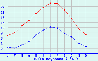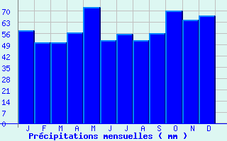 | Jan | Fev | Mars | Avr | Mai | Juin | Juil | Aout | Sept | Oct | Nov | Dec | Année | | Temp. max. (°C) | 7.6 | 9 | 13.1 | 16.1 | 20 | 23.5 | 26.1 | 25.9 | 22.2 | 17.2 | 11.2 | 7.9 | 16.7 | | Temp. moy. (°C) | 4.1 | 4.6 | 7.6 | 10 | 13.9 | 17 | 19.2 | 18.8 | 15.4 | 12 | 7.1 | 4.5 | 11.2 | | Temp. min. (°C) | 0.7 | 0.3 | 2 | 3.9 | 7.7 | 10.6 | 12.4 | 11.7 | 8.7 | 6.8 | 3 | 1.1 | 5.8 | | Jan | Fev | Mars | Avr | Mai | Juin | Juil | Aout | Sept | Oct | Nov | Dec | Année | | Jours Tx > 30°C | 0 | 0 | 0 | 0 | 0.4 | 2.9 | 6.2 | 5.4 | 1.3 | 0 | 0 | 0 | 16.2 | | Jours Tx > 25°C | 0 | 0 | 0.1 | 1.1 | 5.4 | 11.1 | 18 | 16.9 | 6.9 | 1.2 | 0 | 0 | 60.6 | | Jours Tx < 0°C | 1.9 | 1 | 0 | 0 | 0 | 0 | 0 | 0 | 0 | 0 | 0.2 | 0.9 | 4.1 | | Jours Tn < 0°C | 13.6 | 14.1 | 11.3 | 5.8 | 0.7 | 0 | 0 | 0 | 0.4 | 3.3 | 9.4 | 13.4 | 72 | | Jours Tn < -5°C | 4.2 | 4.4 | 2.5 | 0.2 | 0 | 0 | 0 | 0 | 0 | 0.3 | 1.8 | 3.6 | 17 | | Jours Tn < -10°C | 1 | 0.7 | 0 | 0 | 0 | 0 | 0 | 0 | 0 | 0 | 0.2 | 0.4 | 2.3 | | | | Jan | Fev | Mars | Avr | Mai | Juin | Juil | Aout | Sept | Oct | Nov | Dec | Année | | RR mensuel (mm) | 57.8 | 50.2 | 50.1 | 56.4 | 72.3 | 51.5 | 55.5 | 51.6 | 55.9 | 70.1 | 64.2 | 66.7 | 702.3 | | Jan | Fev | Mars | Avr | Mai | Juin | Juil | Aout | Sept | Oct | Nov | Dec | Année | | Jours RR > 1mm | 11 | 9.4 | 9.7 | 10.3 | 10.4 | 7.8 | 7.7 | 7.2 | 8 | 10.7 | 10.6 | 11 | 113.8 | | Jours RR > 5mm | 4.1 | 3.4 | 3.6 | 3.8 | 4.7 | 3.5 | 4 | 3.4 | 3.6 | 4.6 | 4.3 | 4.8 | 48 | | Jours RR > 10mm | 1.2 | 1.2 | 1.2 | 1.3 | 2 | 1.4 | 1.9 | 1.6 | 1.6 | 2.2 | 1.7 | 2 | 19.3 | | | | Jan | Fev | Mars | Avr | Mai | Juin | Juil | Aout | Sept | Oct | Nov | Dec | Année | | Vent moyen (km/h) | 11.5 | 10.8 | 10.8 | 10.4 | 9.4 | 8.6 | 8.3 | 7.6 | 7.9 | 9 | 9.4 | 10.4 | 9.4 | | Jan | Fev | Mars | Avr | Mai | Juin | Juil | Aout | Sept | Oct | Nov | Dec | Année | | Jours rafales >= 58km/h | 4.1 | 3.4 | 3.8 | 2.2 | 1.9 | 1.1 | 1.6 | 1 | 1.3 | 2.6 | 2.1 | 3.5 | 28.6 | | Jours rafales >= 100km/h | 0 | 0.1 | 0.1 | 0 | 0 | 0 | 0 | 0.1 | 0 | 0 | 0 | 0.1 | 0.5 | | | | Jan | Fev | Mars | Avr | Mai | Juin | Juil | Aout | Sept | Oct | Nov | Dec | Année | | Jours avec brouillard (*) | 4.7 | 3.6 | 2.8 | 3.1 | 3 | 2.5 | 2.4 | 4.5 | 5.2 | 6.2 | 6.3 | 5 | 49.2 | | Jours avec orage (*) | 0.1 | 0.2 | 0.5 | 1.1 | 3.5 | 3.4 | 4.5 | 3.2 | 1.5 | 0.9 | 0 | 0.2 | 19.1 | | Jours avec grêle (*) | 0.1 | 0.2 | 0.6 | 0.4 | 0.5 | 0 | 0.1 | 0 | 0 | 0 | 0 | 0.1 | 2 | | Jours avec neige (*) | -- | 3.1 | 1 | 0.3 | 0 | 0 | 0 | 0 | 0 | 0 | 0.6 | -- | -- | | | | Jan | Fev | Mars | Avr | Mai | Juin | Juil | Aout | Sept | Oct | Nov | Dec | Année | | Ensoleillement (heures) | 64 | 84.7 | 142.9 | 171.8 | 197.6 | 213.9 | 229.8 | 225.1 | 180.9 | 115.6 | 67.1 | 50.4 | 1743.6 |