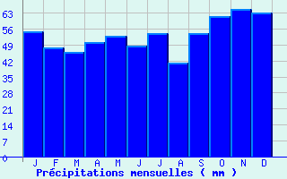 | Jan | Fev | Mars | Avr | Mai | Juin | Juil | Aout | Sept | Oct | Nov | Dec | Année | | Temp. max. (°C) | 7.1 | 8.6 | 12.7 | 15.5 | 19.8 | 23.3 | 25.9 | 26 | 21.6 | 16.6 | 10.7 | 7.1 | 16.3 | | Temp. moy. (°C) | 4.3 | 5 | 8 | 10.2 | 14.2 | 17.3 | 19.6 | 19.7 | 16 | 12.3 | 7.4 | 4.4 | 11.6 | | Temp. min. (°C) | 1.5 | 1.4 | 3.3 | 4.9 | 8.6 | 11.4 | 13.2 | 13.5 | 10.4 | 7.9 | 4.2 | 1.7 | 6.9 | | Jan | Fev | Mars | Avr | Mai | Juin | Juil | Aout | Sept | Oct | Nov | Dec | Année | | Jours Tx > 30°C | 0 | 0 | 0 | 0 | 0.1 | 2.3 | 6 | 5.5 | 0.8 | 0 | 0 | 0 | 14.8 | | Jours Tx > 25°C | 0 | 0 | 0 | 0.6 | 4 | 10.2 | 17.1 | 17.3 | 5.1 | 0.6 | 0 | 0 | 54.8 | | Jours Tx < 0°C | 2.3 | 1.1 | 0 | 0 | 0 | 0 | 0 | 0 | 0 | 0 | 0.2 | 1.6 | 5.2 | | Jours Tn < 0°C | 11.6 | 11 | 6.5 | 2.2 | 0.2 | 0 | 0 | 0 | 0 | 1.1 | 5.2 | 12.2 | 49.9 | | Jours Tn < -5°C | 2.4 | 1.2 | 0.1 | 0 | 0 | 0 | 0 | 0 | 0 | 0 | 0.5 | 1.5 | 5.7 | | Jours Tn < -10°C | 0.3 | 0.2 | 0.1 | 0 | 0 | 0 | 0 | 0 | 0 | 0 | 0.1 | 0.1 | 0.6 | | | | Jan | Fev | Mars | Avr | Mai | Juin | Juil | Aout | Sept | Oct | Nov | Dec | Année | | RR mensuel (mm) | 54.9 | 47.6 | 45.9 | 50.3 | 53 | 48.4 | 53.9 | 41.2 | 54.2 | 61.6 | 64.9 | 63.3 | 639.2 | | Jan | Fev | Mars | Avr | Mai | Juin | Juil | Aout | Sept | Oct | Nov | Dec | Année | | Jours RR > 1mm | 10.3 | 9 | 8.7 | 9.7 | 9.1 | 7.5 | 8.1 | 6.8 | 7.9 | 10.1 | 11.5 | 10.9 | 109.4 | | Jours RR > 5mm | 3.9 | 3.3 | 3.1 | 3.9 | 3.7 | 2.9 | 3.5 | 2.8 | 3.8 | 4.2 | 4.3 | 4.7 | 44.1 | | Jours RR > 10mm | 1.4 | 1.1 | 1.1 | 1 | 1.4 | 1.6 | 1.8 | 1.4 | 1.6 | 1.9 | 1.8 | 1.8 | 17.8 | | | | Jan | Fev | Mars | Avr | Mai | Juin | Juil | Aout | Sept | Oct | Nov | Dec | Année | | Vent moyen (km/h) | 17.3 | 15.8 | 15.5 | 14.8 | 13.3 | 12.6 | 13 | 12.6 | 13.3 | 14.4 | 14.8 | 16.2 | 14.4 | | Jan | Fev | Mars | Avr | Mai | Juin | Juil | Aout | Sept | Oct | Nov | Dec | Année | | Jours rafales >= 58km/h | 6.5 | 5 | 5 | 4.7 | 3 | 2.2 | 2.9 | 2.1 | 2.3 | 3.8 | 3.5 | 5 | 45.8 | | Jours rafales >= 100km/h | 0.3 | 0.3 | 0.1 | 0 | 0.1 | 0.1 | 0.2 | 0.1 | 0 | 0.2 | 0 | 0.2 | 1.3 | | | | Jan | Fev | Mars | Avr | Mai | Juin | Juil | Aout | Sept | Oct | Nov | Dec | Année | | Ensoleillement (heures) | 64.3 | 88.3 | 142.2 | 177.6 | 202.2 | 201.9 | 217.4 | 224.2 | 179.5 | 120 | 71.7 | 54.5 | 1743.6 |