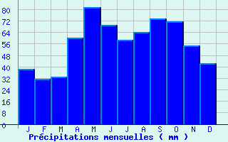 | Jan | Fev | Mars | Avr | Mai | Juin | Juil | Aout | Sept | Oct | Nov | Dec | Année | | Temp. max. (°C) | 4.9 | 6.5 | 9.8 | 12.5 | 17 | 21 | 24.2 | 24 | 19.5 | 14.8 | 8.7 | 5.6 | 14.1 | | Temp. moy. (°C) | 0.8 | 1.9 | 4.6 | 7 | 11.2 | 14.7 | 17.3 | 17.1 | 13.3 | 9.9 | 4.5 | 1.7 | 8.7 | | Temp. min. (°C) | -3.3 | -2.7 | -0.7 | 1.6 | 5.3 | 8.4 | 10.5 | 10.1 | 7.1 | 4.9 | 0.4 | -2.3 | 3.3 | | Jan | Fev | Mars | Avr | Mai | Juin | Juil | Aout | Sept | Oct | Nov | Dec | Année | | Jours Tx > 30°C | 0 | 0 | 0 | 0 | 0 | 1.3 | 2.5 | 3.2 | 0.4 | 0 | 0 | 0 | 7.4 | | Jours Tx > 25°C | 0 | 0 | 0 | 0 | 1.3 | 7.2 | 14.9 | 13.3 | 3.9 | 0.1 | 0 | 0 | 40.7 | | Jours Tx < 0°C | 5.3 | 3.5 | 0.9 | 0.1 | 0 | 0 | 0 | 0 | 0 | 0 | 1.6 | 4.6 | 15.9 | | Jours Tn < 0°C | 22.4 | 19.7 | 17.4 | 9.7 | 1.8 | 0.2 | 0 | 0 | 0.7 | 4 | 13.7 | 20.8 | 110.5 | | Jours Tn < -5°C | 10.6 | 8.6 | 4.6 | 0.7 | 0 | 0 | 0 | 0 | 0 | 0.4 | 4 | 8.6 | 37.4 | | Jours Tn < -10°C | 2.9 | 2 | 0.3 | 0 | 0 | 0 | 0 | 0 | 0 | 0 | 0.5 | 2 | 7.8 | | | | Jan | Fev | Mars | Avr | Mai | Juin | Juil | Aout | Sept | Oct | Nov | Dec | Année | | RR mensuel (mm) | 38.5 | 31.3 | 33 | 60.2 | 81.7 | 69.1 | 58.6 | 64 | 73.4 | 71.4 | 54.7 | 42.4 | 678.3 | | Jan | Fev | Mars | Avr | Mai | Juin | Juil | Aout | Sept | Oct | Nov | Dec | Année | | Jours RR > 1mm | 7.2 | 6.6 | 7.2 | 9.8 | 10.6 | 8.3 | 6.7 | 7.8 | 7.7 | 9.2 | 8.2 | 7 | 96.2 | | Jours RR > 5mm | 2.7 | 1.7 | 2 | 3.7 | 5.6 | 4.1 | 3.6 | 3.6 | 4.1 | 4.3 | 3.3 | 2.3 | 40.8 | | Jours RR > 10mm | 0.9 | 0.7 | 0.7 | 1.6 | 2.7 | 2.3 | 2.1 | 1.8 | 2.7 | 2.3 | 1.5 | 1 | 20.5 | | | | Jan | Fev | Mars | Avr | Mai | Juin | Juil | Aout | Sept | Oct | Nov | Dec | Année | | Vent moyen (km/h) | 10.1 | 11.2 | 11.9 | 11.9 | 10.1 | 9.4 | 9.7 | 8.6 | 8.6 | 9.4 | 10.1 | 9.7 | 10.1 | | Jan | Fev | Mars | Avr | Mai | Juin | Juil | Aout | Sept | Oct | Nov | Dec | Année | | Jours rafales >= 58km/h | 6.1 | 5.4 | 5.8 | 5.9 | 3.5 | 1.9 | 2.6 | 2.5 | 2.3 | 4.1 | 5 | 5.4 | 50.6 | | Jours rafales >= 100km/h | 0.2 | 0.3 | 0.1 | 0.1 | 0 | 0 | 0.1 | 0 | 0 | 0 | 0 | 0.2 | 1.1 | | | | Jan | Fev | Mars | Avr | Mai | Juin | Juil | Aout | Sept | Oct | Nov | Dec | Année | | Ensoleillement (heures) | 93.7 | 111.1 | 166.9 | 163.8 | 191 | 221.4 | 261.2 | 234.6 | 179.7 | 126.7 | 84 | 75.5 | 1909.6 |