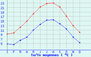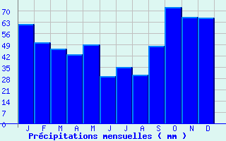 | Jan | Fev | Mars | Avr | Mai | Juin | Juil | Aout | Sept | Oct | Nov | Dec | Année | | Temp. max. (°C) | 9.1 | 9.7 | 12.2 | 14.9 | 18.2 | 21.2 | 22.8 | 23.1 | 21.3 | 17.2 | 12.9 | 9.9 | 16.1 | | Temp. moy. (°C) | 6.9 | 7.1 | 9.3 | 11.3 | 14.6 | 17.3 | 19.1 | 19.3 | 17.5 | 14.3 | 10.4 | 7.6 | 12.9 | | Temp. min. (°C) | 4.7 | 4.5 | 6.4 | 7.8 | 11 | 13.5 | 15.4 | 15.5 | 13.7 | 11.4 | 7.8 | 5.3 | 9.8 | | Jan | Fev | Mars | Avr | Mai | Juin | Juil | Aout | Sept | Oct | Nov | Dec | Année | | Jours Tx > 30°C | 0 | 0 | 0 | 0 | 0 | 0.8 | 2.1 | 1.8 | 0.4 | 0 | 0 | 0 | 5.1 | | Jours Tx > 25°C | 0 | 0 | 0 | 0.2 | 3 | 6.4 | 8.3 | 7.9 | 4.7 | 0.2 | 0 | 0 | 30.8 | | Jours Tx < 0°C | 0.6 | 0.2 | 0 | 0 | 0 | 0 | 0 | 0 | 0 | 0 | 0 | 0 | 0.8 | | Jours Tn < 0°C | 4.2 | 4.5 | 0.8 | 0.1 | 0 | 0 | 0 | 0 | 0 | 0 | 1.3 | 3.3 | 14.2 | | Jours Tn < -5°C | 0.8 | 0.4 | 0 | 0 | 0 | 0 | 0 | 0 | 0 | 0 | 0 | 0.1 | 1.3 | | Jours Tn < -10°C | 0.1 | 0 | 0 | 0 | 0 | 0 | 0 | 0 | 0 | 0 | 0 | 0 | 0.1 | | | | Jan | Fev | Mars | Avr | Mai | Juin | Juil | Aout | Sept | Oct | Nov | Dec | Année | | RR mensuel (mm) | 62 | 50.2 | 46.6 | 42.9 | 49 | 29.3 | 35.1 | 30.1 | 48.4 | 72.6 | 66.3 | 65.9 | 598.4 | | Jan | Fev | Mars | Avr | Mai | Juin | Juil | Aout | Sept | Oct | Nov | Dec | Année | | Jours RR > 1mm | 12.2 | 9.1 | 9.2 | 8.6 | 8.4 | 5.9 | 6.4 | 5.5 | 7.4 | 11.7 | 11.9 | 12.6 | 108.8 | | Jours RR > 5mm | 4.5 | 3.6 | 2.7 | 2.8 | 2.9 | 1.7 | 2 | 2 | 3.4 | 4.6 | 4.5 | 4.5 | 39.2 | | Jours RR > 10mm | 1.5 | 1.1 | 1 | 0.9 | 1.4 | 0.6 | 0.9 | 0.6 | 1.4 | 2.1 | 1.6 | 1.5 | 14.6 | | | | Jan | Fev | Mars | Avr | Mai | Juin | Juil | Aout | Sept | Oct | Nov | Dec | Année | | Vent moyen (km/h) | 24.5 | 22.3 | 21.6 | 22.3 | 22.7 | 20.9 | 21.6 | 19.1 | 19.8 | 23 | 22.7 | 24.1 | 22 | | Jan | Fev | Mars | Avr | Mai | Juin | Juil | Aout | Sept | Oct | Nov | Dec | Année | | Jours rafales >= 58km/h | -- | -- | 9 | -- | 8.9 | 5.9 | 6.2 | 4.9 | 5.5 | 10.3 | -- | -- | -- | | Jours rafales >= 100km/h | -- | -- | 0.5 | -- | 0.9 | 0 | 0.1 | 0 | 0.3 | 1.7 | -- | -- | -- |