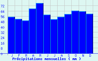 | Jan | Fev | Mars | Avr | Mai | Juin | Juil | Aout | Sept | Oct | Nov | Dec | Année | | Temp. max. (°C) | 9.2 | 11.3 | 15 | 17.5 | 21.5 | 25 | 27.6 | 27.6 | 24.5 | 19.6 | 13.2 | 9.5 | 18.5 | | Temp. moy. (°C) | 5.6 | 6.8 | 9.7 | 12 | 15.9 | 19.3 | 21.5 | 21.5 | 18.4 | 14.7 | 9.3 | 6.1 | 13.4 | | Temp. min. (°C) | 2.1 | 2.4 | 4.4 | 6.6 | 10.3 | 13.6 | 15.4 | 15.3 | 12.3 | 9.7 | 5.4 | 2.8 | 8.4 | | Jan | Fev | Mars | Avr | Mai | Juin | Juil | Aout | Sept | Oct | Nov | Dec | Année | | Jours Tx > 30°C | 0 | 0 | 0 | 0 | 0.8 | 4.5 | 9.1 | 8.4 | 2.9 | 0.2 | 0 | 0 | 26 | | Jours Tx > 25°C | 0 | 0 | 0.2 | 1.2 | 7.3 | 14.9 | 22.2 | 22.2 | 13.6 | 3.3 | 0 | 0 | 84.9 | | Jours Tx < 0°C | 1.3 | 0.1 | 0 | 0 | 0 | 0 | 0 | 0 | 0 | 0 | 0.1 | 0.7 | 2.1 | | Jours Tn < 0°C | 9.6 | 9 | 5 | 0.7 | 0 | 0 | 0 | 0 | 0 | 0.6 | 4.1 | 9 | 38 | | Jours Tn < -5°C | 1.8 | 1 | 0.3 | 0 | 0 | 0 | 0 | 0 | 0 | 0 | 0.6 | 1.3 | 5 | | Jours Tn < -10°C | 0.3 | 0 | 0 | 0 | 0 | 0 | 0 | 0 | 0 | 0 | 0 | 0.1 | 0.5 | | | | Jan | Fev | Mars | Avr | Mai | Juin | Juil | Aout | Sept | Oct | Nov | Dec | Année | | RR mensuel (mm) | 55.1 | 52.1 | 49.8 | 67.6 | 76.1 | 58.4 | 51.3 | 55 | 59.3 | 64.3 | 63.4 | 59.8 | 712.2 | | Jan | Fev | Mars | Avr | Mai | Juin | Juil | Aout | Sept | Oct | Nov | Dec | Année | | Jours RR > 1mm | 9.9 | 8.3 | 9 | 10.8 | 10.6 | 8.1 | 6.3 | 7.1 | 7.9 | 9.5 | 10 | 9.8 | 107.1 | | Jours RR > 5mm | 3.9 | 3.5 | 3.5 | 4.8 | 5 | 3.7 | 2.7 | 3.2 | 3.9 | 4.4 | 4.4 | 4.2 | 47.2 | | Jours RR > 10mm | 1.5 | 1.6 | 1.3 | 2 | 2.2 | 1.9 | 1.7 | 1.9 | 1.9 | 2.1 | 1.9 | 1.6 | 21.6 | | | | Jan | Fev | Mars | Avr | Mai | Juin | Juil | Aout | Sept | Oct | Nov | Dec | Année | | Vent moyen (km/h) | 9.4 | 10.1 | 10.4 | 10.1 | 9 | 8.6 | 8.6 | 7.9 | 7.6 | 8.6 | 9 | 9.4 | 9 | | Jan | Fev | Mars | Avr | Mai | Juin | Juil | Aout | Sept | Oct | Nov | Dec | Année | | Jours rafales >= 58km/h | 2.4 | 2.8 | -- | 3.6 | 1.7 | 1.1 | 1.4 | 1.1 | 1.2 | 1.9 | 1.4 | 2.4 | -- | | Jours rafales >= 100km/h | 0 | 0 | -- | 0 | 0 | 0 | 0 | 0.1 | 0 | 0 | 0 | 0 | -- | | | | Jan | Fev | Mars | Avr | Mai | Juin | Juil | Aout | Sept | Oct | Nov | Dec | Année | | Ensoleillement (heures) | 77.5 | 110.1 | 172.6 | 182.3 | 213.6 | 232.1 | 255.4 | 242.3 | 204.9 | 138.2 | 84 | 69.4 | 1982.4 |