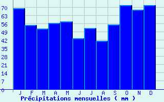 | Jan | Fev | Mars | Avr | Mai | Juin | Juil | Aout | Sept | Oct | Nov | Dec | Année | | Temp. max. (°C) | 8.3 | 9.4 | 12.8 | 15.6 | 19.4 | 23.1 | 25.3 | 25.4 | 22.1 | 17.3 | 11.7 | 8.6 | 16.6 | | Temp. moy. (°C) | 5.5 | 5.9 | 8.6 | 10.8 | 14.5 | 17.7 | 19.8 | 19.7 | 16.8 | 13.2 | 8.5 | 5.8 | 12.3 | | Temp. min. (°C) | 2.8 | 2.5 | 4.4 | 6 | 9.5 | 12.3 | 14.2 | 14.1 | 11.5 | 9.1 | 5.3 | 3 | 7.9 | | Jan | Fev | Mars | Avr | Mai | Juin | Juil | Aout | Sept | Oct | Nov | Dec | Année | | Jours Tx > 30°C | 0 | 0 | 0 | 0 | 0.2 | 2.2 | 4.8 | 4.2 | 1.3 | 0 | 0 | 0 | 12.6 | | Jours Tx > 25°C | 0 | 0 | 0 | 0.5 | 3.8 | 9.3 | 15.2 | 15 | 6.1 | 0.9 | 0 | 0 | 50.8 | | Jours Tx < 0°C | 1.4 | 0.8 | 0 | 0 | 0 | 0 | 0 | 0 | 0 | 0 | 0.2 | 0.5 | 2.9 | | Jours Tn < 0°C | 8.6 | 9 | 4.2 | 0.8 | 0 | 0 | 0 | 0 | 0 | 0.4 | 4 | 8.7 | 35.6 | | Jours Tn < -5°C | 1.8 | 1.1 | 0.1 | 0 | 0 | 0 | 0 | 0 | 0 | 0 | 0.4 | 0.9 | 4.4 | | Jours Tn < -10°C | 0.4 | 0.1 | 0 | 0 | 0 | 0 | 0 | 0 | 0 | 0 | 0 | 0 | 0.5 | | | | Jan | Fev | Mars | Avr | Mai | Juin | Juil | Aout | Sept | Oct | Nov | Dec | Année | | RR mensuel (mm) | 69.2 | 54.8 | 51.6 | 56.6 | 57.9 | 43.2 | 52.1 | 41.3 | 55 | 71.8 | 67.8 | 72 | 693.3 | | Jan | Fev | Mars | Avr | Mai | Juin | Juil | Aout | Sept | Oct | Nov | Dec | Année | | Jours RR > 1mm | 11.6 | 9 | 9.8 | 10.1 | 10.1 | 6.7 | 6.3 | 6.3 | 7.8 | 10.7 | 11.2 | 11.5 | 111.1 | | Jours RR > 5mm | 4.6 | 4 | 3.4 | 4.2 | 3.8 | 2.7 | 2.7 | 2.5 | 3.4 | 4.8 | 4.8 | 5 | 46 | | Jours RR > 10mm | 2 | 1.7 | 1.4 | 1.2 | 1.6 | 1.2 | 1.7 | 1.2 | 1.6 | 2.3 | 1.7 | 2.1 | 19.7 | | | | Jan | Fev | Mars | Avr | Mai | Juin | Juil | Aout | Sept | Oct | Nov | Dec | Année | | Vent moyen (km/h) | 13.3 | 13 | 12.6 | 12.2 | 11.5 | 10.8 | 10.8 | 10.1 | 10.1 | 10.8 | 11.2 | 12.2 | 11.5 | | Jan | Fev | Mars | Avr | Mai | Juin | Juil | Aout | Sept | Oct | Nov | Dec | Année | | Jours rafales >= 58km/h | 5.1 | 4.7 | 4.5 | 3.1 | 2.2 | 1.5 | 1.6 | 0.8 | 1.3 | 3 | 2.7 | 4.5 | 34.9 | | Jours rafales >= 100km/h | 0.1 | 0.1 | 0 | 0 | 0 | 0 | 0 | 0 | 0 | 0 | 0.1 | 0.1 | 0.5 | | | | Jan | Fev | Mars | Avr | Mai | Juin | Juil | Aout | Sept | Oct | Nov | Dec | Année | | Jours avec brouillard (*) | 4.4 | 3.4 | 2.6 | 2.2 | 1.9 | 1.4 | 1.3 | 1.5 | 3.1 | 4.9 | 5 | 5.2 | 37 | | Jours avec orage (*) | 0.3 | 0.2 | 0.7 | 1.4 | 3 | 2.5 | 3 | 2.6 | 1.4 | 1 | 0.5 | 0.2 | 16.9 | | Jours avec grêle (*) | 0.2 | 0.1 | 0.4 | 0.4 | 0.3 | 0.1 | 0.2 | 0.1 | 0 | 0.1 | 0.1 | 0 | 2 | | Jours avec neige (*) | 1.9 | 2.5 | 0.7 | 0.2 | 0 | 0 | 0 | 0 | 0 | 0 | 0.3 | 1.2 | 6.7 | | | | Jan | Fev | Mars | Avr | Mai | Juin | Juil | Aout | Sept | Oct | Nov | Dec | Année | | Ensoleillement (heures) | 68.9 | 92.8 | 136.5 | 171.5 | 194.5 | 227.4 | 227.8 | 223.7 | 185.9 | 120.2 | 80.7 | 68.8 | 1798.5 |