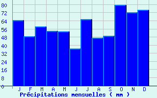 | Jan | Fev | Mars | Avr | Mai | Juin | Juil | Aout | Sept | Oct | Nov | Dec | Année | | Temp. max. (°C) | 8 | 9.8 | 12.9 | 16.4 | 19.9 | 24.2 | 25.5 | 25.2 | 22.3 | 17.3 | 11.7 | 8.1 | 16.8 | | Temp. moy. (°C) | 5 | 6 | 8.3 | 11.1 | 14.6 | 18.3 | 19.6 | 19.4 | 16.5 | 13 | 8.2 | 4.9 | 12.1 | | Temp. min. (°C) | 1.9 | 2.1 | 3.7 | 5.7 | 9.3 | 12.4 | 13.7 | 13.5 | 10.7 | 8.7 | 4.7 | 1.7 | 7.4 | | Jan | Fev | Mars | Avr | Mai | Juin | Juil | Aout | Sept | Oct | Nov | Dec | Année | | Jours Tx > 30°C | 0 | 0 | 0 | 0 | 0.5 | 2.8 | 5 | 3.6 | 1.8 | 0 | 0 | 0 | 13.7 | | Jours Tx > 25°C | 0 | 0 | 0 | 0.8 | 3.5 | 11.9 | 16 | 13.8 | 6.3 | 0.5 | 0 | 0 | 52.8 | | Jours Tx < 0°C | 0.8 | 0.4 | 0 | 0 | 0 | 0 | 0 | 0 | 0 | 0 | 0.1 | 0.3 | 1.6 | | Jours Tn < 0°C | 11.2 | 10.6 | 6.6 | 1.2 | 0.1 | 0 | 0 | 0 | 0 | 1.3 | 4.6 | 12.1 | 47.5 | | Jours Tn < -5°C | 2.6 | 1.4 | 0.5 | 0 | 0 | 0 | 0 | 0 | 0 | 0 | 0.5 | 2.2 | 7.2 | | Jours Tn < -10°C | 0.1 | 0 | 0.1 | 0 | 0 | 0 | 0 | 0 | 0 | 0 | 0 | 0 | 0.2 | | | | Jan | Fev | Mars | Avr | Mai | Juin | Juil | Aout | Sept | Oct | Nov | Dec | Année | | RR mensuel (mm) | 64.5 | 48.4 | 58.4 | 53.7 | 53.2 | 36.4 | 65.4 | 47.3 | 49.2 | 79.7 | 72.4 | 74.6 | 703.2 | | Jan | Fev | Mars | Avr | Mai | Juin | Juil | Aout | Sept | Oct | Nov | Dec | Année | | Jours RR > 1mm | 11.6 | 8.7 | 10.4 | 9.3 | 9.7 | 5.9 | 7.8 | 8.3 | 7 | 11.8 | 11.7 | 11.7 | 113.8 | | Jours RR > 5mm | 4.5 | 3.4 | 4.6 | 4.1 | 3.4 | 2.2 | 3.9 | 2.8 | 3.3 | 5.6 | 4.6 | 5.5 | 47.7 | | Jours RR > 10mm | 1.7 | 1.4 | 1.3 | 1 | 1.7 | 0.8 | 2.5 | 1.3 | 1.4 | 2.7 | 2.3 | 2.5 | 20.6 | | | | Jan | Fev | Mars | Avr | Mai | Juin | Juil | Aout | Sept | Oct | Nov | Dec | Année | | Vent moyen (km/h) | 12.2 | 12.6 | 13 | 11.9 | 11.2 | 10.4 | 10.4 | 9.4 | 9.4 | 10.4 | 10.8 | 12.2 | 11.2 | | Jan | Fev | Mars | Avr | Mai | Juin | Juil | Aout | Sept | Oct | Nov | Dec | Année | | Jours rafales >= 58km/h | 4.1 | 4.4 | 4 | 3.3 | 2.7 | 1.4 | 1.9 | 0.8 | 0.9 | 2.3 | 2.5 | 3.8 | 32 | | Jours rafales >= 100km/h | 0.1 | 0.3 | 0 | 0 | 0 | 0 | 0.1 | 0 | 0 | 0 | 0 | 0.1 | 0.5 |