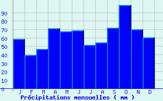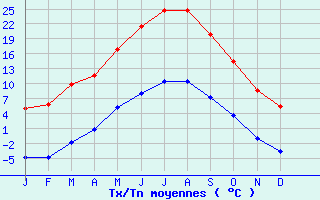 | Jan | Fev | Mars | Avr | Mai | Juin | Juil | Aout | Sept | Oct | Nov | Dec | Année | | Temp. max. (°C) | 5 | 5.9 | 9.8 | 11.6 | 16.9 | 21.4 | 24.8 | 24.6 | 19.8 | 14.4 | 8.6 | 5.5 | 14.1 | | Temp. moy. (°C) | 0.1 | 0.6 | 4 | 6.2 | 11 | 14.8 | 17.7 | 17.5 | 13.5 | 9 | 3.8 | 1 | 8.3 | | Temp. min. (°C) | -4.8 | -4.7 | -1.7 | 0.9 | 5.2 | 8.1 | 10.5 | 10.4 | 7.2 | 3.7 | -1 | -3.6 | 2.6 | | Jan | Fev | Mars | Avr | Mai | Juin | Juil | Aout | Sept | Oct | Nov | Dec | Année | | Jours Tx > 30°C | 0 | 0 | 0 | 0 | 0 | 0.7 | 2 | 1.5 | 0 | 0 | 0 | 0 | 4.2 | | Jours Tx > 25°C | 0 | 0 | 0 | 0 | 0.8 | 7.3 | 17.1 | 15.6 | 3.2 | 0.2 | 0 | 0 | 44.2 | | Jours Tx < 0°C | 3.8 | 3.6 | 0.6 | 0 | 0 | 0 | 0 | 0 | 0 | 0 | 0.6 | 3 | 11.6 | | Jours Tn < 0°C | 29.2 | 25.6 | 21 | 11.8 | 1.3 | 0.2 | 0 | 0 | 0.4 | 4.4 | 18.2 | 26.9 | 139 | | Jours Tn < -5°C | 13.6 | 11.7 | 6 | 0.7 | 0 | 0 | 0 | 0 | 0 | 0.2 | 3.7 | 9.8 | 45.7 | | Jours Tn < -10°C | 2.2 | 3.6 | 0.6 | 0 | 0 | 0 | 0 | 0 | 0 | 0 | 0.4 | 1.6 | 8.4 | | | | Jan | Fev | Mars | Avr | Mai | Juin | Juil | Aout | Sept | Oct | Nov | Dec | Année | | RR mensuel (mm) | 58.5 | 39.3 | 46.8 | 71.3 | 67.3 | 68.9 | 51.5 | 54.4 | 72 | 99 | 69.9 | 60.2 | 759.1 | | Jan | Fev | Mars | Avr | Mai | Juin | Juil | Aout | Sept | Oct | Nov | Dec | Année | | Jours RR > 1mm | 6.9 | 5.2 | 5.8 | 8.6 | 9.4 | 8.7 | 6.9 | 6.9 | 6.8 | 9.6 | 7 | 7.2 | 89 | | Jours RR > 5mm | 3.6 | 2.8 | 3 | 4.5 | 4.1 | 4.4 | 3.5 | 3.7 | 3.7 | 6 | 3.8 | 3.7 | 46.7 | | Jours RR > 10mm | 2.1 | 1.3 | 1.4 | 2.4 | 1.9 | 2.3 | 1.6 | 1.5 | 2.4 | 3.4 | 2.1 | 2.2 | 24.4 | | | | Jan | Fev | Mars | Avr | Mai | Juin | Juil | Aout | Sept | Oct | Nov | Dec | Année | | Vent moyen (km/h) | 0 | 0 | 0 | 0 | 0 | 0 | 0 | 0 | 0 | 0 | 0 | 0 | 0 | | Jan | Fev | Mars | Avr | Mai | Juin | Juil | Aout | Sept | Oct | Nov | Dec | Année | | Jours rafales >= 58km/h | 0.6 | 0.3 | 1.1 | 1.6 | 0.5 | 0.6 | 0.5 | -- | -- | 0.2 | 0.6 | -- | -- | | Jours rafales >= 100km/h | 0 | 0 | 0 | 0 | 0 | 0 | 0 | -- | -- | 0 | 0 | -- | -- | | | | Jan | Fev | Mars | Avr | Mai | Juin | Juil | Aout | Sept | Oct | Nov | Dec | Année | | Ensoleillement (heures) | 149.7 | 164.8 | 207.4 | 180.9 | 207.6 | 232.7 | 253.7 | 230.1 | 192.2 | 156.6 | 130.8 | 126.2 | 2232.6 |