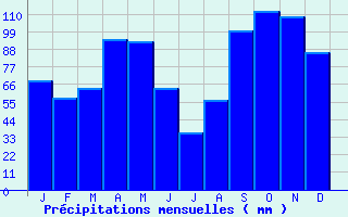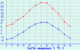 | Jan | Fev | Mars | Avr | Mai | Juin | Juil | Aout | Sept | Oct | Nov | Dec | Année | | Temp. max. (°C) | 6.4 | 8.1 | 11.7 | 14.9 | 20 | 24.6 | 27.2 | 26.8 | 21.9 | 17.1 | 10 | 6.3 | 16.3 | | Temp. moy. (°C) | 0.4 | 1.7 | 5.1 | 8.1 | 12.6 | 16.3 | 18.4 | 18.2 | 14.2 | 10.3 | 4.4 | 1 | 9.3 | | Temp. min. (°C) | -5.6 | -4.7 | -1.6 | 1.2 | 5.2 | 8.1 | 9.6 | 9.6 | 6.4 | 3.5 | -1.2 | -4.4 | 2.2 | | Jan | Fev | Mars | Avr | Mai | Juin | Juil | Aout | Sept | Oct | Nov | Dec | Année | | Jours Tx > 30°C | 0 | 0 | 0 | 0 | 0.3 | 4.6 | 10 | 8.1 | 0.8 | 0 | 0 | 0 | 23.8 | | Jours Tx > 25°C | 0 | 0 | 0 | 0.3 | 4.1 | 15.3 | 21.7 | 21.2 | 9.5 | 0.8 | 0 | 0 | 72.9 | | Jours Tx < 0°C | 2.6 | 1.6 | 0.2 | 0 | 0 | 0 | 0 | 0 | 0 | 0 | 0.6 | 1.9 | 7 | | Jours Tn < 0°C | 26.5 | 22.9 | 20.6 | 10.8 | 1.7 | 0.4 | 0 | 0 | 1.1 | 6.6 | 18.8 | 24.4 | 133.7 | | Jours Tn < -5°C | 16.9 | 13.4 | 6.7 | 0.7 | 0 | 0 | 0 | 0 | 0 | 0.7 | 6 | 13.9 | 58.3 | | Jours Tn < -10°C | 6.8 | 3.4 | 0.6 | 0 | 0 | 0 | 0 | 0 | 0 | 0 | 1.4 | 4.8 | 17 | | | | Jan | Fev | Mars | Avr | Mai | Juin | Juil | Aout | Sept | Oct | Nov | Dec | Année | | RR mensuel (mm) | 68.2 | 57.6 | 63.3 | 94.5 | 92.6 | 63.7 | 35.6 | 55.9 | 99.7 | 112.2 | 108.6 | 85.7 | 937.6 | | Jan | Fev | Mars | Avr | Mai | Juin | Juil | Aout | Sept | Oct | Nov | Dec | Année | | Jours RR > 1mm | 7.9 | 5.9 | 7.9 | 9.8 | 9.7 | 6.6 | 5.6 | 7.2 | 6.5 | 8.6 | 9.6 | 8.1 | 93.6 | | Jours RR > 5mm | 4.2 | 3.2 | 4.3 | 5.4 | 5.6 | 3.8 | 2.4 | 3.6 | 4.5 | 6.1 | 5.7 | 5.1 | 53.9 | | Jours RR > 10mm | 2.3 | 2.4 | 2.5 | 3.5 | 3.2 | 2.1 | 0.9 | 2 | 3.4 | 3.8 | 3.5 | 3 | 32.6 | | | | Jan | Fev | Mars | Avr | Mai | Juin | Juil | Aout | Sept | Oct | Nov | Dec | Année | | Vent moyen (km/h) | 6.5 | 7.6 | 8.6 | 8.3 | 7.2 | 7.2 | 7.6 | 6.8 | 5.8 | 5.4 | 7.2 | 6.5 | 7.2 | | Jan | Fev | Mars | Avr | Mai | Juin | Juil | Aout | Sept | Oct | Nov | Dec | Année | | Jours rafales >= 58km/h | 5.5 | 5.7 | 6.6 | 4.6 | 3.9 | -- | 3.2 | 3 | 3.2 | 3.5 | -- | 5.2 | -- | | Jours rafales >= 100km/h | 0 | 0.2 | 0.1 | 0.1 | 0 | -- | 0 | 0.1 | 0 | 0.1 | -- | 0.1 | -- |