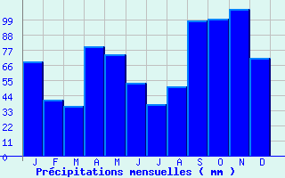 | Jan | Fev | Mars | Avr | Mai | Juin | Juil | Aout | Sept | Oct | Nov | Dec | Année | | Temp. max. (°C) | 7.3 | 10.5 | 15.2 | 17.8 | 22.9 | 27.7 | 30.4 | 29.7 | 24 | 18.9 | 11.8 | 7 | 18.6 | | Temp. moy. (°C) | 2.1 | 4.2 | 8.1 | 10.8 | 15.5 | 19.6 | 22 | 21.5 | 16.8 | 12.5 | 6.5 | 2.4 | 11.9 | | Temp. min. (°C) | -3 | -2.1 | 1 | 3.9 | 8.2 | 11.5 | 13.6 | 13.3 | 9.5 | 6.2 | 1.2 | -2.1 | 5.1 | | Jan | Fev | Mars | Avr | Mai | Juin | Juil | Aout | Sept | Oct | Nov | Dec | Année | | Jours Tx > 30°C | 0 | 0 | 0 | 0.1 | 1.4 | 10.4 | 19.1 | 15.4 | 2.2 | 0 | 0 | 0 | 48.6 | | Jours Tx > 25°C | 0 | 0 | 0.3 | 1.4 | 10.3 | 21.7 | 28.2 | 27.3 | 13.1 | 1.6 | 0 | 0 | 103.9 | | Jours Tx < 0°C | 0.7 | 0.2 | 0 | 0 | 0 | 0 | 0 | 0 | 0 | 0 | 0 | 0.6 | 1.5 | | Jours Tn < 0°C | 22.8 | 20.3 | 13.3 | 3.1 | 0.1 | 0 | 0 | 0 | 0 | 1.6 | 13 | 20.7 | 94.9 | | Jours Tn < -5°C | 10.7 | 6.4 | 1.4 | 0 | 0 | 0 | 0 | 0 | 0 | 0 | 2.2 | 7.8 | 28.5 | | Jours Tn < -10°C | 1.7 | 0.8 | 0.1 | 0 | 0 | 0 | 0 | 0 | 0 | 0 | 0.2 | 1.1 | 4 | | | | Jan | Fev | Mars | Avr | Mai | Juin | Juil | Aout | Sept | Oct | Nov | Dec | Année | | RR mensuel (mm) | 68.6 | 40.6 | 36 | 79.7 | 73.5 | 53 | 37.4 | 50.4 | 98.1 | 99.6 | 107 | 71.3 | 815.2 | | Jan | Fev | Mars | Avr | Mai | Juin | Juil | Aout | Sept | Oct | Nov | Dec | Année | | Jours RR > 1mm | 6.7 | 4.8 | 5.3 | 8.3 | 8.6 | 5.5 | 4.4 | 5.6 | 6.6 | 7.6 | 8.3 | 7.7 | 79.5 | | Jours RR > 5mm | 3.8 | 2.4 | 2.4 | 4.5 | 4.6 | 3 | 2.3 | 2.8 | 4.4 | 4.7 | 4.8 | 3.8 | 43.7 | | Jours RR > 10mm | 1.9 | 1.5 | 0.8 | 2.8 | 2.5 | 1.6 | 1.2 | 1.8 | 3 | 3.2 | 3.1 | 2.4 | 25.9 | | | | Jan | Fev | Mars | Avr | Mai | Juin | Juil | Aout | Sept | Oct | Nov | Dec | Année | | Vent moyen (km/h) | 7.6 | 9.4 | 10.8 | 10.4 | 9 | 9.4 | 9.7 | 9 | 8.3 | 7.2 | 7.9 | 7.6 | 9 | | Jan | Fev | Mars | Avr | Mai | Juin | Juil | Aout | Sept | Oct | Nov | Dec | Année | | Jours rafales >= 58km/h | 4.3 | 4.4 | 4.9 | 4.4 | 3.5 | 3.1 | -- | 3.5 | 2.9 | 2.5 | 4 | 3.2 | -- | | Jours rafales >= 100km/h | 0 | 0 | 0 | 0 | 0.1 | 0 | -- | 0.1 | 0 | 0.1 | 0.1 | 0.1 | -- |