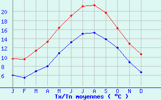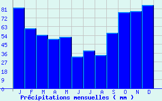 | Jan | Fev | Mars | Avr | Mai | Juin | Juil | Aout | Sept | Oct | Nov | Dec | Année | | Temp. max. (°C) | 9.7 | 9.5 | 11.4 | 13.4 | 16.4 | 19.1 | 21.1 | 21.4 | 19.7 | 16.3 | 12.9 | 10.6 | 15.2 | | Temp. moy. (°C) | 7.9 | 7.5 | 9.1 | 10.7 | 13.6 | 16.2 | 18.1 | 18.3 | 16.8 | 14.2 | 10.9 | 8.6 | 12.7 | | Temp. min. (°C) | 6 | 5.5 | 6.9 | 8 | 10.9 | 13.3 | 15.1 | 15.3 | 13.9 | 12 | 8.9 | 6.7 | 10.2 | | Jan | Fev | Mars | Avr | Mai | Juin | Juil | Aout | Sept | Oct | Nov | Dec | Année | | Jours Tx > 30°C | 0 | 0 | 0 | 0 | 0 | 0.1 | 0.5 | 0.2 | 0 | 0 | 0 | 0 | 0.9 | | Jours Tx > 25°C | 0 | 0 | 0 | 0 | 0.6 | 1.9 | 4.1 | 3 | 1 | 0 | 0 | 0 | 10.7 | | Jours Tx < 0°C | 0.3 | 0.1 | 0 | 0 | 0 | 0 | 0 | 0 | 0 | 0 | 0 | 0 | 0.4 | | Jours Tn < 0°C | 2.8 | 2.6 | 0.3 | 0 | 0 | 0 | 0 | 0 | 0 | 0 | 0 | 1.3 | 7 | | Jours Tn < -5°C | 0.3 | 0.1 | 0 | 0 | 0 | 0 | 0 | 0 | 0 | 0 | 0 | 0 | 0.4 | | Jours Tn < -10°C | 0 | 0 | 0 | 0 | 0 | 0 | 0 | 0 | 0 | 0 | 0 | 0 | 0 | | | | Jan | Fev | Mars | Avr | Mai | Juin | Juil | Aout | Sept | Oct | Nov | Dec | Année | | RR mensuel (mm) | 82 | 60.9 | 54.3 | 50.4 | 52.2 | 32.4 | 38.3 | 33.5 | 56.3 | 77.7 | 78.4 | 85 | 701.4 | | Jan | Fev | Mars | Avr | Mai | Juin | Juil | Aout | Sept | Oct | Nov | Dec | Année | | Jours RR > 1mm | 12.9 | 9.7 | 10 | 9.4 | 9.1 | 6.6 | 6.7 | 5.9 | 7.8 | 12.4 | 13.4 | 13.5 | 117.4 | | Jours RR > 5mm | 5.6 | 4.8 | 3.9 | 3.6 | 3.6 | 2 | 2.2 | 2.2 | 3.6 | 5.2 | 5.7 | 6.5 | 49 | | Jours RR > 10mm | 2.3 | 1.4 | 1.5 | 1.4 | 1.3 | 0.6 | 1 | 0.9 | 1.6 | 2.2 | 1.9 | 2.4 | 18.5 | | | | Jan | Fev | Mars | Avr | Mai | Juin | Juil | Aout | Sept | Oct | Nov | Dec | Année | | Vent moyen (km/h) | 27 | 24.8 | 23 | 23 | 21.6 | 20.2 | 19.4 | 18.4 | 20.2 | 24.1 | 25.9 | 27.4 | 23 | | Jan | Fev | Mars | Avr | Mai | Juin | Juil | Aout | Sept | Oct | Nov | Dec | Année | | Jours rafales >= 58km/h | 17.6 | 13.3 | 12.5 | 11.4 | 9.3 | 5.8 | 5.3 | 5.4 | 7.5 | 13.5 | 16.1 | 18 | 135.6 | | Jours rafales >= 100km/h | 3.5 | 1.9 | 0.9 | 0.6 | 0.3 | 0.1 | 0.1 | 0.2 | 0.4 | 1.3 | 1.6 | 2.8 | 13.8 |