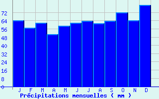 | Jan | Fev | Mars | Avr | Mai | Juin | Juil | Aout | Sept | Oct | Nov | Dec | Année | | Temp. max. (°C) | 4.8 | 6.5 | 11 | 15 | 19.5 | 22.7 | 25.3 | 24.8 | 20.4 | 15.1 | 9 | 5.5 | 15 | | Temp. moy. (°C) | 2.2 | 3.1 | 6.7 | 9.8 | 14.2 | 17.3 | 19.7 | 19.2 | 15.4 | 11.1 | 6.1 | 3.1 | 10.7 | | Temp. min. (°C) | -0.5 | -0.4 | 2.4 | 4.7 | 8.9 | 12 | 14 | 13.6 | 10.4 | 7.1 | 3.2 | 0.7 | 6.4 | | Jan | Fev | Mars | Avr | Mai | Juin | Juil | Aout | Sept | Oct | Nov | Dec | Année | | Jours Tx > 30°C | 0 | 0 | 0 | 0 | 0.3 | 2 | 5.5 | 4.4 | 0.3 | 0 | 0 | 0 | 12.5 | | Jours Tx > 25°C | 0 | 0 | 0 | 0.7 | 4.8 | 10 | 15.7 | 14.4 | 4.4 | 0.2 | 0 | 0 | 50.3 | | Jours Tx < 0°C | 5 | 2.6 | 0.1 | 0 | 0 | 0 | 0 | 0 | 0 | 0 | 0.6 | 3.2 | 11.5 | | Jours Tn < 0°C | 16.2 | 15.1 | 9.3 | 3.1 | 0.1 | 0 | 0 | 0 | 0 | 1.6 | 7.1 | 13.1 | 65.5 | | Jours Tn < -5°C | 5.3 | 4.5 | 0.8 | 0 | 0 | 0 | 0 | 0 | 0 | 0 | 1 | 3.1 | 14.7 | | Jours Tn < -10°C | 1.6 | 0.6 | 0 | 0 | 0 | 0 | 0 | 0 | 0 | 0 | 0 | 0.4 | 2.7 | | | | Jan | Fev | Mars | Avr | Mai | Juin | Juil | Aout | Sept | Oct | Nov | Dec | Année | | RR mensuel (mm) | 64.2 | 57.1 | 61.8 | 50.5 | 58.9 | 61.7 | 63.7 | 61.1 | 63.8 | 71.9 | 63.9 | 79.2 | 757.8 | | Jan | Fev | Mars | Avr | Mai | Juin | Juil | Aout | Sept | Oct | Nov | Dec | Année | | Jours RR > 1mm | 11.5 | 9.6 | 11.5 | 9.3 | 10.2 | 9.8 | 9.2 | 9.1 | 8.8 | 11 | 11.2 | 11.8 | 123 | | Jours RR > 5mm | 4.3 | 3.8 | 4.5 | 3.4 | 4.3 | 4.2 | 4.3 | 3.9 | 4 | 4.6 | 4.5 | 5.9 | 51.7 | | Jours RR > 10mm | 1.6 | 1.6 | 1.5 | 1.4 | 1.6 | 1.7 | 2.2 | 2 | 1.9 | 1.9 | 1.6 | 2.4 | 21.3 | | | | Jan | Fev | Mars | Avr | Mai | Juin | Juil | Aout | Sept | Oct | Nov | Dec | Année | | Vent moyen (km/h) | 12.6 | 12.2 | 12.2 | 11.5 | 10.8 | 10.1 | 9.7 | 9 | 9.4 | 10.1 | 10.8 | 11.9 | 10.8 | | Jan | Fev | Mars | Avr | Mai | Juin | Juil | Aout | Sept | Oct | Nov | Dec | Année | | Jours rafales >= 58km/h | 5.7 | 4.6 | 5.3 | 2.9 | 2.3 | 2 | 2.2 | 1.4 | 2 | 3.1 | 3.1 | 4.5 | 39.1 | | Jours rafales >= 100km/h | 0.3 | 0.4 | 0.2 | 0 | 0.1 | 0.1 | 0 | 0 | 0 | 0.1 | 0.1 | 0.1 | 1.4 | | | | Jan | Fev | Mars | Avr | Mai | Juin | Juil | Aout | Sept | Oct | Nov | Dec | Année | | Jours avec brouillard (*) | 5.2 | 3.9 | 2.6 | 2.2 | 2.1 | 1.6 | 0.9 | 1.8 | 4.9 | 8.3 | 6.1 | 4.8 | 44.5 | | Jours avec orage (*) | 0.1 | 0.4 | 0.5 | 1 | 3.2 | 4.4 | 4.2 | 3.8 | 1.8 | 0.7 | 0.1 | 0.1 | 20.4 | | Jours avec grêle (*) | 0.2 | 0.3 | 0.4 | 0.5 | 0.5 | 0.2 | 0.1 | 0 | 0 | 0.1 | 0.1 | 0.2 | 2.6 | | Jours avec neige (*) | 6 | 6.7 | 3.6 | 1 | 0 | 0 | 0 | 0 | 0 | 0 | 2.4 | 5.4 | 25 | | | | Jan | Fev | Mars | Avr | Mai | Juin | Juil | Aout | Sept | Oct | Nov | Dec | Année | | Ensoleillement (heures) | 53.6 | 77.6 | 125.8 | 178.1 | 201.6 | 218.6 | 225.6 | 213.1 | 158.1 | 98.4 | 48.5 | 41.3 | 1640.4 |