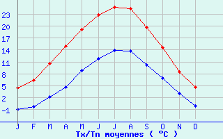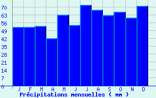 | Jan | Fev | Mars | Avr | Mai | Juin | Juil | Aout | Sept | Oct | Nov | Dec | Année | | Temp. max. (°C) | 4.4 | 6.4 | 10.5 | 14.9 | 19.2 | 22.8 | 24.8 | 24.3 | 19.6 | 14.6 | 8.4 | 4.6 | 14.6 | | Temp. moy. (°C) | 1.7 | 3.1 | 6.3 | 9.8 | 14 | 17.3 | 19.3 | 19 | 14.9 | 10.7 | 5.7 | 2.2 | 10.4 | | Temp. min. (°C) | -0.9 | -0.2 | 2.1 | 4.7 | 8.9 | 11.8 | 13.9 | 13.7 | 10.3 | 6.9 | 3 | -0.1 | 6.2 | | Jan | Fev | Mars | Avr | Mai | Juin | Juil | Aout | Sept | Oct | Nov | Dec | Année | | Jours Tx > 30°C | 0 | 0 | 0 | 0 | 0.2 | 1.6 | 4.5 | 3.4 | 0.1 | 0 | 0 | 0 | 9.7 | | Jours Tx > 25°C | 0 | 0 | 0 | 0.6 | 3.4 | 10.2 | 14.5 | 13.2 | 3.3 | 0.1 | 0 | 0 | 45.3 | | Jours Tx < 0°C | 6 | 2.1 | 0.2 | 0 | 0 | 0 | 0 | 0 | 0 | 0 | 0.8 | 4.4 | 13.4 | | Jours Tn < 0°C | 16.7 | 14.4 | 9.7 | 2.7 | 0.1 | 0 | 0 | 0 | 0 | 1.7 | 7.2 | 15.4 | 68 | | Jours Tn < -5°C | 6.4 | 3.7 | 1.5 | 0.1 | 0 | 0 | 0 | 0 | 0 | 0 | 1.1 | 4.6 | 17.5 | | Jours Tn < -10°C | 1.5 | 0.3 | 0.1 | 0 | 0 | 0 | 0 | 0 | 0 | 0 | 0.1 | 0.7 | 2.6 | | | | Jan | Fev | Mars | Avr | Mai | Juin | Juil | Aout | Sept | Oct | Nov | Dec | Année | | RR mensuel (mm) | 52.3 | 52.3 | 52.9 | 42 | 63.1 | 53.9 | 72.1 | 67.4 | 62.8 | 65.9 | 60.5 | 71.1 | 716.3 | | Jan | Fev | Mars | Avr | Mai | Juin | Juil | Aout | Sept | Oct | Nov | Dec | Année | | Jours RR > 1mm | 9.8 | 9.4 | 10.2 | 8.8 | 10.5 | 8.6 | 9.7 | 10.1 | 10 | 10.9 | 11.1 | 11.5 | 120.7 | | Jours RR > 5mm | 3.6 | 3.1 | 3.8 | 3.1 | 4.3 | 3.5 | 4.6 | 4.5 | 4.3 | 4.6 | 4.1 | 5 | 48.5 | | Jours RR > 10mm | 1 | 1.1 | 1.1 | 0.7 | 1.6 | 1.6 | 2.2 | 2.3 | 2 | 1.8 | 1.4 | 1.9 | 18.9 | | | | Jan | Fev | Mars | Avr | Mai | Juin | Juil | Aout | Sept | Oct | Nov | Dec | Année | | Vent moyen (km/h) | 18 | 17.3 | 16.9 | 14.8 | 13.3 | 12.6 | 13.3 | 13 | 14 | 15.5 | 15.8 | 17.6 | 15.1 | | Jan | Fev | Mars | Avr | Mai | Juin | Juil | Aout | Sept | Oct | Nov | Dec | Année | | Jours rafales >= 58km/h | -- | 5.7 | 5.9 | 3.8 | 3 | 2.6 | 3.7 | -- | -- | 3.9 | 4.1 | -- | -- | | Jours rafales >= 100km/h | -- | 0.2 | 0.1 | 0 | 0 | 0.1 | 0 | -- | -- | 0.1 | 0.1 | -- | -- |