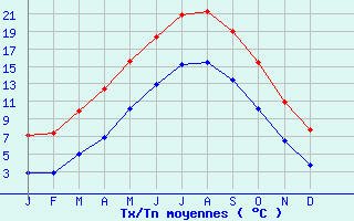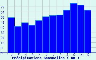 | Jan | Fev | Mars | Avr | Mai | Juin | Juil | Aout | Sept | Oct | Nov | Dec | Année | | Temp. max. (°C) | 7.1 | 7.4 | 9.9 | 12.4 | 15.6 | 18.4 | 20.9 | 21.3 | 19 | 15.4 | 10.9 | 7.8 | 13.9 | | Temp. moy. (°C) | 5 | 5.1 | 7.5 | 9.6 | 12.9 | 15.7 | 18.1 | 18.4 | 16.2 | 12.7 | 8.7 | 5.7 | 11.3 | | Temp. min. (°C) | 2.9 | 2.9 | 5 | 6.9 | 10.1 | 12.9 | 15.2 | 15.5 | 13.4 | 10.1 | 6.5 | 3.7 | 8.8 | | Jan | Fev | Mars | Avr | Mai | Juin | Juil | Aout | Sept | Oct | Nov | Dec | Année | | Jours Tx > 30°C | 0 | 0 | 0 | 0 | 0 | 0.3 | 0.5 | 0.5 | 0.1 | 0 | 0 | 0 | 1.4 | | Jours Tx > 25°C | 0 | 0 | 0 | 0 | 0.7 | 1.4 | 2.9 | 3 | 1.4 | 0.1 | 0 | 0 | 9.5 | | Jours Tx < 0°C | 1.6 | 0.8 | 0.1 | 0 | 0 | 0 | 0 | 0 | 0 | 0 | 0.1 | 0.7 | 3.3 | | Jours Tn < 0°C | 6.6 | 6.4 | 1.5 | 0.1 | 0 | 0 | 0 | 0 | 0 | 0 | 1.6 | 5.8 | 22.1 | | Jours Tn < -5°C | 1.6 | 0.8 | 0 | 0 | 0 | 0 | 0 | 0 | 0 | 0 | 0.1 | 0.6 | 3.1 | | Jours Tn < -10°C | 0.2 | 0 | 0 | 0 | 0 | 0 | 0 | 0 | 0 | 0 | 0 | 0 | 0.2 | | | | Jan | Fev | Mars | Avr | Mai | Juin | Juil | Aout | Sept | Oct | Nov | Dec | Année | | RR mensuel (mm) | 55 | 41.2 | 46.9 | 43.2 | 50.4 | 56.5 | 58.4 | 59.3 | 67 | 78 | 74.8 | 67.1 | 697.8 | | Jan | Fev | Mars | Avr | Mai | Juin | Juil | Aout | Sept | Oct | Nov | Dec | Année | | Jours RR > 1mm | 11.4 | 8.9 | 10.1 | 8.9 | 9.3 | 9.1 | 8.3 | 8.9 | 10.4 | 11.8 | 12.6 | 12 | 121.6 | | Jours RR > 5mm | 3.8 | 2.9 | 3.2 | 2.9 | 3.6 | 4 | 4.1 | 3.9 | 4.3 | 5.5 | 5 | 4.7 | 47.9 | | Jours RR > 10mm | 1.2 | 0.7 | 0.8 | 0.7 | 1 | 1.5 | 1.8 | 1.6 | 1.9 | 2.2 | 2 | 1.7 | 17.2 | | | | Jan | Fev | Mars | Avr | Mai | Juin | Juil | Aout | Sept | Oct | Nov | Dec | Année | | Vent moyen (km/h) | 25.2 | 24.1 | 23 | 21.6 | 20.5 | 19.8 | 19.8 | 19.4 | 20.5 | 21.6 | 22.3 | 23.4 | 21.6 | | Jan | Fev | Mars | Avr | Mai | Juin | Juil | Aout | Sept | Oct | Nov | Dec | Année | | Jours rafales >= 58km/h | 14.9 | 11.5 | -- | -- | 8.7 | 5.8 | 6.3 | 6 | 7 | -- | 10.4 | 12.4 | -- | | Jours rafales >= 100km/h | 1.5 | 0.7 | -- | -- | 0.1 | 0 | 0 | 0 | 0 | -- | 0.3 | 0.6 | -- |